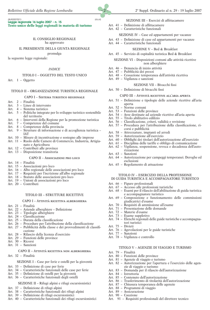Bollettino Ufficiale della Regione Lombardia [BUR2007021] Y –2– [4.6.4] Legge regionale 16 luglio 2007 - n. 15 Testo unico delle leggi regionali in materia di turismo IL CONSIGLIO REGIONALE ha approvato IL PRESIDENTE DELLA GIUNTA REGIONALE promulga la seguente legge regionale: INDICE Art. TITOLO I – OGGETTO DEL TESTO UNICO 1 – Oggetto TITOLO II – ORGANIZZAZIONE TURISTICA REGIONALE Art. 12 – Art. 13 – CAPO I – Sistema turistico regionale Finalità Linee di intervento Sistema turistico Politiche integrate per lo sviluppo turistico sostenibile del territorio Interventi della Regione per la promozione turistica Competenze del comune Competenze della provincia Strutture di informazione e di accoglienza turistica – IAT Misure di incentivazione e sostegno alle imprese Ruolo delle Camere di Commercio, Industria, Artigianato e Agricoltura Contributi alle province Disposizione transitoria Art. Art. Art. Art. Art. Art. Art. CAPO II – Associazioni pro loco Finalità Associazioni pro loco Albo regionale delle associazioni pro loco Requisiti per l’iscrizione all’albo regionale Statuto delle associazioni pro loco Unioni di associazioni pro loco Contributi Art. Art. Art. Art. 2 3 4 5 – – – – Art. Art. Art. Art. 6 7 8 9 – – – – Art. 10 – Art. 11 – 14 15 16 17 18 19 20 – – – – – – – TITOLO III – STRUTTURE RICETTIVE Art. Art. Art. Art. Art. Art. Art. 21 22 23 24 25 26 27 Art. Art. Art. Art. 28 29 30 31 CAPO I – Attività ricettiva alberghiera Finalità Aziende alberghiere – Definizione Tipologie alberghiere Classificazione Durata della classificazione Procedure per l’attribuzione della classificazione Pubblicità della classe e dei provvedimenti di classificazione – Rilascio della licenza d’esercizio – Funzioni delle province – Ricorsi – Sanzioni – – – – – – – CAPO II – Attività ricettiva non alberghiera Art. 32 – Finalità Art. Art. Art. Art. SEZIONE I – Case per ferie e ostelli per la gioventù 33 – Definizione di case per ferie 34 – Caratteristiche funzionali delle case per ferie 35 – Definizione di ostelli per la gioventù 36 – Caratteristiche funzionali degli ostelli Art. Art. Art. Art. SEZIONE II – Rifugi alpini e rifugi escursionistici 37 – Definizione di rifugi alpini 38 – Caratteristiche funzionali dei rifugi alpini 39 – Definizione di rifugi escursionistici 40 – Caratteristiche funzionali dei rifugi escursionistici 2º Suppl. Ordinario al n. 29 - 19 luglio 2007 SEZIONE III – Esercizi di affittacamere Art. 41 – Definizione di affittacamere Art. 42 – Caratteristiche funzionali SEZIONE IV – Case ed appartamenti per vacanze Art. 43 – Definizione di case ed appartamenti per vacanze Art. 44 – Caratteristiche funzionali SEZIONE V – Bed & Breakfast Art. 45 – Servizio di ospitalità turistica Bed & Breakfast SEZIONE VI – Disposizioni comuni alle attività ricettive non alberghiere Art. 46 – Denuncia di inizio attività Art. 47 – Pubblicità dei prezzi Art. 48 – Cessazione temporanea dell’attività ricettiva Art. 49 – Vigilanza e sanzioni SEZIONE VII – Bivacchi fissi Art. 50 – Definizione di bivacchi fissi CAPO III – Attività ricettive all’aria aperta Art. 51 – Definizione e tipologie delle aziende ricettive all’aria aperta Art. 52 – Norme comuni Art. 53 – Funzioni delle province Art. 54 – Aree destinate ad aziende ricettive all’aria aperta Art. 55 – Titolo abilitativo edilizio Art. 56 – Classificazione, criteri, validità e revisione Art. 57 – Procedura per l’attribuzione della classificazione, ricorsi e pubblicità Art. 58 – Attrezzature, impianti ed arredi Art. 59 – Autorizzazione all’esercizio Art. 60 – Obblighi dei titolari dell’autorizzazione all’esercizio Art. 61 – Disciplina delle tariffe e obbligo di comunicazione Art. 62 – Vigilanza, sospensione, revoca e decadenza dell’autorizzazione Art. 63 – Sanzioni Art. 64 – Autorizzazione per campeggi temporanei. Deroghe ed esclusioni Art. 65 – Regolamento di attuazione TITOLO IV – ESERCIZIO DELLA PROFESSIONE DI GUIDA TURISTICA E ACCOMPAGNATORE TURISTICO Art. 66 – Figure professionali Art. 67 – Accesso alle professioni turistiche Art. 68 – Esami per il rilascio dell’abilitazione di guida turistica e accompagnatore turistico Art. 69 – Composizione e funzionamento delle commissioni giudicatrici d’esame Art. 70 – Requisiti di ammissione all’esame Art. 71 – Presentazione delle domande Art. 72 – Materie d’esame Art. 73 – Esame suppletivo Art. 74 – Elenchi regionali delle guide turistiche e accompagnatori turistici Art. 75 – Divieti Art. 76 – Agevolazioni per le guide turistiche Art. 77 – Sanzioni Art. 78 – Vigilanza e controllo Art. Art. Art. Art. Art. Art. Art. Art. Art. Art. Art. Art. Art. TITOLO V – AGENZIE DI VIAGGIO E TURISMO 79 – Finalità 80 – Funzioni delle province 81 – Agenzie di viaggio e turismo 82 – Autorizzazione per l’apertura e l’esercizio delle agenzie di viaggio e turismo 83 – Domanda per il rilascio dell’autorizzazione 84 – Istruttoria 85 – Contenuto dell’autorizzazione 86 – Trasferimento di titolarità dell’autorizzazione 87 – Chiusura temporanea delle agenzie 88 – Programmi di viaggio 89 – Assicurazione 90 – Cauzione 91 – Requisiti professionali del direttore tecnico Bollettino Ufficiale della Regione Lombardia Art. Art. Art. Art. 92 93 94 95 – – – – Art. Art. Art. Art. 96 97 98 99 – – – – Y –3– Esame di idoneità e commissione d’esame Registro regionale dei direttori tecnici Uffici di biglietteria Associazioni senza scopo di lucro, enti locali e istituti scolastici Sodalizi, gruppi sociali e comunità Vigilanza Sospensione, revoca e decadenza dell’autorizzazione Sanzioni pecuniarie 2º Suppl. Ordinario al n. 29 - 19 luglio 2007 TITOLO I OGGETTO DEL TESTO UNICO Art. 1 (Oggetto) 1. Il presente testo unico, redatto ai sensi della legge regionale 9 marzo 2
