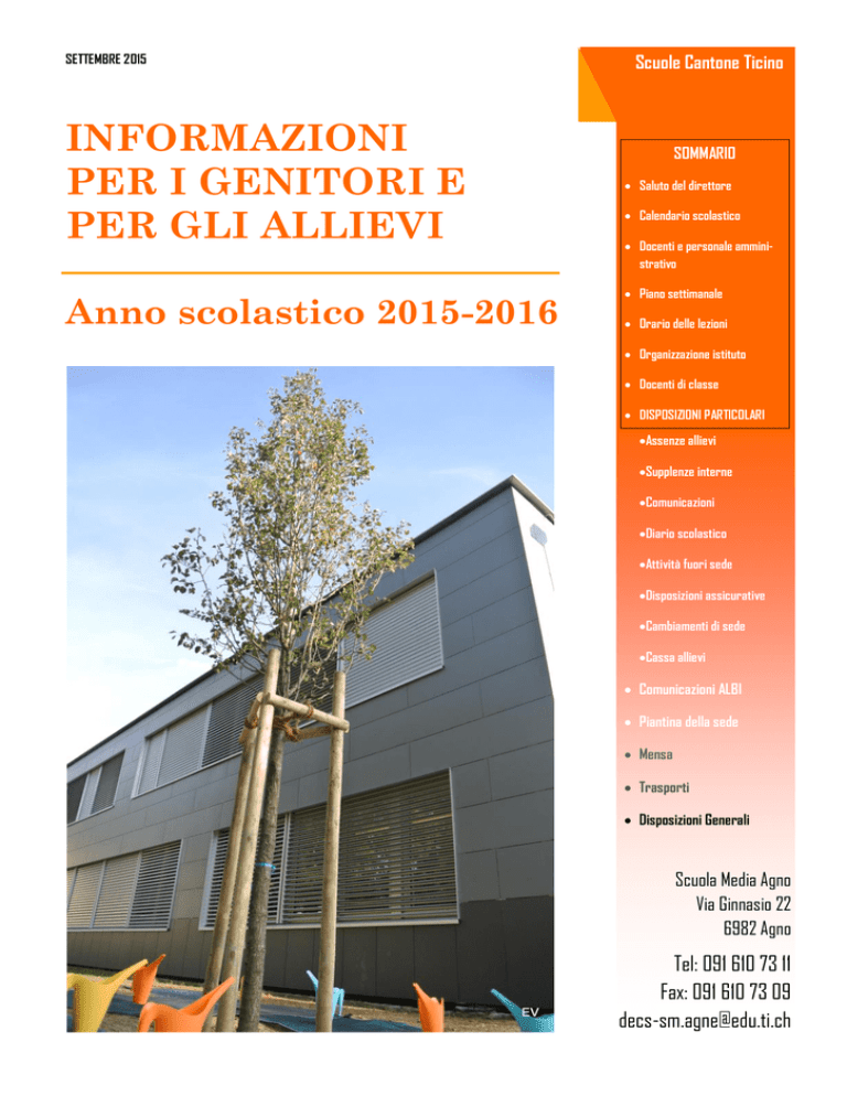 SETTEMBRE 2015 INFORMAZIONI PER I GENITORI E PER GLI ALLIEVI Anno scolastico 2015-2016 Scuole Cantone Ticino SOMMARIO Saluto del direttore Calendario scolastico Docenti e personale amministrativo Piano settimanale Orario delle lezioni Organizzazione istituto Docenti di classe DISPOSIZIONI PARTICOLARI Assenze allievi Supplenze interne Comunicazioni Diario scolastico Attività fuori sede Disposizioni assicurative Cambiamenti di sede Cassa allievi Comunicazioni ALBI Piantina della sede Mensa Trasporti Disposizioni Generali Scuola Media Agno Via Ginnasio 22 6982 Agno Tel: 091 610 73 11 Fax: 091 610 73 09 [email protected] Saluto del direttore Cari allievi, cari genitori, in occasione dell’inizio di questo nuovo anno scolastico desidero rivolgevi un caro saluto e i migliori auguri per un sereno e proficuo lavoro. L’inizio di un nuovo anno scolastico rappresenta un momento importante per tutti i giovani e per l’intera comunità scolastica, si rinnova un periodo di intensa formazione che contribuirà in maniera determinante all’educazione e alla crescita dei futuri cittadini. Eccoci di nuovo ai nastri di partenza, fra mille pensieri e tante emozioni. I lidi lasciano spazio a un periodo di lavoro, di fatica, dove si studia e si ricevono delle valutazioni, ma anche un periodo dove si ritrovano vecchie amicizie e se ne stringono molte nuove, dove si conosce e si impara, dove si ride e talvolta si soffre: il quotidiano. Fate buon uso di questo tempo! Assaporate con interesse e curiosità il gusto della conoscenza, partecipate con impegno ed entusiasmo alla vita scolastica, considerate la scuola come uno dei luoghi importanti ed indispensabili per la vostra crescita; state preparando il vostro futuro vivendo intensamente il presente! In questo viaggio lungo un anno la collaborazione e l'impegno comune di tutte le parti in causa, dalle istituzioni alle famiglie, dai docenti agli allievi, è sicuramente la formula migliore perché l'anno scolastico possa svolgersi nel migliore dei modi e raggiungere gli obiettivi prefissati. Insieme, ognuno per le proprie competenze, sapremo collaborare, consapevoli dell'importanza e della responsabilità del compito a cui tutti siamo chiamati: formare i futuri cittadini che siano capaci di affrontare le sfide quotidiane della vita e che siano parte integrante e fondamentale della società. Che quest’avventura straordinaria continui, buona Scuola a tutti! Per il Consiglio di Direzione Mauro Zappa Pagina 4 Attività Vacanze (decisione del Consiglio di Stato) Riunioni Info genitori CALENDARIO SCOLASTICO 31 agosto Inizio anno scolastico 07/08 settembre Uscita con docente di classe (21 riserva) 14-18 settembre Corso polisportivo Tenero 2 turni da 3 giorni classi III 06 e 08 ottobre serata genitori verrà trasmessa comunicazione classi I 13 ottobre Orientamento verrà trasmessa comunicazione classi IV 20 ottobre Uscita Arosio (3.11 risevera) classi I Da definire Uscita di studio a Lucerna classi IV 24.10—01.11.2015 Vacanze autunnali 9 novembre Attività protezione www classi II 9-17 novembre Corso Musicale Arzo 3 turni da 2 giorni classi I Da definire Educazione stradale classi III 01 dicembre Genitori III-Orientamento verrà trasmessa comunicazione 01 dicembre Orientamento allievi IV 07 dicembre Vacanza “ponte” 11 dicembre Notte del racconto 24.12.2015-06.01.2016 Vacanze Invernali classi I su iscrizione classi I Pagina 5 22 gennaio Fine primo periodo Invio giudizio semestrale alle famiglie 05 febbraio Festa di Carnevale 06-14.febbraio Vacanze di Carnevale 15.02-26.02 Corso polisportivo invernale 2 turni classi IV 1-4.marzo Ed. alla scelta orientamento classi III 8 marzo serata genitori classi II verrà trasmessa comunicazione 7-12 marzo Espoprofessioni 24 marzo Vacanze “ponte” 25.03-03.04 Vacanze di Pasqua 11-15 aprile Festival delle lingue classi IV 12o13 aprile stage classi III Da definire Uscita Augusta Raurica latinisti 02-04 maggio Uscita in Svizzera classi II 06 maggio Vacanza “ponte” 27 maggio Vacanza “ponte” 19-29 maggio Prove Cantonali 16 giugno Uscita fine anno 17 giugno Fine anno scolastico tutti Per le riunioni e gli incontri informativi con le famiglie, indicazioni dettagliate verranno trasmesse a tempo debito. o su r e b eb e Potr are dell a r bent he nel c ific lle mod ario de lend ività. att DOCENTI E PERSONALE AMMINISTRATIVO Pagina 6 Docenti Arti Plastiche BCL Baccianti Loredana GHM Ghiraldi Massimo italiano MLE Milanese Elena MNN Monti Naike PDR Pedrazzini Renata PVA Peverelli Andrea SLD Sala Desirée Att. Comm. Differenzaz. curricolare MRM Merlini Manuela BCL LSC Baccianti Loredana Leoni Salem Cristina Latino Ed. Fisica Ed. Musicale Francese Geografia AVD Avilès Daniela Frezza Antonella Luraschi Carmen Meoli Mirko Oehen Fabian Pacciorini Rocco Pfyffer Gianocca Lara Polgatti Chiara Scapinelli Valeria Zappa Mauro Religione MCC CFA CAT BPR Michel Christine Cefan Anca Don Cattaneo Carlo Beretta Piccoli Raffaele Beretta Piccoli Raffaele Croci Andrea Demarta Daniele Röthlisberger Giulia Tettamanti Viola Scienze BRB GVM MRD VLL Bertolini Barbara Giovanettina Michele Mariani Davide Valli Lorenzo Lavezzo Cristina Moor Tamara von Arx Cinzia Tedesco BRC CHG FRM MRC Brazzale Claudia Chinotti Gea Ferrari Marisa Marguccio Cosima AGA Agnoletto Antonio SLA Sala Ambrogio TMR Tami Renato WBP Weber Patrick GBB Gubitosa Beniamino KLV Keller Nappi Véronique MRI Marino Isabella MRT Moor Tamara BSF Boschetti Fabio PZP Pozzi Paola VRC Varonier Chantal BPR CRA DMD RTG TTV Anzalone Lavinia Avilès Daniela Boschetti Fabio Chiaruttini Stefania Crivelli Gisella Guarneri Katia Lavezzo Cristina Müller Matteo Pozzi Rüegger Paola FRA LRC MLM OHF PCR PFL PLC SCV ZPM Matematica Ed. alime. ANL AVD BSF CHS CRG GRK LVC MUM PZP Storia Inglese LVC MRT VNC Pagina 7 Docenti di sostegno LSC TMN Leoni Salem Cristina Tamburini Nicola BRA Bernasconi Alessandra 091 610 73 32 [email protected] 091 610 73 25 [email protected] 091 610 73 26 [email protected] Direzione 