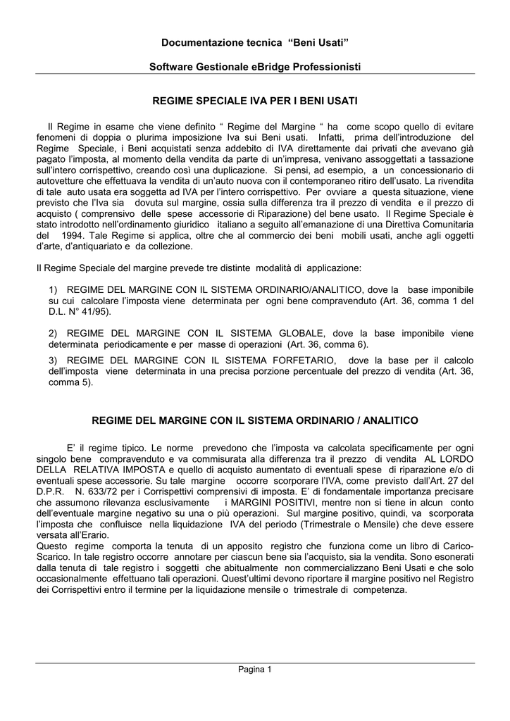 Documentazione tecnica “Beni Usati” Software Gestionale eBridge Professionisti REGIME SPECIALE IVA PER I BENI USATI Il Regime in esame che viene definito “ Regime del Margine “ ha come scopo quello di evitare fenomeni di doppia o plurima imposizione Iva sui Beni usati. Infatti, prima dell’introduzione del Regime Speciale, i Beni acquistati senza addebito di IVA direttamente dai privati che avevano già pagato l’imposta, al momento della vendita da parte di un’impresa, venivano assoggettati a tassazione sull’intero corrispettivo, creando così una duplicazione. Si pensi, ad esempio, a un concessionario di autovetture che effettuava la vendita di un’auto nuova con il contemporaneo ritiro dell’usato. La rivendita di tale auto usata era soggetta ad IVA per l’intero corrispettivo. Per ovviare a questa situazione, viene previsto che l’Iva sia dovuta sul margine, ossia sulla differenza tra il prezzo di vendita e il prezzo di acquisto ( comprensivo delle spese accessorie di Riparazione) del bene usato. Il Regime Speciale è stato introdotto nell’ordinamento giuridico italiano a seguito all’emanazione di una Direttiva Comunitaria del 1994. Tale Regime si applica, oltre che al commercio dei beni mobili usati, anche agli oggetti d’arte, d’antiquariato e da collezione. Il Regime Speciale del margine prevede tre distinte modalità di applicazione: 1) REGIME DEL MARGINE CON IL SISTEMA ORDINARIO/ANALITICO, dove la base imponibile su cui calcolare l’imposta viene determinata per ogni bene compravenduto (Art. 36, comma 1 del D.L. N° 41/95). 2) REGIME DEL MARGINE CON IL SISTEMA GLOBALE, dove la base imponibile viene determinata periodicamente e per masse di operazioni (Art. 36, comma 6). 3) REGIME DEL MARGINE CON IL SISTEMA FORFETARIO, dove la base per il calcolo dell’imposta viene determinata in una precisa porzione percentuale del prezzo di vendita (Art. 36, comma 5). REGIME DEL MARGINE CON IL SISTEMA ORDINARIO / ANALITICO E’ il regime tipico. Le norme prevedono che l’imposta va calcolata specificamente per ogni singolo bene compravenduto e va commisurata alla differenza tra il prezzo di vendita AL LORDO DELLA RELATIVA IMPOSTA e quello di acquisto aumentato di eventuali spese di riparazione e/o di eventuali spese accessorie. Su tale margine occorre scorporare l’IVA, come previsto dall’Art. 27 del D.P.R. N. 633/72 per i Corrispettivi comprensivi di imposta. E’ di fondamentale importanza precisare che assumono rilevanza esclusivamente i MARGINI POSITIVI, mentre non si tiene in alcun conto dell’eventuale margine negativo su una o più operazioni. Sul margine positivo, quindi, va scorporata l’imposta che confluisce nella liquidazione IVA del periodo (Trimestrale o Mensile) che deve essere versata all’Erario. Questo regime comporta la tenuta di un apposito registro che funziona come un libro di CaricoScarico. In tale registro occorre annotare per ciascun bene sia l’acquisto, sia la vendita. Sono esonerati dalla tenuta di tale registro i soggetti che abitualmente non commercializzano Beni Usati e che solo occasionalmente effettuano tali operazioni. Quest’ultimi devono riportare il margine positivo nel Registro dei Corrispettivi entro il termine per la liquidazione mensile o trimestrale di competenza. Pagina 1 Documentazione tecnica “Beni Usati” Software Gestionale eBridge Professionisti REGIME DEL MARGINE CON IL SISTEMA GLOBALE Questo regime si differenzia rispetto agli altri perché il margine non viene determinato per ogni singolo bene compravenduto, ma per masse di operazioni ovvero globalmente per tutte le vendite e tutti gli acquisti effettuati in ciascun mese o trimestre. Dall’eventuale margine positivo deve essere scorporata l’IVA a debito, mentre l’eventuale margine negativo costituisce un CREDITO DI MARGINE (e non di imposta) che può essere computato in aumento degli acquisti della determinazione del margine relativo al periodo d’imposta successivo. Per quanto riguarda la tenuta dei registri, il Regime del Margine con il sistema Globale prevede l’istituzione di due distinti registri, uno per gli acquisti e l’altro per le vendite, sui quali vanno annotate le relative operazioni riguardanti i Beni Usati. REGIME DEL MARGINE CON IL SISTEMA FORFETARIO Il regime forfetario costituisce una semplificazione del regime del margine. Il sistema forfetario si applica solo a determinate categorie di soggetti (agevolazioni soggettive per il commercio ambulante) e per la vendita di particolari prodotti (agevolazioni oggettive per le opere d’arte e i prodotti editoriali non di antiquariato). La base imponibile nel sistema forfetario è costituita da un PERCENTUALE DEL PREZZO DI VENDITA. Con tale sistema si ha sempre un margine positivo e un’imposta da versare all’Erario. Per le cessioni di oggetti d’arte il cui prezzo di acquisto manca ovvero è privo di rilevanza o non è determinabile, la base imponibile è pari al 60 % del prezzo di vendita. I soggetti che esplicano l’attività di commercio esclusivamente in forma ambulante devono applicare un margine del 50 % del prezzo di vendita, ridotto al 25 % sia per le cessioni di prodotti editoriali di antiquariato, sia di prodotti editoriali non d’antiquariato. Il regime forfetario non prevede alcun registro particolare. A tal proposito è sufficiente annotare giornalmente i corrispettivi relativi alle vendite dei beni rientranti nel regime forfetario, nel Registro dei Corrispettivi in modo separato rispetto agli altri eventuali incassi relativi ad altre operazioni soggette ad IVA. Le fatture e i documenti di acquisto dei beni usati destinati alla rivendita, invece, vanno numerati e conservati senza obbligo di registrazione. Quelle sopra descritte sono le caratteristiche principali dei Regimi IVA previsti per i Beni Usati. La Gestione “Regime Speciale IVA per i Beni Usati” è stata studiata per adeguare i moduli contabili della linea eBridge alle novità legislative appena delineate.
