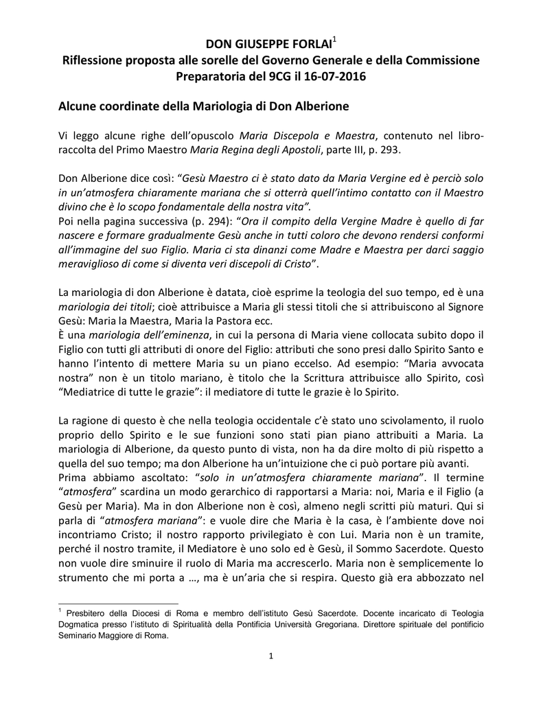 DON GIUSEPPE FORLAI1 Riflessione proposta alle sorelle del Governo Generale e della Commissione Preparatoria del 9CG il 16-07-2016 Alcune coordinate della Mariologia di Don Alberione Vi leggo alcune righe dell’opuscolo Maria Discepola e Maestra, contenuto nel libroraccolta del Primo Maestro Maria Regina degli Apostoli, parte III, p. 293. Don Alberione dice così: “Gesù Maestro ci è stato dato da Maria Vergine ed è perciò solo in un’atmosfera chiaramente mariana che si otterrà quell’intimo contatto con il Maestro divino che è lo scopo fondamentale della nostra vita”. Poi nella pagina successiva (p. 294): “Ora il compito della Vergine Madre è quello di far nascere e formare gradualmente Gesù anche in tutti coloro che devono rendersi conformi all’immagine del suo Figlio. Maria ci sta dinanzi come Madre e Maestra per darci saggio meraviglioso di come si diventa veri discepoli di Cristo”. La mariologia di don Alberione è datata, cioè esprime la teologia del suo tempo, ed è una mariologia dei titoli; cioè attribuisce a Maria gli stessi titoli che si attribuiscono al Signore Gesù: Maria la Maestra, Maria la Pastora ecc. È una mariologia dell’eminenza, in cui la persona di Maria viene collocata subito dopo il Figlio con tutti gli attributi di onore del Figlio: attributi che sono presi dallo Spirito Santo e hanno l’intento di mettere Maria su un piano eccelso. Ad esempio: “Maria avvocata nostra” non è un titolo mariano, è titolo che la Scrittura attribuisce allo Spirito, così “Mediatrice di tutte le grazie”: il mediatore di tutte le grazie è lo Spirito. La ragione di questo è che nella teologia occidentale c’è stato uno scivolamento, il ruolo proprio dello Spirito e le sue funzioni sono stati pian piano attribuiti a Maria. La mariologia di Alberione, da questo punto di vista, non ha da dire molto di più rispetto a quella del suo tempo; ma don Alberione ha un’intuizione che ci può portare più avanti. Prima abbiamo ascoltato: “solo in un’atmosfera chiaramente mariana”. Il termine “atmosfera” scardina un modo gerarchico di rapportarsi a Maria: noi, Maria e il Figlio (a Gesù per Maria). Ma in don Alberione non è così, almeno negli scritti più maturi. Qui si parla di “atmosfera mariana”: e vuole dire che Maria è la casa, è l’ambiente dove noi incontriamo Cristo; il nostro rapporto privilegiato è con Lui. Maria non è un tramite, perché il nostro tramite, il Mediatore è uno solo ed è Gesù, il Sommo Sacerdote. Questo non vuole dire sminuire il ruolo di Maria ma accrescerlo. Maria non è semplicemente lo strumento che mi porta a …, ma è un’aria che si respira. Questo già era abbozzato nel 1 Presbitero della Diocesi di Roma e membro dell’istituto Gesù Sacerdote. Docente incaricato di Teologia Dogmatica presso l’istituto di Spiritualità della Pontificia Università Gregoriana. Direttore spirituale del pontificio Seminario Maggiore di Roma. 1 Donec Formetur nel contesto della scuola di Nazareth; per lasciarsi formare, per il cammino di cristificazione è necessario mettersi in quell’ambiente, in quel clima proprio della casa di Nazareth, dove si respira l’aria del discepolato; Maria ci insegna come si diventa veri discepoli. Don Alberione porta a compimento quella teologia spirituale mariana propria del Montfort2, secondo il quale Maria è uno stampo di Cristo e cosa c’è in questo stampo? Noi siamo la creta che va premuta nello stampo, ma lo stampo che immagine porta? In questo stampo non ci sono le sembianze di Maria ma di Cristo, allora Maria è l’ambiente, la forma. Questa è una cosa che Don Alberione usa anche per Paolo, è Paolo che si è fatto forma, però la tradizione precedente a lui attribuisce questa idea fondamentale alla Vergine Maria. Noi diventiamo cristiani solo se ci mettiamo davanti all’unico Mediatore con un atteggiamento mariano. Questo è il nucleo: si forma l’uomo nuovo creato secondo Dio solo ci si mette nella disposizione di fede nella Parola di Dio propria di Maria. Questa è la grande e bellissima intuizione di Giovanni Paolo II nella Redemptoris Mater, quando viene paragonata la fede di Maria alla fede di Abramo, nostro Padre nella fede. Alcune coordinate di mariologia nel Vangelo di Luca Inizio con il cap. 2, prima di entrare nel tema specifico della maternità che è declinata nel vangelo di Giovanni. Al cap. 2 di Lc al versetto 12, l’angelo annuncia ai pastori: “Troverete un bambino avvolto in fasce che giace in una mangiatoia”; il segno è un bambino avvolto in fasce che giace in una mangiatoia e appena gli angeli si furono allontanati, i pastori dissero: “andiamo” e trovarono un bambino in una mangiatoia, tra Maria e Giuseppe. È intenzionale questo espediente di Lc. Scompaiono le fasce e troviamo Maria e Giuseppe. Qui sono abbozzate la maternità e la paternità della coppia santa - Maria e Giuseppe - che devono prendersi cura del Figlio di Dio. C’è una missio, una responsabilità di Maria e anche di Giuseppe nei confronti del Bambino. La maternità di Maria non è riducibile al sì; c’è un ruolo specifico di Maria e di Giuseppe nella vita del fanciullo Gesù ed è quello di custodirlo, di insegnare. Riguardo a questo Don Alberione dirà che noi dobbiamo farci discepoli di Maria perché lo stesso Gesù si è fatto discepolo di Maria. La comunità cristiana del tempo di Lc gira intorno fondamentalmente alla città di Antiochia. Siamo intorno agli anni 70-90 come materiale redazionale e questo materiale dei primi capitoli è un Vangelo a parte, di ambiente gerosolimitano. Lc prende le narrazioni dell’infanzia, dall’ambiente sacerdotale di Gerusalemme; quello che stupisce è che in quest’ambiente sacerdotale di Gerusalemme, che confluisce nella tradizione 2 Luigi Maria Grignion de Montfort, (Montfort-la-Cane, 31 gennaio 1673 – Saint-Laurent-sur-Sèvre, 28 aprile 1716, scrisse il Trattato sulla vera devozione alla Santa Vergine nel 1712, considerato