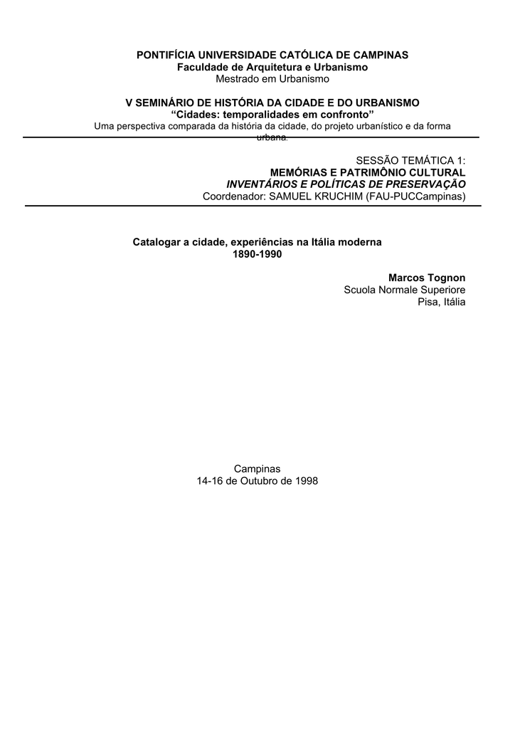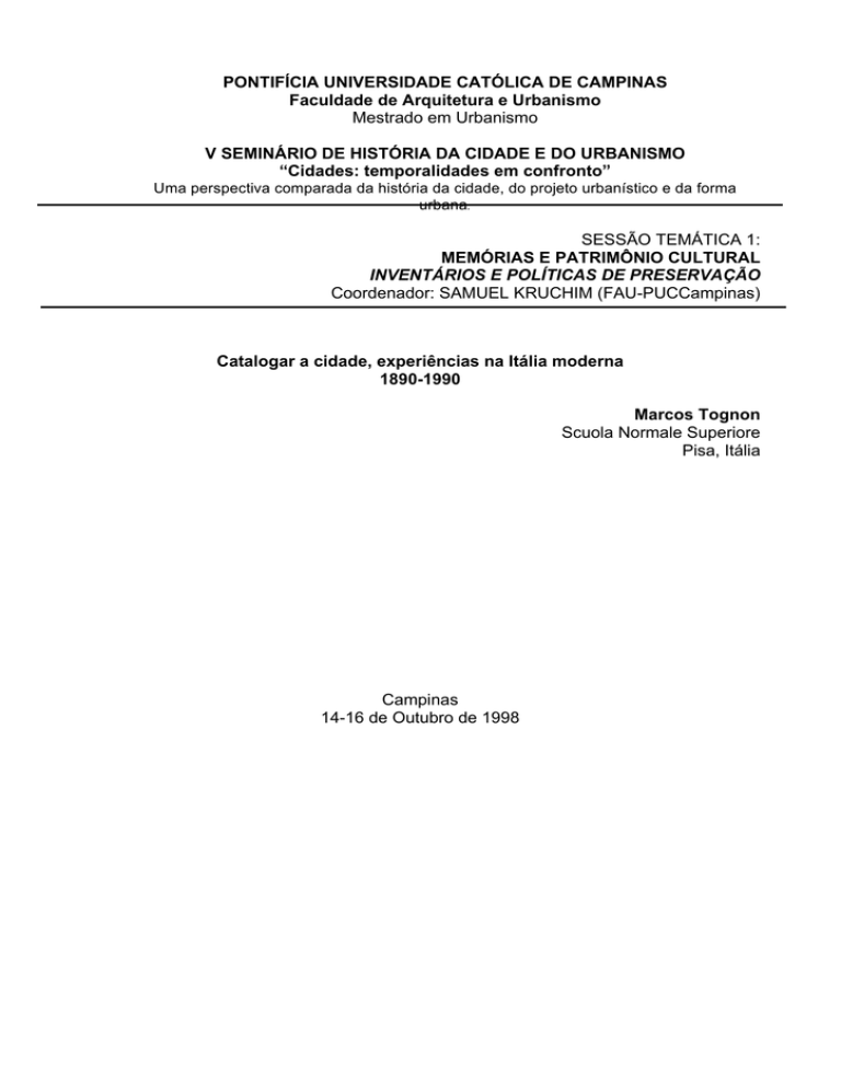 PONTIFÍCIA UNIVERSIDADE CATÓLICA DE CAMPINAS Faculdade de Arquitetura e Urbanismo Mestrado em Urbanismo V SEMINÁRIO DE HISTÓRIA DA CIDADE E DO URBANISMO “Cidades: temporalidades em confronto” Uma perspectiva comparada da história da cidade, do projeto urbanístico e da forma urbana. SESSÃO TEMÁTICA 1: MEMÓRIAS E PATRIMÔNIO CULTURAL INVENTÁRIOS E POLÍTICAS DE PRESERVAÇÃO Coordenador: SAMUEL KRUCHIM (FAU-PUCCampinas) Catalogar a cidade, experiências na Itália moderna 1890-1990 Marcos Tognon Scuola Normale Superiore Pisa, Itália Campinas 14-16 de Outubro de 1998 Sumário Parte I. Premissas 1. Introdução ao culto das cidades 5 2. Para uma definição de "relevo arquitetônico" 5 Parte II. Experiências 3. Cultores de arquitetura, Roma 1890-1930 8 4. Saverio Muratori, Veneza 1950-60 14 5. Massimo Carmassi, Pisa 1974-90 18 6. Conclusões 21 Parte III. Iconografia Elenco das ilustrações Roma 24 Veneza 24 Pisa 25 Pranchas I-XVIII Notas 26 Parte I PREMISSAS Introdução ao culto da cidade "Catalogar a cidade", neologismo exclusivo à este estudo que ora apresentamos, quer corresponder à uma larga série de experiências, e verificaremos alguns casos italianos, e na qual poderemos colher certos princípios comuns, nos "comportamentos" e nas "condições culturais" entre os respectivos protagonistas e promotores. Portanto, catalogar nessa acepção não se refere a um procedimento limitado à operações sistemáticas de organização de dados em função do estudo, do levantamento e da avaliação quantitativa sobre um objeto, no nosso caso, da cidade e dos seus componentes: catalogar é sobretudo criar condições efetivas, meios analíticos, sempre em direção a resultados concretos que devem se somar a outros dois grandes grupos de conhecimentos, aquele dos registros pertinentes a uma História da cidade, e, aquele dos valores operativos, enfim, projetuais que possam designar as novas intervenções edilícias. Catalogar a cidade entra necessariamente em uma acepção maior, do "culto da cidade". Não se pode excluir que os nossos cultores, arquitetos e engenheiros, arqueólogos, críticos e estudiosos humanistas, sejam motivados especialmente pelos riscos explícitos nas velozes transformações que nos últimos cem anos são submetidas as cidades e os seus respectivos patrimônios. E três são os princípios comuns a essas experiências italianas, simetricamente dispostas nos últimos cem anos, nas cidades artísticas Roma, Veneza e Pisa. Um primeiro comportamento que notaremos, entre os protagonistas da nossa temática, será o modo pela qual a cidade é interpretada: certamente a cidade é um conjunto, mas um conjunto "arquitetônico", pois é a grande arte da construção que define todos os espaços e formas, da magnitude dos monumentos celebrativos, da presença das estruturas habitativas, até os conseqüentes largos, praças, ruas; essa noção é amparada por uma primeira, anterior, aquela na qual a cidade é um "organismo que cresce", que se desenvolve, e a sua materialidade, a sua espacialidade nascem em função das decisões sedimentadas pela arquitetura, ao longo das diversas vicissitudes históricas. A cidade considerada como um registro privilegiado, entre outros, para a história da cultura de determinada civilização é o segundo princípio. Nasce, aqui, a possibilidade de uma identidade delegada pelo lugar construído ao habitante, uma identidade a partir do fenômeno edilício e que vai além do gosto, ou de uma Kunstwollen epocal: existe uma plena convicção, entre os nossos estudiosos, que a cidade possa fornecer, orientar uma "sensibilidade receptiva" à cultura formal e histórica que se repousa nos materiais e nas morfologias urbanas. Reencontrar essa "orientação" é uma tarefa que alcança uma responsabilidade moral, ética, do estudioso, do cultor da cidade. Um terceiro comportamento, concluindo, ao catalogar a cidade, é a importância da fruição visiva. Desde o final do século XIX, podemos acompanhar na historiografia artística o percurso gradual da "pura-visibilidade" 1, e, poderemos verificar esse mesmo primado, da "cidade visiva", nos passos dos nossos cultores. Para uma definição de "relevo arquitetônico" Ainda dentro das nossas premissas, uma definição julgamos ser urgente, sobretudo para o ouvinte brasileiro: deveremos afrontar uma grande tradição italiana do desenho, aquela relativa à cultura do "rilievo". Recorremos à "Enciclopedia Treccani" de 1936, para uma primeira definição "institucional" dessa prática, em sua veste moderna: Rilievo - La rappresentazione grafica di un fabbricato esistente, non già nell'aspetto esteriore col quale si presenta a chi lo guarda, il che è opera di pittura o ripresa fotografica, ma attraverso speciali elaborati nei quali siano riportate in scala conveniente le sue caratteristiche reali di forma e dimensione, presuppone la conoscenza delle caratteristiche stesse, conoscenza che raggiunge mediante la misurazione dei loro elementi. S'indicano con nome di rilevamento le operazioni di misurazione e con quello di rilievo anche l'insieme degli elaborati che ne rappresentano graficamente il risultato. Dovendo tali elaborati riprodurre la realtà dell'edificio scevra da quelle deformazioni che sono tuttavia parte integrante della nostra percezione visiva, è necessario servirsi di rappresentazioni di aspetti astratti e convenzionali rispondenti ai caratteri generali comuni a tutti gli edifici, vale a dire alla loro planimetria, con le piante, e alla loro altimetria con le sezioni e gli alzati o prospetti. 2 Se a presente definição poderia favorecer uma equivalência entre "rilievo" e o "levantamento arquitetônico" no metier do profissional brasileiro, veremos que nas nossas concretas experiências de estudo, de culto das cidades, as distâncias entre as concepções italiana e brasileira são maiores 3; e, teríamos boas justificações para insistir em uma tradução de "rilievo" p