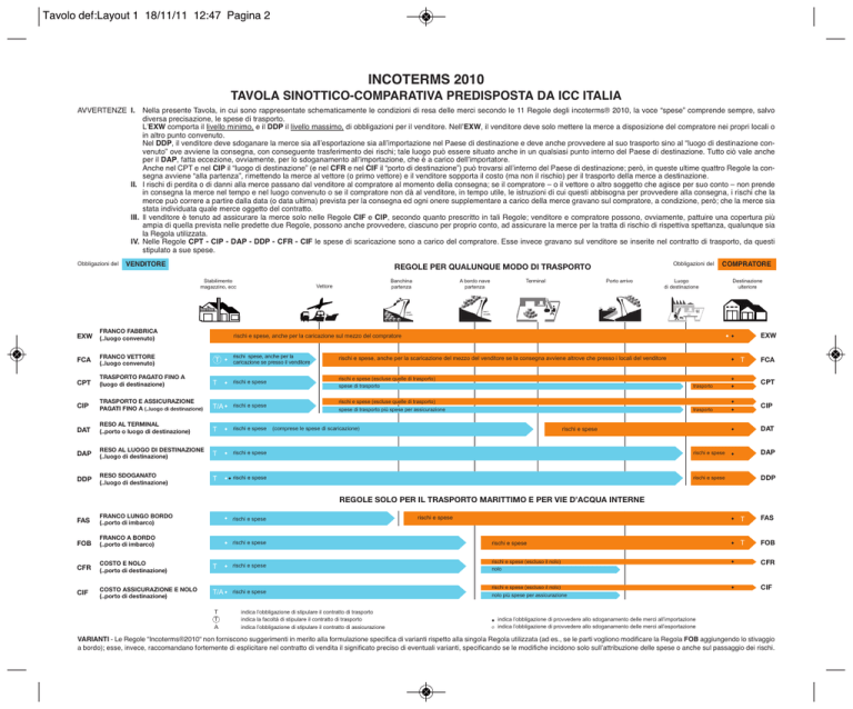 Tavolo def:Layout 1 18/11/11 12:47 Pagina 2 INCOTERMS 2010 TAVOLA SINOTTICO-COMPARATIVA PREDISPOSTA DA ICC ITALIA AVVERTENZE I. Nella presente Tavola, in cui sono rappresentate schematicamente le condizioni di resa delle merci secondo le 11 Regole degli incoterms® 2010, la voce “spese” comprende sempre, salvo diversa precisazione, le spese di trasporto. LʼEXW comporta il livello minimo, e il DDP il livello massimo, di obbligazioni per il venditore. NellʼEXW, il venditore deve solo mettere la merce a disposizione del compratore nei propri locali o in altro punto convenuto. Nel DDP, il venditore deve sdoganare la merce sia allʼesportazione sia allʼimportazione nel Paese di destinazione e deve anche provvedere al suo trasporto sino al “luogo di destinazione convenuto” ove avviene la consegna, con conseguente trasferimento dei rischi; tale luogo può essere situato anche in un qualsiasi punto interno del Paese di destinazione. Tutto ciò vale anche per il DAP, fatta eccezione, ovviamente, per lo sdoganamento allʼimportazione, che è a carico dellʼimportatore. Anche nel CPT e nel CIP il “luogo di destinazione” (e nel CFR e nel CIF il “porto di destinazione”) può trovarsi allʼinterno del Paese di destinazione; però, in queste ultime quattro Regole la consegna avviene “alla partenza”, rimettendo la merce al vettore (o primo vettore) e il venditore sopporta il costo (ma non il rischio) per il trasporto della merce a destinazione. II. I rischi di perdita o di danni alla merce passano dal venditore al compratore al momento della consegna; se il compratore – o il vettore o altro soggetto che agisce per suo conto – non prende in consegna la merce nel tempo e nel luogo convenuto o se il compratore non dà al venditore, in tempo utile, le istruzioni di cui questi abbisogna per provvedere alla consegna, i rischi che la merce può correre a partire dalla data (o data ultima) prevista per la consegna ed ogni onere supplementare a carico della merce gravano sul compratore, a condizione, però; che la merce sia stata individuata quale merce oggetto del contratto. III. Il venditore è tenuto ad assicurare la merce solo nelle Regole CIF e CIP, secondo quanto prescritto in tali Regole; venditore e compratore possono, ovviamente, pattuire una copertura più ampia di quella prevista nelle predette due Regole, possono anche provvedere, ciascuno per proprio conto, ad assicurare la merce per la tratta di rischio di rispettiva spettanza, qualunque sia la Regola utilizzata. IV. Nelle Regole CPT - CIP - DAP - DDP - CFR - CIF le spese di scaricazione sono a carico del compratore. Esse invece gravano sul venditore se inserite nel contratto di trasporto, da questi stipulato a sue spese. Obbligazioni del VENDITORE Obbligazioni del REGOLE PER QUALUNQUE MODO DI TRASPORTO Stabilimento magazzino, ecc Banchina partenza Vettore A bordo nave partenza Terminal Porto arrivo COMPRATORE Luogo di destinazione Destinazione ulteriore EXW FRANCO FABBRICA (..luogo convenuto) FCA FRANCO VETTORE (..luogo convenuto) CPT TRASPORTO PAGATO FINO A (luogo di destinazione) CIP TRASPORTO E ASSICURAZIONE PAGATI FINO A (..luogo di destinazione) T/A rischi e spese DAT RESO AL TERMINAL (..porto o luogo di destinazione) T rischi e spese DAP RESO AL LUOGO DI DESTINAZIONE (..luogo di destinazione) T rischi e spese rischi e spese DAP DDP RESO SDOGANATO (..luogo di destinazione) T rischi e spese rischi e spese DDP FAS FRANCO LUNGO BORDO (..porto di imbarco) rischi e spese FOB FRANCO A BORDO (..porto di imbarco) rischi e spese rischi e spese CFR COSTO E NOLO (..porto di destinazione) T rischi e spese rischi e spese (escluso il nolo) nolo CFR CIF COSTO ASSICURAZIONE E NOLO (..porto di destinazione) T/A rischi e spese rischi e spese (escluso il nolo) nolo più spese per assicurazione CIF EXW rischi e spese, anche per la caricazione sul mezzo del compratore T T rischi spese, anche per la caricazione se presso il venditore rischi e spese, anche per la scaricazione del mezzo del venditore se la consegna avviene altrove che presso i locali del venditore rischi e spese rischi e spese (escluse quelle di trasporto) spese di trasporto T CPT trasporto rischi e spese (escluse quelle di trasporto) spese di trasporto più spese per assicurazione CIP trasporto DAT rischi e spese (comprese le spese di scaricazione) FCA REGOLE SOLO PER IL TRASPORTO MARITTIMO E PER VIE D’ACQUA INTERNE T T A indica l’obbligazione di stipulare il contratto di trasporto indica la facoltà di stipulare il contratto di trasporto indica l’obbligazione di stipulare il contratto di assicurazione rischi e spese T FAS T FOB indica l’obbligazione di provvedere allo sdoganamento delle merci all’importazione indica l’obbligazione di provvedere allo sdoganamento delle merci all’esportazione VARIANTI - Le Regole “Incoterms®2010“ non forniscono suggerimenti in merito alla formulazione specifica di varianti rispetto alla singola Regola utilizzata (ad es., se le parti vogliono modificare la Regola FOB aggiungendo lo stivaggio a bordo); esse, invece, raccomandano fortemente di esplicitare nel contratto di vendita il significato preciso di eventuali varianti, specificando se le modifiche incidono solo sullʼattribuzione delle spese o anche sul passaggio dei rischi. Brevi definizioni dei nuovi Incoterms 2010 Brief definitions of new Incoterms 2010 INCOTERMS 2010 EXW (inserire il luogo di consegna convenuto) FRANCO FABBRICA il venditore effettua la consegna mettendo la merce a disposizione del compratore nei propri locali o in altro luogo convenuto (stabilimento, fabbrica, magazzino, ecc.). Il venditore non ha l'obbligo di caricare la merce sul veicolo di prelevamento, né di sdoganarla all'esportazione, nel caso in cui tale sdoganamento sia previsto. EXW (insert named piace of delivery) EX WORKS The seller delivers when it places the goods at the disposal of the buyer at the seller's premises or at another named piace (i.e., works, factory, warehouse, etc.) T
