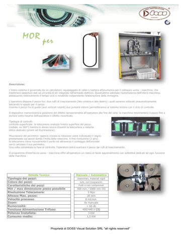 Descrizione: L’intero sistema è governato da un calcolatore, equipaggiato di video e tastiera alfanumerica per il colloquio uomo - macchina, che trasferisce opportuni dati ad un’unità di plc integrata nell’armadio elettrico. Quest’ultimo adempie l’automazione dell’intera macchina, abbassando notevolmente il tempo ciclo e rendendo indipendente l’elaborazione della immagine. L’operatore dispone il pezzo fra i due rullii di trascinamento (lato sinistro e lato destro) i quali saranno sollevati pneumaticamente lasciando lo spazio per il carico. Inserito il pezzo fra le guide (assi verticali rotanti) due pulsanti esterni permetteranno al sistema iniziare con il ciclo di controllo. Il dispositivo memorizzerà la posizione del difetto riproponendola all'operatore alla fine del ciclo: la macchina movimenterà il pezzo fino a portare sotto l'esame dell'operatore il difetto riscontrato. Tipologia di controlli: controllo superficiale: la telecamera analizza l’intera superficie del pezzo (radiale, su 360°) mentre lo stesso scorre d’avanti la telecamera e sistema ottico dedicato (prismi ed illuminazione). Misurazione del perimetro: appena iniziata la rotazione viene individuato il segno prestampato sul pezzo dando l’inizio della rotazione. A fine rivoluzione (1 giro) la telecamera rileva nuovamente il punto ed attraverso il conteggio dell’encoder verrà calcolato il suo perimetro. Una volta completata la fase di controllo, l’operatore potrà scaricare il pezzo dai rulli di trascinamento. Il programma d’interfaccia uomo - macchina offre all’operatore un menù di facile apprendimento con sottotitoli dedicati ad ogni funzione della macchina Scheda Tecnica Manuale / Automatica Tipologia dei pezzi: Colore dei pezzi: Caratteristiche dei pezzi Min / max dimensione pezzo possibile Risoluzione Telecamera: Altezza Max. pezzo: Velocità processo Zoom: Rumorosità: Tensione Alimentazione Trifase: Potenza Installata: Consumo medio: elastomeri, materiali rigidi tutti, non trasparenti. Puliti e non contaminati 300 mm / 5000 mm OD 5 Mpx 20 mm 8 mt/min 6x manuale < 60 db 400/440 V (3) 3 KW 1,5 KW Proprietà di DOSS Visual Solution SRL "all rights reserved"