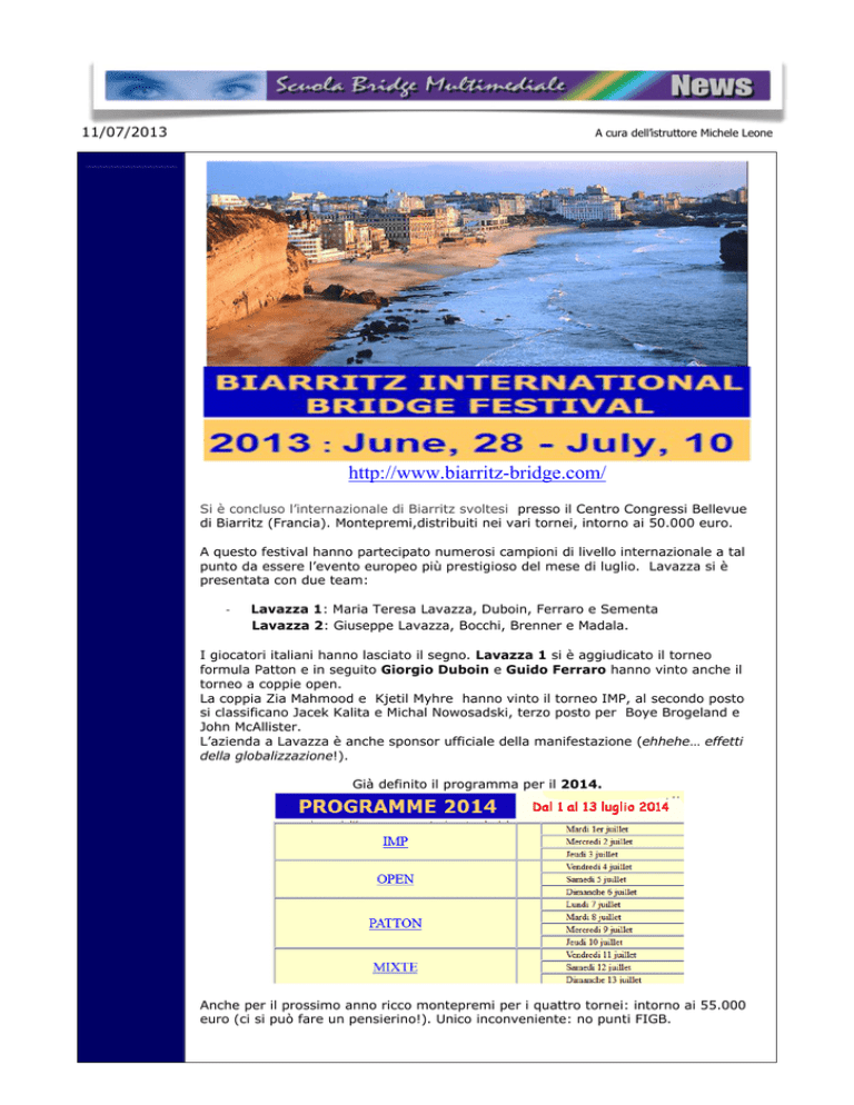 11/07/2013 A cura dell’istruttore Michele Leone http://www.biarritz-bridge.com/ Si è concluso l’internazionale di Biarritz svoltesi presso il Centro Congressi Bellevue di Biarritz (Francia). Montepremi,distribuiti nei vari tornei, intorno ai 50.000 euro. A questo festival hanno partecipato numerosi campioni di livello internazionale a tal punto da essere l’evento europeo più prestigioso del mese di luglio. Lavazza si è presentata con due team: ‐ Lavazza 1: Maria Teresa Lavazza, Duboin, Ferraro e Sementa Lavazza 2: Giuseppe Lavazza, Bocchi, Brenner e Madala. I giocatori italiani hanno lasciato il segno. Lavazza 1 si è aggiudicato il torneo formula Patton e in seguito Giorgio Duboin e Guido Ferraro hanno vinto anche il torneo a coppie open. La coppia Zia Mahmood e Kjetil Myhre hanno vinto il torneo IMP, al secondo posto si classificano Jacek Kalita e Michal Nowosadski, terzo posto per Boye Brogeland e John McAllister. L’azienda a Lavazza è anche sponsor ufficiale della manifestazione (ehhehe… effetti della globalizzazione!). Già definito il programma per il 2014. Anche per il prossimo anno ricco montepremi per i quattro tornei: intorno ai 55.000 euro (ci si può fare un pensierino!). Unico inconveniente: no punti FIGB.