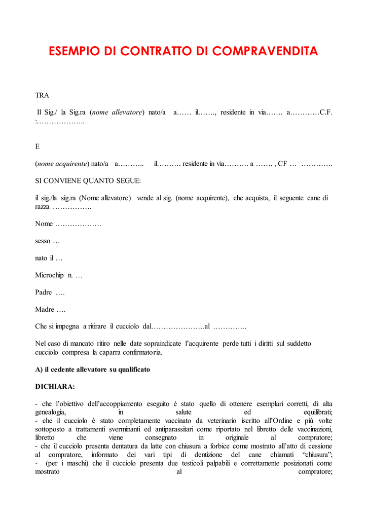 ESEMPIO DI CONTRATTO DI COMPRAVENDITA TRA Il Sig./ la Sig.ra (nome allevatore) nato/a :……………….. a…… il……., residente in via……. a…………C.F. E (nome acquirente) nato/a a……….. il………. residente in via………. a ……. , CF … …………. SI CONVIENE QUANTO SEGUE: il sig./la sig.ra (Nome allevatore) vende al sig. (nome acquirente), che acquista, il seguente cane di razza ……………. Nome ………………. sesso … nato il … Microchip n. … Padre …. Madre …. Che si impegna a ritirare il cucciolo dal………………….al ………….. Nel caso di mancato ritiro nelle date sopraindicate l’acquirente perde tutti i diritti sul suddetto cucciolo compresa la caparra confirmatoria. A) il cedente allevatore su qualificato DICHIARA: - che l’obiettivo dell’accoppiamento eseguito è stato quello di ottenere esemplari corretti, di alta genealogia, in salute ed equilibrati; - che il cucciolo è stato completamente vaccinato da veterinario iscritto all’Ordine e più volte sottoposto a trattamenti sverminanti ed antiparassitari come riportato nel libretto delle vaccinazioni, libretto che viene consegnato in originale al compratore; - che il cucciolo presenta dentatura da latte con chiusura a forbice come mostrato all’atto di cessione al compratore, informato dei vari tipi di dentizione del cane chiamati “chiusura”; - (per i maschi) che il cucciolo presenta due testicoli palpabili e correttamente posizionati come mostrato al compratore; - di garantire la correttezza delle dichiarazioni nel pedigree e l’iscrizione al Libro Origini Italiano - di spogliarsi, o comunque rinunciare, a ogni diritto sul cucciolo che prontamente sarà consegnato in proprietà al cessionario conseguentemente alla ricezione del prezzo pattuito SI IMPEGNA: -a consegnare ex art 1477 cc all’acquirente il cane sopra identificato così come si trova al momento della vendita -a consegnare al cessionario l’originale del pedigree non appena pervenuto dall’Ente Nazionale della Cinofilia Italiana e da questi quivi ritirato -a prestare le garanzie sanitarie dovute ai sensi dell’art. 1496 cc. specificatamente per le seguenti malattie infettive: cimurro, parvovirosi, epatite, leptospirosi, secondo le leggi speciali e usi locali del luogo di conclusione del contratto. Si intendono esaurite le garanzie trascorsi il periodo di 15 giorni (considerato in medicina veterinaria il periodo massimo di incubazione per le malattie sucitate), dalla consegna del cane. B) IL CESSIONARIO ACQUIRENTE DICHIARA ESPRESSAMENTE - di autocertificare sotto la propria responsabilità civile e penale di: non essere delinquente abituale o per tendenza; non aver riportato condanne anche non definitive per delitti non colposi contro la persona o contro il patrimonio punibili con la reclusione superiore a 2 anni; non aver riportato condanna, anche non definitiva, per i reati di cui all’art. 727 del codice penale; di non essere minore di 18 anni e/o interdetto e/o inabilitato per infermità - di aver attentamente visionato il cane sopra indicato come oggetto del contratto il quale cucciolo risulta essere gradito per morfologia e carattere, tale da non aver riserve nelle sue qualità - di avere le conoscenze e le capacità necessarie per crescere, curare e mantenere correttamente il cane, particolarmente un cucciolo e specificatamente questo cucciolo oggetto del contratto - di acquisire incondizionatamente e contestualmente alla materiale apprensione del cane la proprietà dello stesso e la responsabilità per lo stesso. Di esonerare quindi il cedente allevatore da ogni responsabilità per fatti o situazioni dovute, ad esempio, ad inadeguato trattamento, mantenimento, allevamento dello stesso cucciolo che si verificassero posteriormente alla datazione di questo contratto. - di sottoscrivere ed accettare esplicitamente la rinuncia ad ottenere rimborsi o crediti qualora il cane per qualsiasi motivo addotto dallo stesso cessionario fosse restituito al cedente allevatore e da questi – senza obblighi ma, ad es., per mero scopo di altruismo e di cinofilia, ritirato e riaccolto – ove possibile – nel proprio allevamento - di aver già ricevuto il testo redatto dall’allevatore cedente riportante le norme base per allevare e crescere il cane attraverso l’utilizzo di metodiche etologiche ed etiche. - di ricevere in data odierna: l’originale del certificato di attestazione, identificazione e registrazione del microchip e la copia di propria spettanza per la voltura della titolarità del microchip SI IMPEGNA: ad allevare (ovvero educare, socializzare e curare) il cucciolo così come concordato con l’allevatore, soprattutto evitando che lo stesso possa diventare veicolo di malattie, rischi o pericoli verso l’uomo, le cose o gli altri animali. - ad essere un proprietario responsabile e a non trascurare in alcun modo il cane, in particolare non tenendolo mai alla catena, chiuso in spazi non adatti, abbandonato o libero di vagare da solo. a non esaltare o incoraggiare personalmente o per interposta persona, in alcun modo, comportamenti aggressivi del cane verso persone e/o animali e, conseguentemente, a garantire che il cane non sia mai venduto, dato in affido o in custodia o in uso, regalato o altro, a persone che promuovono o che direttamente o indirettamente possano essere collegate con attività illecite o vietate dalle leggi, quali, in particolare, il combattimento tra animali. - espressamente a registrare il cucciolo del quale è venuto oggi in possesso presso l’anagrafe canina del proprio comune di residenza volturando la registrazione di proprietà ed il codice del microchip sotto proprio nome, così come richiesto dalle leggi italiane in vigore. - a volturare il documento LOI del cane a proprio nome, così come previsto dai regolamenti ENCI a stipulare una polizza di assicurazione di responsabilità civile per danni verso terzi nella quale sia contemplato in cane oggetto del pres