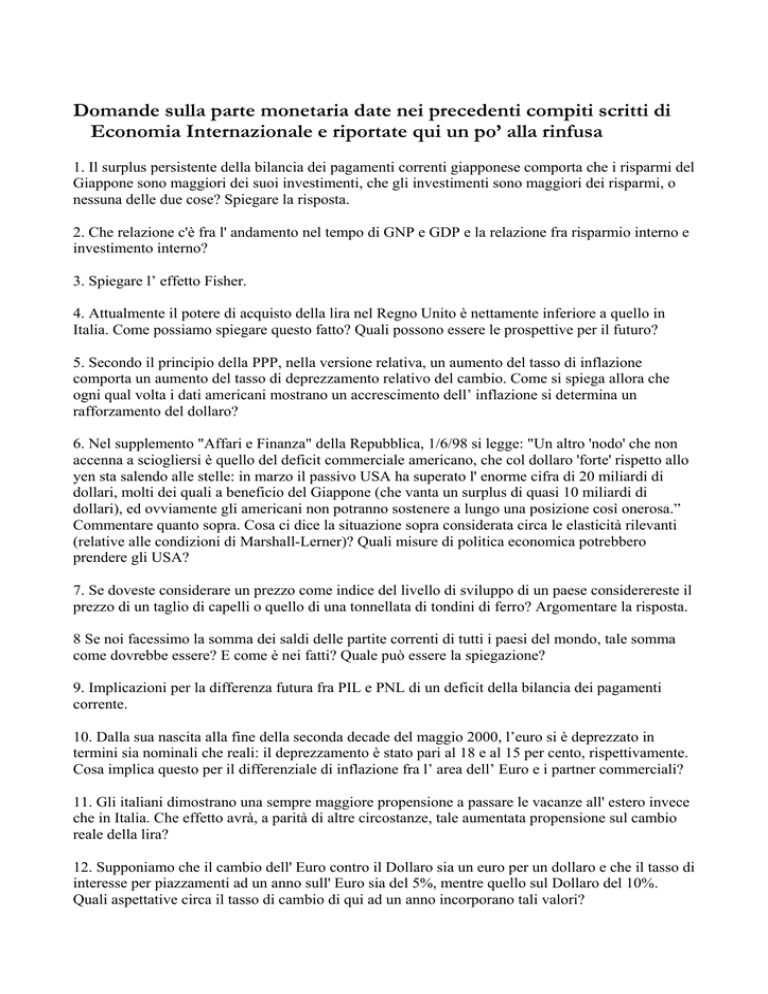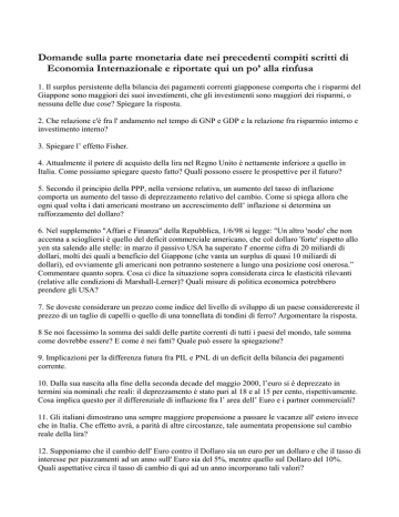 Domande sulla parte monetaria date nei precedenti compiti scritti di Economia Internazionale e riportate qui un po’ alla rinfusa 1. Il surplus persistente della bilancia dei pagamenti correnti giapponese comporta che i risparmi del Giappone sono maggiori dei suoi investimenti, che gli investimenti sono maggiori dei risparmi, o nessuna delle due cose? Spiegare la risposta. 2. Che relazione c'è fra l' andamento nel tempo di GNP e GDP e la relazione fra risparmio interno e investimento interno? 3. Spiegare l’ effetto Fisher. 4. Attualmente il potere di acquisto della lira nel Regno Unito è nettamente inferiore a quello in Italia. Come possiamo spiegare questo fatto? Quali possono essere le prospettive per il futuro? 5. Secondo il principio della PPP, nella versione relativa, un aumento del tasso di inflazione comporta un aumento del tasso di deprezzamento relativo del cambio. Come si spiega allora che ogni qual volta i dati americani mostrano un accrescimento dell’ inflazione si determina un rafforzamento del dollaro? 6. Nel supplemento "Affari e Finanza" della Repubblica, 1/6/98 si legge: "Un altro 'nodo' che non accenna a sciogliersi è quello del deficit commerciale americano, che col dollaro 'forte' rispetto allo yen sta salendo alle stelle: in marzo il passivo USA ha superato l' enorme cifra di 20 miliardi di dollari, molti dei quali a beneficio del Giappone (che vanta un surplus di quasi 10 miliardi di dollari), ed ovviamente gli americani non potranno sostenere a lungo una posizione così onerosa.” Commentare quanto sopra. Cosa ci dice la situazione sopra considerata circa le elasticità rilevanti (relative alle condizioni di Marshall-Lerner)? Quali misure di politica economica potrebbero prendere gli USA? 7. Se doveste considerare un prezzo come indice del livello di sviluppo di un paese considerereste il prezzo di un taglio di capelli o quello di una tonnellata di tondini di ferro? Argomentare la risposta. 8 Se noi facessimo la somma dei saldi delle partite correnti di tutti i paesi del mondo, tale somma come dovrebbe essere? E come è nei fatti? Quale può essere la spiegazione? 9. Implicazioni per la differenza futura fra PIL e PNL di un deficit della bilancia dei pagamenti corrente. 10. Dalla sua nascita alla fine della seconda decade del maggio 2000, l’euro si è deprezzato in termini sia nominali che reali: il deprezzamento è stato pari al 18 e al 15 per cento, rispettivamente. Cosa implica questo per il differenziale di inflazione fra l’ area dell’ Euro e i partner commerciali? 11. Gli italiani dimostrano una sempre maggiore propensione a passare le vacanze all' estero invece che in Italia. Che effetto avrà, a parità di altre circostanze, tale aumentata propensione sul cambio reale della lira? 12. Supponiamo che il cambio dell' Euro contro il Dollaro sia un euro per un dollaro e che il tasso di interesse per piazzamenti ad un anno sull' Euro sia del 5%, mentre quello sul Dollaro del 10%. Quali aspettative circa il tasso di cambio di qui ad un anno incorporano tali valori? 13 Se valesse il principio della parità dei poteri di acquisto, che relazione ci dovrebbe essere fra i tassi di inflazione in Europa e negli Stati Uniti? 14. Il surplus persistente della bilancia dei pagamenti correnti giappponesi giapponese comporta che i risparmi del Giappone sono maggiori dei suoi investimenti, che gli investimenti sono maggiori dei risparmi, o nessuna delle due cose? Spiegare la risposta. 15. Se il prodotto interno lordo è maggiore del prodotto nazionale lordo, cosa implica questo sui redditi ricevuti dall' estero e pagati all' estero? 16. Che relazione c'è fra l' andamento nel tempo di GNP e GDP e la relazione fra risparmio interno e investimento interno? 17. Quando le statistiche evidenziano un aumento dei prezzi negli USA il tasso di interesse tende ad aumentare. Ci sono due possibili spiegazioni: 1. perchè i mercati si attendono una reazione da parte della Riserva Federale volta a combattere le prospettive di inflazione e quindi tassi di interesse più elevati nel breve periodo; 2. perchè i mercati si attendono un deprezzamento futuro del cambio del dollaro in seguito all’ aumentata inflazione americana. Per distinguere quale di queste due ipotesi sia valida occorre verificare quello che succede sul mercato dei cambi. Come? 19. come contabilizzereste la seguente transazione nella bilancia dei pagamenti: acquisto via Intenet di un programma di computer negli USA con addebito su carta di credito Visa in Italia. 20. Rilevanza e implicazioni del saldo economico della bilancia dei pagamenti. 21. Descrivere sinteticamente le proprietà delle curve AA e DD. A cosa serve la costruzione del relativo modello? 22. Che relazione c’ è fra il saldo economico e quello contabile della bilancia dei pagamenti? 23. Vi sono diversi casi storici in cui un saldo passivo delle partite correnti è stato finanziato da un saldo positivo del conto capitale (o finanziario, secondo la terminologia più recente). Quali sono le implicazioni di un tipo di andamento della bilancia dei pagamenti di questo genere per le prospettive di lungo periodo dell’ economia nazionale? 24. Supponiamo che si crei, partendo da una situazione di pareggio del bilancio, un avanzo generato tramite un aumento delle imposte e che all' avanzo corrisponda una uguale riduzione attesa della quantità di moneta. Cosa succederà al tasso di cambio? 25. Quando si considera il valore del reddito degli abitanti dei paesi più poveri ci si chiede come questi facciano a sopravvivere con redditi di pochi euro al mese, che sono una piccola frazione dei redditi dei paesi più ricchi. Qual’ è la vostra risposta? 26. Qual’ è la giustificazione della condizione della parità dei tassi di interesse? 27. Se il prodotto interno lordo è maggiore del prodotto nazionale lordo, cosa implica questo sui redditi ricevuti dall' estero e pagati all' estero? 28. Che relazione c’ è fra il saldo contabile e quello economico dell