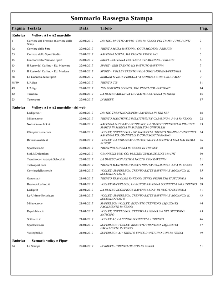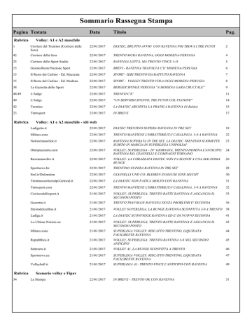 Sommario Rassegna Stampa Pagina Testata Rubrica Data Titolo Pag. Volley: A1 e A2 maschile 1 Corriere del Trentino (Corriere della Sera) 22/01/2017 DIATEC, BRUTTO AVVIO CON RAVENNA POI TROVA I TRE PUNTI 2 42 Corriere della Sera 22/01/2017 TRENTO MURA RAVENNA, OGGI MODENA-PERUGIA 4 25 Corriere dello Sport Stadio 22/01/2017 RAVENNA LOTTA, MA TRENTO VINCE 3-O 5 15 Giorno/Resto/Nazione Sport 22/01/2017 BREVI - RAVENNA TRAVOLTA C'E' MODENA-PERUGIA 6 13 Il Resto del Carlino - Ed. Macerata 22/01/2017 SPORT - IERI TRENTO HA BATTUTO RAVENNA 7 15 Il Resto del Carlino - Ed. Modena 22/01/2017 SPORT - VOLLEY TRENTO VOLA OGGI MODENA-PERUGIA 8 38 La Gazzetta dello Sport 22/01/2017 BERGER SPINGE PERUGIA "A MODENA GARA CRUCI'ALE" 9 48/49 L'Adige 22/01/2017 TRENTO C'E' 11 49 L'Adige 22/01/2017 "UN SERVIZIO SPENTO, TRE PUNTI COL FIATONE" 14 42 Trentino 22/01/2017 LA DIATEC ARCHIVIA LA PRATICA RAVENNA (N.Baldo) 15 23 Tuttosport 22/01/2017 IN BREVE 17 Rubrica Rubrica 34 Volley: A1 e A2 maschile - siti web Ladigetto.it 22/01/2017 DIATEC TRENTINO SUPERA RAVENNA IN TRE SET 18 Milano.zone 22/01/2017 TRENTO MANTIENE L'IMBATTIBILITA' CASALINGA. 3-0 A RAVENNA 22 Notizieinunclick.it 22/01/2017 RAVENNA SUPERATA IN TRE SET, LA DIATEC TRENTINO SI RIMETTE SUBITO IN MARCIA IN SUPERLEGA UNIPOLSAI 23 Olimpiazzurra.com 22/01/2017 VOLLEY, SUPERLEGA - 20^ GIORNATA, TRENTO DOMINA L'ANTICIPO: 24 RAVENNA KO, GIANNELLI E COMPAGNI TORNANO Ravennawebtv.it 22/01/2017 VOLLEY: LA CORAZZATA DIATEC NON FA SCONTI A UNA MAI DOMA BUNGE 26 Sportnews.bz 22/01/2017 TRENTINO SUPERA RAVENNA IN TRE SET 28 Stol.it/Dolomiten 22/01/2017 GIANNELLI UND CO. BLEIBEN ZUHAUSE EINE MACHT 30 Trentinocorrierealpi.Gelocal.it 22/01/2017 LA DIATEC NON FATICA MOLTO CON RAVENNA 31 Tuttosport.com 22/01/2017 TRENTO MANTIENE L'IMBATTIBILITA' CASALINGA. 3-0 A RAVENNA 32 Corrieredellosport.it 21/01/2017 VOLLEY: SUPERLEGA, TRENTO BATTE RAVENNA E AGGANCIA IL SECONDO POSTO 35 Gazzetta.it 21/01/2017 TRENTO TRAVOLGE RAVENNA SENZA PROBLEMI E' SECONDA 36 Ilrestodelcarlino.it 21/01/2017 VOLLEY SUPERLEGA, LA BUNGE RAVENNA SCONFITTA 3-0 A TRENTO 38 Ladige.it 21/01/2017 LA DIATEC SCONFIGGE RAVENNA ED E' DI NUOVO SECONDA 41 Le-Ultime-Notizie.eu 21/01/2017 VOLLEY: SUPERLEGA, TRENTO BATTE RAVENNA E AGGANCIA IL SECONDO POSTO 43 Milano.zone 21/01/2017 SUPERLEGA VOLLEY: RISCATTO TRENTINO, LIQUIDATA FACILMENTE RAVENNA 44 Repubblica.it 21/01/2017 VOLLEY, SUPERLEGA: TRENTO-RAVENNA 3-0 NEL SECONDO ANTICIPO 45 Settesere.it 21/01/2017 VOLLEY A1, LA BUNGE SCONFITTA A TRENTO 46 Sportnews.eu 21/01/2017 SUPERLEGA VOLLEY: RISCATTO TRENTINO, LIQUIDATA FACILMENTE RAVENNA 47 Volleyball.it 21/01/2017 SUPERLEGA A1: TRENTO VINCE L'ANTICIPO CON RAVENNA 49 22/01/2017 IN BREVE - TRENTO OK CON RAVENNA 51 Scenario volley e Fipav La Stampa Quotidiano Data Pagina Codice abbonamento: 125361 Foglio 22-01-2017 42 1 Volley: A1 e A2 maschile Pag. 4 Quotidiano Data Pagina . Volley: A1 e A2 maschile Pag. 5 Codice abbonamento: 125361 Foglio 22-01-2017 25 1 Quotidiano Data Pagina . Volley: A1 e A2 maschile Pag. 6 Codice abbonamento: 125361 Foglio 22-01-2017 15 1 Quotidiano Data Pagina . Volley: A1 e A2 maschile Pag. 7 Codice abbonamento: 125361 Foglio 22-01-2017 13 1 Quotidiano Data Pagina Codice abbonamento: 125361 Foglio 22-01-2017 15 1 Volley: A1 e A2 maschile Pag. 8 Quotidiano Data Pagina Codice abbonamento: 125361 Foglio 22-01-2017 38 1 / 2 Volley: A1 e A2 maschile Pag. 9 Quotidiano Data Pagina Codice abbonamento: 125361 Foglio 22-01-2017 38 2 / 2 Volley: A1 e A2 maschile Pag. 10 Quotidiano Data Pagina Codice abbonamento: 125361 Foglio 22-01-2017 48/49 1 / 3 Volley: A1 e A2 maschile Pag. 11 Quotidiano Data Pagina Codice abbonamento: 125361 Foglio 22-01-2017 48/49 2 / 3 Volley: A1 e A2 maschile Pag. 12 Quotidiano Data Pagina Codice abbonamento: 125361 Foglio 22-01-2017 48/49 3 / 3 Volley: A1 e A2 maschile Pag. 13 Quotidiano Data Pagina Codice abbonamento: 125361 Foglio 22-01-2017 49 1 Volley: A1 e A2 maschile Pag. 14 Quotidiano Data Pagina Codice abbonamento: 125361 Foglio 22-01-2017 42 1 / 2 Volley: A1 e A2 maschile Pag. 15 Quotidiano Data Pagina Codice abbonamento: 125361 Foglio 22-01-2017 42 2 / 2 Volley: A1 e A2 maschile Pag. 16 Quotidiano Data Pagina . Volley: A1 e A2 maschile Pag. 17 Codice abbonamento: 125361 Foglio 22-01-2017 23 1 22-01-2017 Data LADIGETTO.IT (WEB) Pagina 1 / 4 Foglio Interno Esteri Letteratura Arte e Cultura Pagine di storia Economia e Finanza Festival Economia Miss Sapori Golf Sport Foto Satira Eventi Archivio Cerca | Ricerca avanzata Invia ad un amico Home | Sport | Volley | Diatec Trentino supera Ravenna in tre set Versione stampabile Diatec Trentino supera Ravenna in tre set Versione solo testo 21/01/2017 Si rimette subito in marcia a tutto gas in Superlega Unipolsai Foto di Marco Trabalza. La Diatec Trentino riprende la propria marcia spedita in SuperLega UnipolSai 2016/17, assicurandosi il secondo anticipo del ventesimo turno e balzando, in attesa di Modena-Perugia di domenica, momentaneamente di nuovo al secondo posto. Anche in questa circostanza, come accaduto nelle precedenti undici partite casalinghe, i gialloblù hanno fatto valere il fattore campo, confermando l’inviolabilità del PalaTrento che dura 125361 ormai da quasi nove mesi. Codice abbonamento: Home Volley: A1 e A2 maschile - siti web Pag. 18 LADIGETTO.IT (WEB) Data 22-01-2017 Pagina Foglio 2 / 4 A farne le spese stasera la Bunge Ravenna, regolata per 3-0 al termine di una gara piuttosto equilibrata in due dei tre set disputati. La squadra di Lorenzetti ha dimostrato di poter avere più facce; con Solé in tribuna (influenzato) e Lanza in panchina per una normale rotazione degli effettivi, i gialloblù si sono allora affidati ad Antonov e Daniele Mazzone per avere ragione degli avversari, con il primo che si è reso utile soprattutto in battuta (2 ace diretti) ed il secondo, al rientro dopo un infortunio, che è risultato mvp per l’ottimo impatto avuto in particolar modo sul primo set (75% in primo tempo, un muro 