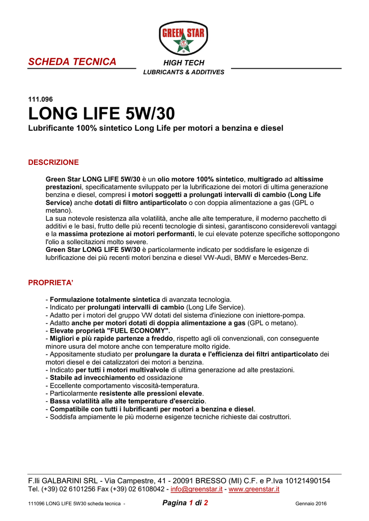 SCHEDA TECNICA HIGH TECH LUBRICANTS & ADDITIVES 111.096 LONG LIFE 5W/30 Lubrificante 100% sintetico Long Life per motori a benzina e diesel DESCRIZIONE Green Star LONG LIFE 5W/30 è un olio motore 100% sintetico, multigrado ad altissime prestazioni, specificatamente sviluppato per la lubrificazione dei motori di ultima generazione benzina e diesel, compresi i motori soggetti a prolungati intervalli di cambio (Long Life Service) anche dotati di filtro antiparticolato o con doppia alimentazione a gas (GPL o metano). La sua notevole resistenza alla volatilità, anche alle alte temperature, il moderno pacchetto di additivi e le basi, frutto delle più recenti tecnologie di sintesi, garantiscono considerevoli vantaggi e la massima protezione ai motori performanti, le cui elevate potenze specifiche sottopongono l'olio a sollecitazioni molto severe. Green Star LONG LIFE 5W/30 è particolarmente indicato per soddisfare le esigenze di lubrificazione dei più recenti motori benzina e diesel VW-Audi, BMW e Mercedes-Benz. PROPRIETA’ - Formulazione totalmente sintetica di avanzata tecnologia. - Indicato per prolungati intervalli di cambio (Long Life Service). - Adatto per i motori del gruppo VW dotati del sistema d'iniezione con iniettore-pompa. - Adatto anche per motori dotati di doppia alimentazione a gas (GPL o metano). - Elevate proprietà "FUEL ECONOMY". - Migliori e più rapide partenze a freddo, rispetto agli oli convenzionali, con conseguente minore usura del motore anche con temperature molto rigide. - Appositamente studiato per prolungare la durata e l'efficienza dei filtri antiparticolato dei motori diesel e dei catalizzatori dei motori a benzina. - Indicato per tutti i motori multivalvole di ultima generazione ad alte prestazioni. - Stabile ad invecchiamento ed ossidazione - Eccellente comportamento viscosità-temperatura. - Particolarmente resistente alle pressioni elevate. - Bassa volatilità alle alte temperature d'esercizio. - Compatibile con tutti i lubrificanti per motori a benzina e diesel. - Soddisfa ampiamente le più moderne esigenze tecniche richieste dai costruttori. F.lli GALBARINI SRL - Via Campestre, 41 - 20091 BRESSO (MI) C.F. e P.Iva 10121490154 Tel. (+39) 02 6101256 Fax (+39) 02 6108042 - [email protected] - www.greenstar.it 111096 LONG LIFE 5W30 scheda tecnica - Pagina 1 di 2 Gennaio 2016 SCHEDA TECNICA HIGH TECH LUBRICANTS & ADDITIVES PERFORMANCE LEVELS • ACEA A3/A5 - ACEA B3/B4/B5 - ACEA C2/C3/C4 • API SM, SL / CF, CE • BMW Long Life Engine Oil - LL-04 • FIAT 9.555.35-G1, FIAT 9.555.35-S1 • FORD WSS M2C913-B, FORD WSS M2C913-C, FORD WSS M2C913-D, FORD WSS M2C934-B • GM – OPEL GM-LL-A-025, GM-LL-B-025; 1942006, 1942000 • MB 229.31 - MB 229.51 • NATO O-1178 • PSA E05/D05 NIVEAU LOW SAPS; PSA B71 2290 • RENAULT RN 0720 • VW 504.00, VW 507.00 GRADAZIONI SAE 5W/30 F.lli GALBARINI SRL - Via Campestre, 41 - 20091 BRESSO (MI) C.F. e P.Iva 10121490154 Tel. (+39) 02 6101256 Fax (+39) 02 6108042 - [email protected] - www.greenstar.it 111096 LONG LIFE 5W30 scheda tecnica - Pagina 2 di 2 Gennaio 2016