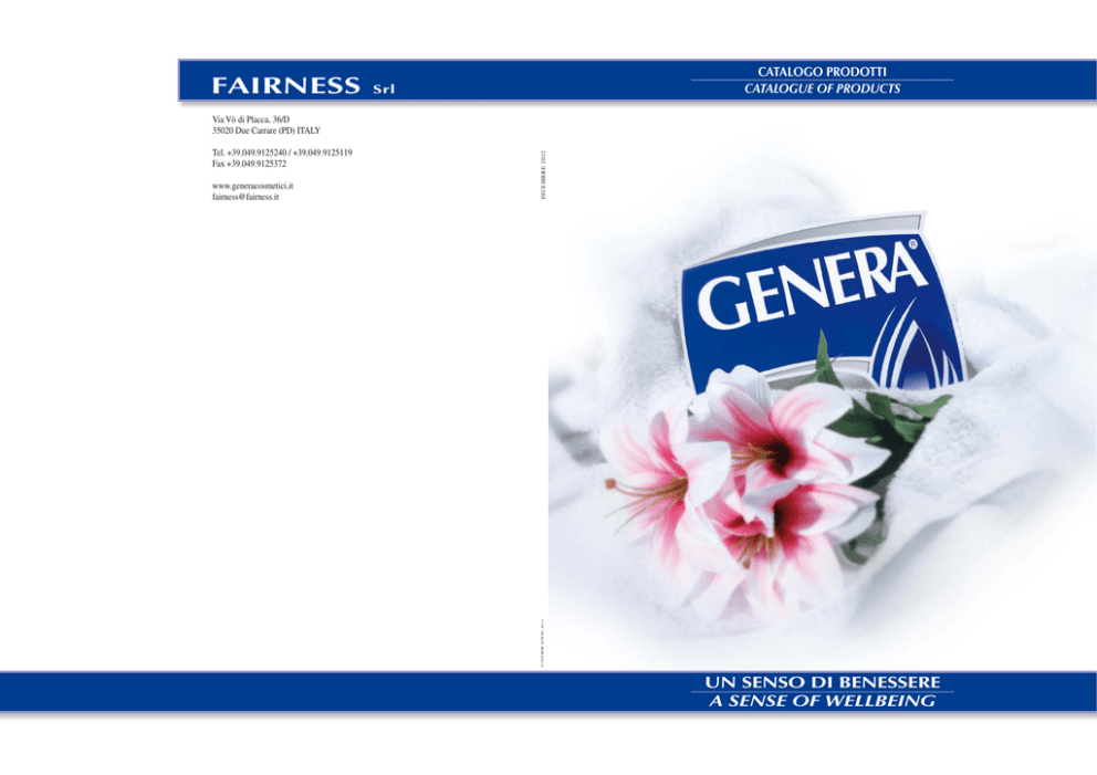 fairness Catalogo prodotti catalogue of products Srl www.generacosmetici.it [email protected] UNIBRAND.biz Tel. +39.049.9125240 / +39.049.9125119 Fax +39.049.9125372 DICEMBRE 2012 Via Vò di Placca, 36/D 35020 Due Carrare (PD) ITALY UN SENSO DI BENESSERE A SENSE OF WELLBEING fa irness Fairness nasce nel 1983. Produce da quasi 30 anni in Italia, nei nuovi stabilimenti di Due Carrare, articoli per la cura e l’igiene della persona. Il fulcro dello sviluppo e del successo, per i giovani e dinamici soci fondatori, è stato il trinomio “Immagine Qualità Prezzo” che ha permesso di affermare nel mercato il marchio Genera. Le attrezzature all’avanguardia, gli impianti automatizzati e la corretta gestione nei processi di trasformazione, oggi permettono di velocizzare i tempi rispettando la qualità. I prodotti, dalle materie prime innovative, scelte con grande attenzione anche nel rispetto dell’ambiente, al packaging, al prodotto finito, sono analizzati e controllati accuratamente secondo le linee guida delle Normative Comunitarie. Fairness was born in 1983. It has been producing for almost 30 years in Italy, in the new factories in Due Carrare, articles for personal care and hygiene. For the young and dynamic promoting partners, the hub of development and success was the trinomial “Image Quality Price”, which allowed to impose on the market the “Genera” brand name. The vanguard equipment, the automated plants and the correct management on the transformation processes, nowadays allow to speed up times, always respecting quality. The articles, from the innovative raw materials, chosen with great attention yet respecting the environment, to the packaging, to the finished product, are carefully checked and analysed according to the guidelines of the European Community Regulations. fa i r n e s s La continua risposta da parte degli utilizzatori nazionali con il mercato estero. Le etichette riportano, per questo, le traduzioni nella lingua della nazione di vendita. Il futuro dell’azienda è impostato sulle solide basi del passato, ricco di gratificazioni per la continua crescita, innovazione e organizzazione, in modo da soddisfare ecletticamente le idee in linea con il trend del momento e le richieste del settore. Il trinomio “Immagine Qualità Prezzo” in armonia con raffinatezza e serietà, come nel passato, accompagnerà Fairness nel futuro… The continuous answer from the national users was the visiting card for a cooperation with the foreign m arket as well. For this reason, the labels are carrying the translations into the languages of the selling countries. The future of the company is built on the solid bases of the past, rich in fulfilments for the continuous growth, innovation and organization, so to satisfy eclecticly the ideas in line with the current trends and the demands of the sector. The trinomial “Image Quality Price”, in harmony with refinement and seriousness, as it was in the past, will accompany Fairness in the future… GENERA® è un marchio registrato in / Trade mark registered in: Italia, Albania, Bulgaria, Rep. Ceca, Slovacchia, Serbia e Montenegro, Croazia, Slovenia, Macedonia, Bosnia-Erzegovina, Romania, Ungheria, Federazione di Russia, Ucraina, Lettonia, Estonia, Lituania, Grecia. inde x è stato il biglietto da visita per una collaborazione anche BEAUTY LINE Pagina 6 Pagina 8 INTIMATE LINE Pagina 10 DEO LINE Pagina 12 ORAL CARE LINE Pagina 14 SHOWER SHAMPOO LINE Pagina 16 BODY LINE Pagina 18 FOR MAN LINE Pagina 20 DOLCE BABY LINE Pagina 24 DOLCE NATURA LINE Pagina 26 FORTIFYNG LINE Pagina 28 HAIR CARE LINE Pagina 30 GELCAP LINE Pagina 32 FAMILY LINE Pagina 34 SOFT SOAP LINE Pagina 36 ALWAYS LINE Pagina 42 SUN LINE Pagina 44 GIFT SETS LINE Pagina 50 HANDS & FEET LINE It’s a range of products for the face beauty and cleanliness, particular creams ideal for the body, with delicate and nourishing formulations, for every moment of the day. The used raw materials are specific for the respect of the skin and its pH and they are enriched with natural extracts, vitamins and sought-after fragrances. The same care has been taken in the search for ingredients as well as in the dermatological problems. Beauty line è una linea di prodotti per la bellezza e la pulizia del viso, creme particolari ideali per il corpo, dalle formulazioni delicate e nutrienti, per tutti i momenti della giornata. Le materie prime utilizzate sono specifiche per il rispetto della pelle Crema Fluida Emolliente Emollient Fluid Cream e del suo pH, arricchite da estratti naturali, Art. vitamine e fragranze ricercate. ml Cod. EAN Cod. ITF-14 281205 500800369340003618003693400033 La cura per la ricerca negli ingredienti è stata posta anche per le problematiche dermatologiche. Crema da Giorno con Vit. E Day Cream with Vit. E Crema da Notte Nutriente Nourishing Night Cream Crema Contro le Rughe con Vit. E Anti-wrinkles Cream with Vit. E Struccante Occhi Make-Up Remover for Eyes Latte Detergente Dermonutriente Cleansing Milk Lozione Tonica Analcolica Non-Alcoholic Tonic Lotion Art. Art. Art. Art. Art. Art. ml Cod. EAN Cod. ITF-14 281208 50 800369340004318003693400040 ml Cod. EAN Cod. ITF-14 281202 50 800369340005018003693400057 ml Cod. EAN Cod. ITF-14 281209 50 800369340032618003693400323 ml Cod. EAN Cod. ITF-14 282473 250800369340093718003693400934 ml Cod. EAN Cod. ITF-14 282403 250800369340001218003693400019 Imballo Box Cod. EAN Cod. ITF-14 282404 250800369340002918003693400026 pallet Pz/Conf. Pcs/Box Peso Lordo - kg Gross Weight - kg 281208-281202-281209 12 2,4 25x19,1x83h 19 x 11 209 522 80x120x113h 282403-282404-282473 24 7 31,7x19,2x17,5h 14 x 6 84 608 80x120x120h 281205 12 6,8 27,3x18,8x21,8h 16 x 5 80 564 80x120x125h Art. 6 ml Dimensioni - cm Dimensions - cm Colli per Piano Colli per Pallet Peso Lordo - kg Dimensioni - cm Boxes per Layer Boxes per Pallet Gross Weight - kg Dimensions - cm 7 HANDS & FEET LINE FEET LINE Cura, comfort e igiene per mani e piedi. Per Genera sono così