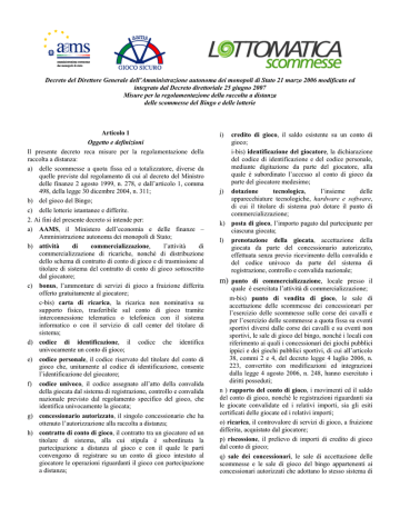 Decreto del Direttore Generale dell’Amministrazione autonoma dei monopoli di Stato 21 marzo 2006 modificato ed integrato dal Decreto direttoriale 25 giugno 2007 Misure per la regolamentazione della raccolta a distanza delle scommesse del Bingo e delle lotterie Articolo 1 Oggetto e definizioni Il presente decreto reca misure per la regolamentazione della raccolta a distanza: a) delle scommesse a quota fissa ed a totalizzatore, diverse da quelle previste dal regolamento di cui al decreto del Ministro delle finanze 2 agosto 1999, n. 278, e dall’articolo 1, comma 498, della legge 30 dicembre 2004, n. 311; b) del gioco del Bingo; c) delle lotterie istantanee e differite. 2. Ai fini del presente decreto si intende per: a) AAMS, il Ministero dell’economia e delle finanze – Amministrazione autonoma dei monopoli di Stato; b) attività di commercializzazione, l’attività di commercializzazione di ricariche, nonché di distribuzione dello schema di contratto di conto di gioco e di trasmissione al titolare di sistema del contratto di conto di gioco sottoscritto dal giocatore; c) bonus, l’ammontare di servizi di gioco a fruizione differita offerto gratuitamente al giocatore; c-bis) carta di ricarica, la ricarica non nominativa su supporto fisico, trasferibile sul conto di gioco tramite interconnessione telematica o telefonica con il sistema informatico o con il servizio di call center del titolare di sistema; d) codice di identificazione, il codice che identifica univocamente un conto di gioco; e) codice personale, il codice riservato del titolare del conto di gioco che, unitamente al codice di identificazione, consente l’identificazione del giocatore; f) codice univoco, il codice assegnato all’atto della convalida della giocata dal sistema di registrazione, controllo e convalida nazionale previsto dal regolamento specifico del gioco, che identifica univocamente la giocata; g) concessionario autorizzato, il singolo concessionario che ha ottenuto l’autorizzazione alla raccolta a distanza; h) contratto di conto di gioco, il contratto tra un giocatore ed un titolare di sistema, alla cui stipula è subordinata la partecipazione a distanza al gioco e con il quale le parti convengono di registrare su un conto di gioco intestato al giocatore le operazioni riguardanti il gioco con partecipazione a distanza; i) credito di gioco, il saldo esistente su un conto di gioco; i-bis) identificazione del giocatore, la dichiarazione del codice di identificazione e del codice personale, mediante digitazione da parte del giocatore, alla quale è subordinato l’accesso al conto di gioco da parte del giocatore medesimo; j) dotazione tecnologica, l’insieme delle apparecchiature tecnologiche, hardware e software, di cui il titolare di sistema può dotare il punto di commercializzazione; k) posta di gioco, l’importo pagato dal partecipante per ciascuna giocata; l) prenotazione della giocata, accettazione della giocata da parte del concessionario autorizzato, effettuata senza previo ricevimento della convalida e del codice univoco da parte del sistema di registrazione, controllo e convalida nazionale; m) punto di commercializzazione, locale presso il quale è esercitata l’attività di commercializzazione; m-bis) punto di vendita di gioco, le sale di accettazione delle scommesse dei concessionari per l’esercizio delle scommesse sulle corse dei cavalli e per l’esercizio delle scommesse a quota fissa su eventi sportivi diversi dalle corse dei cavalli e su eventi non sportivi, le sale di gioco del bingo, nonché i locali con riferimento ai quali i concessionari dei giochi pubblici ippici e dei giochi pubblici sportivi, di cui all’articolo 38, commi 2 e 4, del decreto legge 4 luglio 2006, n. 223, convertito con modificazioni ed integrazioni dalla legge 4 agosto 2006, n. 248, hanno esercitato i diritti posseduti; n ) rapporto del conto di gioco, i movimenti ed il saldo del conto di gioco, nonché le registrazioni riguardanti sia le giocate convalidate ed i relativi importi, sia gli esiti certificati delle giocate ed i relativi importi; o) ricarica, il controvalore di servizi di gioco, a fruizione differita, acquistato dal giocatore; p) riscossione, il prelievo di importi di credito di gioco dal conto di gioco; q) sale dei concessionari, le sale di accettazione delle scommesse e le sale di gioco del bingo appartenenti ai concessionari autorizzati che adottano lo stesso sistema di conti di gioco; r) schema di contratto, il contratto-tipo sottoposto all’approvazione di AAMS ed adottato dal titolare di sistema al fine di regolare uniformemente i rapporti contrattuali; s) sistema di conti di gioco, il sistema che gestisce i conti di gioco, unitamente ai contratti di gioco stipulati; s-bis) tipo di concessione, la codifica seguente: “IP” per le concessioni per l’esercizio delle scommesse sulle corse dei cavalli; “SP” per le concessioni per l’esercizio delle scommesse a quota fissa su eventi sportivi diversi dalle corse dei cavalli e su eventi non sportivi; “BI” per le concessioni del gioco del bingo; “GS” per le concessioni dei giochi pubblici sportivi e “GI” per le concessioni dei giochi pubblici ippici, di cui all’articolo 38, commi 2 e 4, del decreto legge 4 luglio 2006, n. 223, convertito con modificazioni ed integrazioni dalla legge 4 agosto 2006, n. 248; t) titolare del contratto di conto di gioco / titolare del conto di gioco, il giocatore intestatario del contratto di conto di gioco e del conto di gioco; u) titolare di sistema, il singolo concessionario autorizzato che dispone di un sistema di conti di gioco. Articolo 2 Soggetti ammessi 1. La raccolta a distanza delle scommesse sulle corse dei cavalli, a totalizzatore, diverse da quelle previste dall’articolo 1, comma 498, della legge 30 dicembre 2004, n. 311, nonché a quota fissa, può essere esercitata dai titolari di concessione per l’esercizio delle scommesse sulle corse dei cavalli. 2. La raccolta a distanza dell