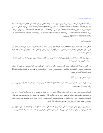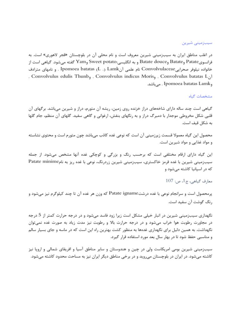 ﺳﻴﺐزﻣﻴﻨﻰ ﺷﻴﺮﻳﻦ در اﻏﻠﺐ ﻣﻨﺎﻃﻖ اﻳﺮان ﺑﻪ ﺳﻴﺐزﻣﻴﻨﻰ ﺷﻴﺮﻳﻦ ﻣﻌﺮوف اﺳﺖ و ﻧﺎم ﻣﺤﻠﻰ آن در ﺑﻠﻮﭼﺴﺘﺎن »ﻗﺠﺮ ﻻﻫﻮرى« اﺳﺖ .ﺑﻪ ﻓﺮاﻧﺴﻮى Patateو Batateو Batate douceو ﺑﻪ اﻧﮕﻠﻴﺴﻰ Sweet potato:و Yamﮔﻔﺘﻪ ﻣﻰﺷﻮد .ﮔﻴﺎﻫﻰ اﺳﺖ از ﺧﺎﻧﻮاده ﻧﻴﻠﻮﻓﺮ ﺻﺤﺮاﻳﻰ Convolvulaceaeﻧﺎم ﻋﻠﻤﻰ آن . Ipomoea batatas (L .) Lamkو ﻧﺎﻣﻬﺎى ﻣﺘﺮادف آن . Convolvulus batatas Lو . Convolvulus indicus Morisو. Convolvulus edulis Thunb و . Ipomoea batatas Lamkﻣﻰﺑﺎﺷﺪ. ﻣﺸﺨﺼﺎت ﮔﻴﺎه ﮔﻴﺎﻫﻰ اﺳﺖ ﭼﻨﺪ ﺳﺎﻟﻪ داراى ﺷﺎﺧﻪﻫﺎى دراز ﺧﺰﻧﺪه روى زﻣﻴﻦ ،رﻳﺸﻪ آن ﻣﺘﻮرم ،دراز و ﺷﻴﺮﻳﻦ ﻣﻰﺑﺎﺷﺪ .ﺑﺮﮔﻬﺎى آن ﻗﻠﺒﻰ ﺷﻜﻞ ﻣﺨﺮوﻃﻰ ﻣﻮﺟﺪار ﺑﺎ دﻣﺒﺮگ دراز و ﺑﻪ رﻧﮕﻬﺎى ﺑﻨﻔﺶ ،ارﻏﻮاﻧﻰ و ﮔﺎﻫﻰ ﺳﻔﻴﺪ .ﮔﻠﻬﺎى آن ﻣﻨﻈﻢ ،ﺟﺎم ﮔﻠﻬﺎ ﺑﻪ ﺷﻜﻞ ﻗﻴﻒ اﺳﺖ. ﻣﺤﺼﻮل اﻳﻦ ﮔﻴﺎه ﻣﻌﻤﻮﻻ ﻗﺴﻤﺖ زﻳﺮزﻣﻴﻨﻰ آن اﺳﺖ ﻛﻪ ﻧﻮﻋﻰ ﻏﺪه ﻛﺎذب ﻣﻰﺑﺎﺷﺪ ﭼﻮن ﻣﺘﻮرم اﺳﺖ و ﻣﺤﺘﻮى ﻧﺸﺎﺳﺘﻪ و ﻣﻮاد ﻏﺬاﻳﻰ و ﻣﻮاد ﺷﻴﺮﻳﻦ اﺳﺖ. اﻳﻦ ﮔﻴﺎه داراى ارﻗﺎم ﻣﺨﺘﻠﻔﻰ اﺳﺖ ﻛﻪ ﺑﺮﺣﺴﺐ رﻧﮓ و ﺑﺰرﮔﻰ و ﻛﻮﭼﻜﻰ ﻏﺪه آﻧﻬﺎ ﻣﺸﺨﺺ ﻣﻰﺷﻮد .از ﺟﻤﻠﻪ ﺳﻴﺐزﻣﻴﻨﻰ ﺷﻴﺮﻳﻦ ﺑﺎ ﻏﺪه ﻗﺮﻣﺰ ﺧﺎﻛﺴﺘﺮى ،ﺳﻴﺐزﻣﻴﻨﻰ ﺷﻴﺮﻳﻦ زردرﻧﮓ ،ﻧﻮﻋﻰ ﺑﺎ ﻏﺪه رﻳﺰ ﺑﻪ ﻧﺎمPatate minime ﻛﻪ در اﺳﭙﺎﻧﻴﺎ ﻛﺎﺷﺘﻪ ﻣﻰﺷﻮد و ﻣﻌﺎرف ﮔﻴﺎﻫﻰ ،ج ،1ص107 : ﭘﺮﻣﺤﺼﻮل اﺳﺖ و ﺳﺮاﻧﺠﺎم ﻧﻮﻋﻰ ﺑﺎ ﻏﺪه درﺷﺖ Patate ignameﻛﻪ وزن ﻫﺮ ﻏﺪه آن ﺗﺎ ﭼﻨﺪ ﻛﻴﻠﻮﮔﺮم ﻧﻴﺰ ﻣﻰﺷﻮد و رﻧﮓ ﮔﻮﺷﺖ آن ﺳﻔﻴﺪ اﺳﺖ. ﻧﮕﻬﺪارى ﺳﻴﺐزﻣﻴﻨﻰ ﺷﻴﺮﻳﻦ در اﻧﺒﺎر ﺧﻴﻠﻰ ﻣﺸﻜﻞ اﺳﺖ زﻳﺮا زود ﻓﺎﺳﺪ ﻣﻰﺷﻮد و در درﺟﻪ ﺣﺮارت ﻛﻤﺘﺮ از 5درﺟﻪ در ﻣﺠﺎورت رﻃﻮﺑﺖ ﻫﻮا ﺧﺮاب ﻣﻰﺷﻮد و در درﺟﻪ ﺣﺮارت ﺑﺎﻻ و رﻃﻮﺑﺖ ﻧﻴﺰ ﻣﺪت زﻳﺎد ﺑﻪ ﺻﻮرت ﻏﺪه ﻧﻤﻰﺗﻮان ﻧﮕﻬﺪاﺷﺖ .ﺑﻪ ﻫﻤﻴﻦ دﻟﻴﻞ ﺑﺮاى ﻧﮕﻬﺪارى ﻏﺪهﻫﺎ ﺑﻪ ﻣﻨﻈﻮر ﻛﺸﺖ ﺑﻬﺘﺮﻳﻦ راه اﻳﻦ اﺳﺖ ﻛﻪ در ﻣﺎﺳﻪ و ﺟﺎى ﺑﺴﻴﺎر ﺳﺎﻟﻢ و ﻣﻨﺎﺳﺒﻰ ﺣﻔﻆ ﺷﻮد ﺗﺎ در ﺑﻬﺎر ﺳﺎل ﺑﻌﺪ ﻣﻮرد اﺳﺘﻔﺎده ﻗﺮار ﮔﻴﺮد. ﺳﻴﺐزﻣﻴﻨﻰ ﺷﻴﺮﻳﻦ ﺑﻮﻣﻰ اﻣﺮﻳﻜﺎﺳﺖ وﻟﻰ در ﭼﻴﻦ و ﻫﻨﺪوﺳﺘﺎن و ﺳﺎﻳﺮ ﻣﻨﺎﻃﻖ آﺳﻴﺎ و اﻓﺮﻳﻘﺎى ﺷﻤﺎﻟﻰ و اروﭘﺎ ﻧﻴﺰ ﻛﺎﺷﺘﻪ ﻣﻰﺷﻮد .در اﻳﺮان در ﺑﻠﻮﭼﺴﺘﺎن ﻣﻰروﻳﺪ و در ﺑﺮﺧﻰ ﻣﻨﺎﻃﻖ دﻳﮕﺮ اﻳﺮان ﻧﻴﺰ ﺑﻪ ﻣﺴﺎﺣﺖ ﻣﺤﺪود ﻛﺎﺷﺘﻪ ﻣﻰﺷﻮد. ﺗﺮﻛﻴﺒﺎت ﺷﻴﻤﻴﺎﻳﻰ ﺳﻴﺐزﻣﻴﻨﻰ ﺷﻴﺮﻳﻦ در ﺣﺪود ده درﺻﺪ ﻗﻨﺪ و 15درﺻﺪ ﻓﻜﻮل )ﻧﺸﺎﺳﺘﻪ ﺳﻴﺐزﻣﻴﻨﻰ( دارد .ﻃﺒﻖ ﺗﺠﺰﻳﻪاى ﻛﻪ ﺑﻪ ﻋﻤﻞ آﻣﺪه روﺷﻦ ﺷﺪه اﺳﺖ ﻛﻪ ﻋﻼوه ﺑﺮ ﻗﻨﺪ و ﻧﺸﺎﺳﺘﻪ ،ﺳﻴﺐزﻣﻴﻨﻰ ﺷﻴﺮﻳﻦ داراى ﻣﻘﺪارى ﻣﻮاد ﭼﺮب و اﻳﭙﻮﻣﺎﺋﻴﻦ،1 ﻓﻴﺘﻮﺳﺘﺮول ،ﻛﺎروﺗﻦ ،ﻛﻠﺮوژﻧﻴﻚ اﺳﻴﺪ 2و وﻳﺘﺎﻣﻴﻨﻬﺎى B،Aو Cﻣﻰﺑﺎﺷﺪ ]روا[. در ﮔﺰارش دﻳﮕﺮى آﻣﺪه اﺳﺖ ﻛﻪ در ﭘﻴﭽﻜﻬﺎى ﮔﻴﺎه و در ﻏﺪه ﮔﻴﺎه ﻣﻮاد ﻗﺎرﭼﻜﺶ و ﺑﺎﻛﺘﺮﻳﻜﺶ و ﻳﻚ ﻣﺎده ﻣﺘﺒﻠﻮر ﺟﺎﻣﺪ ﻛﻪ ﻣﺆﺛﺮ ﺑﺮ ﺿﺪ ﺟﺮﻣﻬﺎى ﮔﺮام ﻣﻨﻔﻰ 3و ﻳﻚ ﻣﺎده ﻣﺎﻳﻊ ﻣﺆﺛﺮ ﺑﺮ ﺿﺪ ﺑﺎﻛﺘﺮىﻫﺎ و ﻗﺎرﭼﻬﺎى ﮔﺮام ﻣﺜﺒﺖ 4ﻳﺎﻓﺖ ﻣﻰﺷﻮد. در ﻫﺮﻳﻚ ﺻﺪ ﮔﺮم ﻗﺴﻤﺖ ﻗﺎﺑﻞ ﺧﻮردن ﻏﺪه ﺳﻴﺐزﻣﻴﻨﻰ ﺷﻴﺮﻳﻦ ﺧﺎم ﻣﻮاد زﻳﺮ ﻣﻮﺟﻮد اﺳﺖ: آب 70ﮔﺮم ،ﭘﺮوﺗﺌﻴﻦ 1 /7ﮔﺮم ،ﻣﻮاد ﭼﺮب 0 /5ﮔﺮم ،ﻫﻴﺪاﺗﻬﺎى ﻛﺮﺑﻦ )ﻗﻨﺪ و ﻧﺸﺎﺳﺘﻪ( 25ﮔﺮم ،ﺧﺎﻛﺴﺘﺮ 1 /1ﮔﺮم، ﻛﻠﺴﻴﻢ 32ﻣﻴﻠﻰﮔﺮم ،ﻓﺴﻔﺮ 47ﻣﻴﻠﻰﮔﺮم ،آﻫﻦ 0 /7ﻣﻴﻠﻰﮔﺮم ،ﺳﺪﻳﻢ 10ﻣﻴﻠﻰﮔﺮم ،ﭘﺘﺎﺳﻴﻢ 243ﻣﻴﻠﻰﮔﺮم، وﻳﺘﺎﻣﻴﻦ 8800 Aواﺣﺪ ﺑﻴﻦ اﻟﻤﻠﻠﻰ ،ﺗﻴﺎﻣﻴﻦ 0 /1ﻣﻴﻠﻰﮔﺮم ،راﻳﺒﻮﻓﻼوﻳﻦ 0 /06ﻣﻴﻠﻰﮔﺮم ،ﻧﻴﺎﺳﻴﻦ 0 /6ﻣﻴﻠﻰﮔﺮم و وﻳﺘﺎﻣﻴﻦ 21 Cﻣﻴﻠﻰﮔﺮم. ﻣﻌﺎرف ﮔﻴﺎﻫﻰ ،ج ،1ص108 : در ﻫﺮﻳﻚ ﺻﺪ ﮔﺮم ﻗﺴﻤﺖ ﻗﺎﺑﻞ ﺧﻮردن ﻏﺪه ﺳﻴﺐزﻣﻴﻨﻰ ﺷﻴﺮﻳﻦ ﻛﺒﺎب ﺷﺪه در ﭘﻮﺳﺖ ﻣﻮاد زﻳﺮ ﻣﻮﺟﻮد اﺳﺖ: آب 63ﮔﺮم ،ﭘﺮوﺗﺌﻴﻦ 2 /1ﮔﺮم ،ﻣﻮاد ﭼﺮب 0 /5ﮔﺮم ،ﻫﻴﺪاﺗﻬﺎى ﻛﺮﺑﻦ )ﻗﻨﺪ و ﻧﺸﺎﺳﺘﻪ( 32ﮔﺮم ،ﺧ