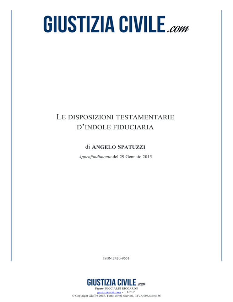 LE DISPOSIZIONI TESTAMENTARIE D’INDOLE FIDUCIARIA di ANGELO SPATUZZI Approfondimento del 29 Gennaio 2015 ISSN 2420-9651 Utente: RICCIARDI RICCARDO giustiziacivile.com - n. 1/2015 © Copyright Giuffrè 2015. Tutti i diritti riservati. P.IVA 00829840156 Approfondimento di Angelo Spatuzzi Di disposizione fiduciaria, o “fiducia testamentaria”, si è soliti parlare alludendo a quella particolare fattispecie in cui, di fianco alla designazione ex testamento di un erede o di un legatario (cd. fiduciari) sussista l’intesa che i beni così attribuiti vengano dal ricevente rivolti a beneficio di un diverso soggetto, cui realmente si intendeva indirizzare il lascito. Si assiste, pertanto, ad una divaricazione tra il dato formale e quello sostanziale giacché, pur se apparentemente le ultime volontà indicano un certo soggetto quale destinatario della delazione, in realtà questi non lo è in senso sostanziale e, del pari, chi si vuol davvero investire della chiamata a succedere formalmente non compare nel contenuto della scheda testamentaria. SOMMARIO: 1. Portata ed evoluzione della figura. - 2. Indole giuridica e collocazione sistematica. - 3. La strutturazione del fenomeno in termini di obbligazione naturale. Questioni connesse. - 4. Proprietà del fiduciario e negozio traslativo dei diritti. - 5. La previsione dell'art. 627, comma 3, quale argine agli intenti elusivi dei divieti sull'incapacità a ricevere. 2 Utente: RICCIARDI RICCARDO giustiziacivile.com - n. 1/2015 © Copyright Giuffrè 2015. Tutti i diritti riservati. P.IVA 00829840156 Approfondimento di Angelo Spatuzzi 1. Portata ed evoluzione della figura. Di disposizione fiduciaria, o “fiducia testamentaria”, si è soliti parlare alludendo a quella particolare fattispecie in cui, di fianco alla designazione ex testamento di un erede o di un legatario (cd. fiduciari) sussista l’intesa che i beni così attribuiti vengano dal ricevente rivolti a beneficio di un diverso soggetto, cui realmente si intendeva indirizzare il lascito [1]. Si assiste, pertanto, ad una divaricazione tra il dato formale e quello sostanziale giacché, pur se apparentemente le ultime volontà indicano un certo soggetto quale destinatario della delazione, in realtà questi non lo è in senso sostanziale e, del pari, chi si vuol davvero investire della chiamata a succedere formalmente non compare nel contenuto della scheda testamentaria [2]. La figura in analisi è attualmente disciplinata dall’art. 627 c.c. [3], ove si trova stabilito che resta impraticabile l’azione volta ad accertare che il destinatario di una data disposizione testamentaria non coincide con quello designato e ciò anche laddove sia direttamente il testamento a denunciare l’esistenza di una interposizione. A precorrere tale norma sono stati, in passato, gli artt. 809 codice alb. e 829 c.c. 1865 [4]. Quest’ultimo, ricalcando il contenuto del precedente, statuiva che non era ammessa alcuna prova che le disposizioni fatte in favore di persona dichiarata nel testamento fossero soltanto apparenti, e che invece investissero altra persona. Ne nacque un diffuso contendere sul piano interpretativo per decifrare l’effettivo senso della disposizione, trattandosi cioè di intendere se dal dettato della norma discendesse soltanto la preclusione ad avvalersi di prove per dimostrare in sede processuale l’esistenza di una disposizione fiduciaria oppure inibita dovesse reputarsi anche l’azione del terzo tesa a conclamare la segreta volontà del testatore. A giudizio di alcuni la negazione della prova relativa ad un diritto assumeva il valore di una implicita negazione anche dell’azione processuale, atteso che, non potendo le domande spiegate in un giudizio venir suffragate da prove, unico sostegno di ogni azione, non potevano che divenir suscettibili di rigetto [5]. Per tale strada divenne prevalente il convincimento che la fiducia testamentaria fosse priva di effetti quantunque l’erede o il legatario designati avessero spontaneamente confessato l’esistenza del vincolo fiduciario [6]. In diversa direzione, altri autori, muovendo da una separazione del problema della prova rispetto a quello dell’azione ed evidenziando l’esistenza di figure – quali i diritti soggetti a prescrizione breve – per le quali è dato agire giudizialmente pur senza 3 Utente: RICCIARDI RICCARDO giustiziacivile.com - n. 1/2015 © Copyright Giuffrè 2015. Tutti i diritti riservati. P.IVA 00829840156 Approfondimento di Angelo Spatuzzi l’ausilio di prove, giungevano a ritenere come il veto posto all’ammissibilità di sostegni probatori fosse inidoneo ad inibire l’istituito testamentario dal confessare la fiducia, finendo così per investire di un diritto processualmente azionabile il reale destinatario del lascito [7]. Nessuna indicazione veniva invece offerta dalla codificazione napoleonica, risultando però radicato, in dottrina come in giurisprudenza, il convincimento della invalidità delle disposizioni fiduciarie, attesa, per un verso, la loro incompatibilità col principio di certezza dei soggetti chiamati a succedere, cui si legava la nullità delle disposizioni rimesse all’arbitrio di un terzo e, per altro verso, l’esistenza di un divieto di testamenti orali predisposto con un’ordinanza del 1735 [8]. L’invalidità era invero concepita per le disposizioni in cui l’impegno fiduciario non fosse espressamente dichiarato, non investendo la stessa – salvo a riconoscere una sostituzione fedecommissaria vietata ex art. 896 cod. Nap. – quelle disposizioni apprestate col dichiarato incarico, per l’erede o il legatario, di custodire e amministrare i beni ricevuti onde poi restituirli, con la morte del testatore o dopo un certo tempo, alla persona espressamente indicata dal de cuius. A fronte, allora, di una disposizione fiduciaria (invalida), l’eredità finiva con l’essere attribuita all’erede legittimo, pur cogliendosi, da alcuni, l’opportunità di invocare la regola vitiatur sed n