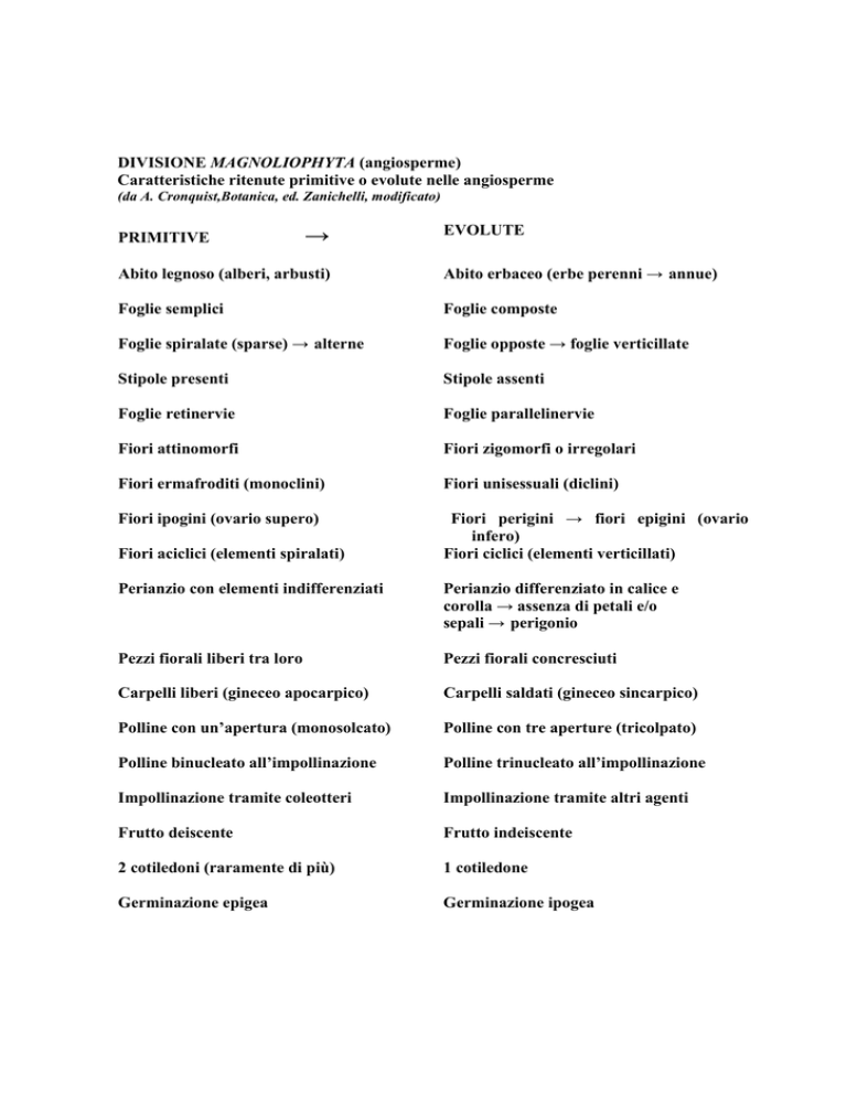 DIVISIONE MAGNOLIOPHYTA (angiosperme) Caratteristiche ritenute primitive o evolute nelle angiosperme (da A. Cronquist,Botanica, ed. Zanichelli, modificato) PRIMITIVE → EVOLUTE Abito legnoso (alberi, arbusti) Abito erbaceo (erbe perenni → annue) Foglie semplici Foglie composte Foglie spiralate (sparse) → alterne Foglie opposte → foglie verticillate Stipole presenti Stipole assenti Foglie retinervie Foglie parallelinervie Fiori attinomorfi Fiori zigomorfi o irregolari Fiori ermafroditi (monoclini) Fiori unisessuali (diclini) Fiori ipogini (ovario supero) Fiori perigini → fiori epigini (ovario infero) Fiori ciclici (elementi verticillati) Fiori aciclici (elementi spiralati) Perianzio con elementi indifferenziati Perianzio differenziato in calice e corolla → assenza di petali e/o sepali → perigonio Pezzi fiorali liberi tra loro Pezzi fiorali concresciuti Carpelli liberi (gineceo apocarpico) Carpelli saldati (gineceo sincarpico) Polline con un’apertura (monosolcato) Polline con tre aperture (tricolpato) Polline binucleato all’impollinazione Polline trinucleato all’impollinazione Impollinazione tramite coleotteri Impollinazione tramite altri agenti Frutto deiscente Frutto indeiscente 2 cotiledoni (raramente di più) 1 cotiledone Germinazione epigea Germinazione ipogea Caratteri distintivi tra dicotiledoni (Magnoliopsida) e monocotiledoni (Liliopsida) I caratteri riportati sono relativi alla tradizionale suddivisione delle angiosperme nelle due sole classi delle dicoltiledoni e monocotiledoni. Nessun carattere risulta esclusivo dell’una o dell’altra classe: occorre sempre osservare l'insieme dei caratteri. Classe Magnoliopsida (dicotiledoni) Classe Liliopsida (monocotiledoni) Apparato radicale seminale (radici a fittone ± ramificato) Radici avventizie presenti o meno Apparato radicale avventizio (radici fascicolate) Radici seminali assenti (abortiscono) Piante erbacee o legnose Piante quasi esclusivamente erbacee Struttura primaria del fusto eustelica (fasci collaterali aperti in anello) Struttura primaria del fusto atactostelica (fasci collaterali sparsi) Presenza di cambio cribro-vascolare e accrescimento secondario Mancano cambio cribro-vascolare e accrescimento secondario di tipo normale Foglie distinte in picciolo e lamina (vari tipi di attacco) Nervature reticolate Foglie senza distinzione in picciolo e lamina, attacco guainante Nervature parallele Perianzio distinto in calice (sepali) e corolla (petali) Perigonio (tepali) Fiori tetrameri o pentameri (verticilli di 4 o 5 pezzi) Fiori trimeri (verticilli di 3-6 pezzi) Seme e plantula con due cotiledoni Seme e plantula con un cotiledone chiusi ESEMPI DI FAMIGLIE DI DICOTILEDONI Fam. Ranunculaceae (ranuncolacee) Di interesse soprattutto filogenetico, comprende circa 2000 specie che conservano alcuni caratteri considerati primitivi. Le ranuncolacee sono diffuse soprattutto nelle zone temperate dell’emisfero boreale. Principalmente erbe, con foglie alterne e semplici; il genere Clematis (vitalba, clematidi) comprende specie lianose con foglie opposte e pennato-composte. Fiori attinomorfi o raramente zigomorfi (Aconitum), solitari o riuniti in infiorescenze definite. Stami numerosi, con filamenti liberi. Diffusa la presenza di nettàrii, che si possono trovare alla base dei petali (Ranunculus) o dei carpelli (Caltha); oppure i petali possono trasformarsi interamente in nettàrii e in questo caso è il calice a svolgere in tutto o in parte la funzione della corolla (Aquilegia, Delphinium, Eranthis, Helleborus, ecc.). Nei fiori delle ranuncolacee si possono riconoscere varie tappe evolutive. Da fiori con brattee che simulano un calice, calice petaloideo con numero variabile di elementi e petali assenti (Anemone) o con funzione di nettàri (Eranthis, Helleborus), si arriva a fiori con calice e corolla distinti (Ranunculus); da fiori aciclici (Helleborus, con tutti i pezzi fiorali a disposizione spiralata) si passa a fiori emiciclici (Anemone, Ranunculus, con elementi del perianzio verticillati e stami e carpelli spiralati), a fiori ciclici (Aquilegia, Nigella, con tutti elementi spiralati); da fiori con numero variabile di elementi (Anemone) a fiori con alcuni o tutti gli antofilli in numero fisso; da fiori con gineceo pluricarpellare apocarpico e carpelli spiralati (Ranunculus, Anemone, ecc.) a fiori con gineceo apocarpico e carpelli verticillati (Delphinium, Aconitum), fino a fiori con gineceo sincarpico (Nigella). Ovario sempre supero; impollinazione quasi esclusivamente entomofila, anemofila in alcuni Thalictrum. Frutto: in genere poliachenio o polifollicolo, raramente bacca. Frutti o semi leggeri o con strutture piumose (Anemone, Clematis) sono dispersi dal vento; è presente anche la zoocoria. Esempi: I generi Delphinium, Aconitum, Anemone, Ranunculus, Aquilegia, Adonis, Helleborus, Clematis, comprendono specie spontanee e specie coltivate come ornamentali. Hepatica triloba (erba trinità), Anemone nemorosa (anemone dei boschi), Aquilegia vulgaris (aquilegia) sono diffuse nel sottobosco di formazioni di latifoglie mesofile. Clematis vitalba (vitalba) è comune nei boschi e nelle fasi di degradazione o ricolonizzazione nella fascia delle latifoglie decidue submediterranee; Clematis flammula in boschi termofili. Molte ranuncolacee sono velenose a causa della presenza di alcaloidi, glucosidi, saponine; al genere Aconitum appartengono alcune delle specie più velenose della nostra flora spontanea. Fam. Fagaceae (fagacee) Famiglia di interesse prevalentemente forestale, comprende circa 900 specie legnose, tra cui alcuni degli alberi che dominano le foreste temperate dell’emisfero settentrionale. Molti dei boschi italiani di maggiore importanza fitogeografica e forestale sono formati da specie di questa famiglia. Il faggio (Fagus sylvatica) domina i boschi della fascia montana sia sulle Alpi che sugli Appennini (fascia delle faggete o faggete-abetine). Il castagno (Castanea sativa), originario di boschi misti mesofili 