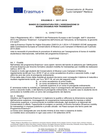 Conservatorio di Musica “Lucio Campiani” Mantova ERASMUS + 2017-2018 BANDO DI CANDIDATURA PER L'ASSEGNAZIONE DI BORSE ERASMUS PER TRAINEESHIP IL DIRETTORE Visto il Regolamento UE n. 1288/2013 del Parlamento Europeo e del Consiglio dell'11 dicembre 2013 che istituisce "Erasmus+: il programma dell'Unione per l'istruzione, la formazione, la gioventù e lo sport”; vista la Erasmus Charter for Higher Education 234513-LA-1-2014-1-IT-E4AKA1-ECHE assegnata dalla Commissione Europea al Conservatorio di Musica Lucio Campiani di Mantova per il periodo 2014-2020; vista la necessità di preordinare le procedure di selezione per l’assegnazione di borse di mobilità studentesca internazionale, nell’ambito del programma Erasmus+; DISPONE Art. 1 Finalità Nell’ambito del programma Erasmus+ sono aperti i termini del bando di selezione per l’attribuzione di borse Erasmus per tirocinio formativo (student mobility for traineeship) per mobilità da realizzarsi nell'a.a. 2017-18. Il bando è rivolto agli studenti del Conservatorio di Musica Lucio Campiani di Mantova regolarmente iscritti per l’a.a. 2016-17 ad un corso accademico di primo o secondo livello, o agli ultimi tre anni dei corsi di previgente ordinamento. Prima della data d’inizio della mobilità gli studenti dovranno aver conseguito il diploma di maturità e risultare regolarmente iscritti, per l’a.a. 2017-18, ad uno dei seguenti corsi: A. un corso accademico di primo livello; B. un corso accademico di secondo livello; C. il periodo superiore di un corso di previgente ordinamento. E’ ammessa inoltre la mobilità per traineeship dopo il conseguimento del diploma accademico di primo o secondo livello, o del diploma di previgente ordinamento. In questo caso lo studente dovrà concludere la mobilità entro un anno dal conseguimento del diploma. Art. 2 Obiettivi Obiettivo del Programma Erasmus+ è migliorare la qualità e rafforzare la dimensione europea dell'istruzione superiore, incoraggiando la cooperazione transnazionale fra imprese e istituti d'istruzione superiore, e promuovendo la mobilità individuale. Agli studenti e ai diplomati del Conservatorio è offerta l’opportunità di svolgere un periodo di tirocino formativo (Erasmus mobility for traineeship) in imprese pubbliche e private ubicate nei Paesi europei che fanno parte del Programma Erasmus+1. Le borse sono assegnate per una durata minima di due mesi e massima di dodici. La mobilità deve concludersi in ogni caso entro il 30 settembre 2018. 1 Belgio, Bulgaria, Repubblica Ceca, Danimarca, Germania, Estonia, Irlanda, Grecia, Spagna, Francia, Croazia, Cipro, Lettonia, Lituania, Lussemburgo, Ungheria, Malta, Paesi Bassi, Austria, Polonia, Portogallo, Romania, Slovenia, Slovacchia, Finlandia, Svezia, Regno Unito, ex Jugoslavia, Liechtenstein, Svizzera, Repubblica di Macedonia, Norvegia, Turchia, Islanda. Via della Conciliazione 33 – 46100 Mantova tel. +39 0376 324636 fax +39 0376 223202 email: [email protected] – website: www.conservatoriomantova.com Conservatorio di Musica “Lucio Campiani” Mantova Art. 3 Requisiti ulteriori Gli studenti devono dimostrare di avere un'adeguata conoscenza della lingua del paese ospitante, o della lingua richiesta dall'organizzazione ospitante. Durante il periodo di svolgimento della mobilità gli studenti non possono usufruire di altro contributo comunitario. Nell’ambito del programma Erasmus+ lo stesso studente può ricevere borse di studio per un totale di massimo 12 mesi per ogni ciclo di studi, indipendentemente dal numero e dal tipo di mobilità (studio o tirocinio). Precedenti esperienze nell’ambito del Programma LLP-Erasmus devono essere conteggiate per il raggiungimento del tetto massimo di 12 mesi. Sono esclusi dal bando gli studenti che in precedenza hanno rinunciato alla mobilità, nelle modalità previste dall'art.12. Art. 4 Attività di tirocinio Il tirocinio formativo (Erasmus traineeship) è un’attività di formazione che lo studente può svolgere presso qualsiasi organizzazione pubblica o privata attiva sul mercato del lavoro o nei campi dell'istruzione, della formazione e della gioventù. A titolo di esempio, sono eleggibili come sedi di tirocinio: – piccole, medie o grandi impresa, pubbliche o private; – enti pubblici a livello locale, regionale o nazionale; – organizzazioni del mondo del lavoro, associazioni professionali e dell'artigianato e organizzazioni sindacali; – istituti di ricerca; – fondazioni; – scuole o centri educativi di qualsiasi livello, compresa l'educazione degli adulti – organizzazioni non-profit, associazioni, ONG; – enti di orientamento professionale, consulenza professionale e servizi di informazioni. Non sono eleggibili le istituzioni comunitarie, incluse le Agenzie Europee, gli organismi che gestiscono programmi comunitari (al fine di evitare conflitti di interesse e/o doppi finanziamenti), le rappresentanze diplomatiche nazionali (ambasciate etc.) del Paese presso il quale lo studente è iscritto nonché́ quelle di origine/cittadinanza dello studente nel Paese ospitante; Sono invece eleggibili: – gli Uffici Relazioni Internazionali degli Istituti di istruzione superiore purché̀ l’attività̀ di formazione prevista durante il periodo di tirocinio sia chiaramente espressa nel Learning Agreement e non sia già̀ cofinanziata nell’ambito di altri programmi comunitari, in modo da evitare possibili conflitti di interesse e/o doppi finanziamenti; – altre rappresentanze o istituzioni pubbliche come gli istituti di cultura, le scuole, etc. a patto che sia garantito il principio di transnazionalità̀ (es.: lo studente acquisisce un know how diverso da quello che acquisirebbe con un tirocinio nel proprio Paese), in tal caso diventa responsabilità̀ dell’Istituto di appartenenza dello studente verificare e valutare se i criteri richiesti vengono soddisfatti. L’impegno orario dello studente nell’organizzazione ospitante deve essere conforme agli orari di lavoro i