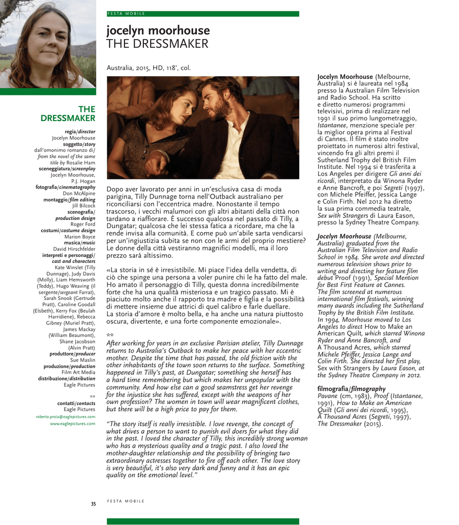 F E S TA M O B I L E jocelyn moorhouse THE DRESSMAKER Australia, 2015, HD, 118’, col. THE DRESSMAKER regia/director Jocelyn Moorhouse soggetto/story dall’omonimo romanzo di/ from the novel of the same title by Rosalie Ham sceneggiatura/screenplay Jocelyn Moorhouse, P.J. Hogan fotografia/cinematography Don McAlpine montaggio/film editing Jill Bilcock scenografia/ production design Roger Ford costumi/costume design Marion Boyce musica/music David Hirschfelder interpreti e personaggi/ cast and characters Kate Winslet (Tilly Dunnage), Judy Davis (Molly), Liam Hemsworth (Teddy), Hugo Weaving (il sergente/sergeant Farrat), Sarah Snook (Gertrude Pratt), Caroline Goodall (Elsbeth), Kerry Fox (Beulah Harridiene), Rebecca Gibney (Muriel Pratt), James Mackay (William Beaumont), Shane Jacobson (Alvin Pratt) produttore/producer Sue Maslin produzione/production Film Art Media distribuzione/distribution Eagle Pictures ** contatti/contacts Eagle Pictures Dopo aver lavorato per anni in un’esclusiva casa di moda parigina, Tilly Dunnage torna nell’Outback australiano per riconciliarsi con l’eccentrica madre. Nonostante il tempo trascorso, i vecchi malumori con gli altri abitanti della città non tardano a riaffiorare. È successo qualcosa nel passato di Tilly, a Dungatar; qualcosa che lei stessa fatica a ricordare, ma che la rende invisa alla comunità. E come può un’abile sarta vendicarsi per un’ingiustizia subita se non con le armi del proprio mestiere? Le donne della città vestiranno magnifici modelli, ma il loro prezzo sarà altissimo. «La storia in sé è irresistibile. Mi piace l’idea della vendetta, di ciò che spinge una persona a voler punire chi le ha fatto del male. Ho amato il personaggio di Tilly, questa donna incredibilmente forte che ha una qualità misteriosa e un tragico passato. Mi è piaciuto molto anche il rapporto tra madre e figlia e la possibilità di mettere insieme due attrici di quel calibro e farle duellare. La storia d’amore è molto bella, e ha anche una natura piuttosto oscura, divertente, e una forte componente emozionale». ** After working for years in an exclusive Parisian atelier, Tilly Dunnage returns to Australia’s Outback to make her peace with her eccentric mother. Despite the time that has passed, the old friction with the other inhabitants of the town soon returns to the surface. Something happened in Tilly’s past, at Dungatar; something she herself has a hard time remembering but which makes her unpopular with the community. And how else can a good seamstress get her revenge for the injustice she has suffered, except with the weapons of her own profession? The women in town will wear magnificent clothes, but there will be a high price to pay for them. [email protected] www.eaglepictures.com 35 “The story itself is really irresistible. I love revenge, the concept of what drives a person to want to punish evil doers for what they did in the past. I loved the character of Tilly, this incredibly strong woman who has a mysterious quality and a tragic past. I also loved the mother-daughter relationship and the possibility of bringing two extraordinary actresses together to fire off each other. The love story is very beautiful, it’s also very dark and funny and it has an epic quality on the emotional level.” F E S TA M O B I L E Jocelyn Moorhouse (Melbourne, Australia) si è laureata nel 1984 presso la Australian Film Television and Radio School. Ha scritto e diretto numerosi programmi televisivi, prima di realizzare nel 1991 il suo primo lungometraggio, Istantanee, menzione speciale per la miglior opera prima al Festival di Cannes. Il film è stato inoltre proiettato in numerosi altri festival, vincendo fra gli altri premi il Sutherland Trophy del British Film Institute. Nel 1994 si è trasferita a Los Angeles per dirigere Gli anni dei ricordi, interpretato da Winona Ryder e Anne Bancroft, e poi Segreti (1997), con Michele Pfeiffer, Jessica Lange e Colin Firth. Nel 2012 ha diretto la sua prima commedia teatrale, Sex with Strangers di Laura Eason, presso la Sydney Theatre Company. Jocelyn Moorhouse (Melbourne, Australia) graduated from the Australian Film Television and Radio School in 1984. She wrote and directed numerous television shows prior to writing and directing her feature film debut Proof (1991), Special Mention for Best First Feature at Cannes. The film screened at numerous international film festivals, winning many awards including the Sutherland Trophy by the British Film Institute. In 1994, Moorhouse moved to Los Angeles to direct How to Make an American Quilt, which starred Winona Ryder and Anne Bancroft, and A Thousand Acres, which starred Michele Pfeiffer, Jessica Lange and Colin Firth. She directed her first play, Sex with Strangers by Laura Eason, at the Sydney Theatre Company in 2012. filmografia/filmography Pavane (cm, 1983), Proof (Istantanee, 1991), How to Make an American Quilt (Gli anni dei ricordi, 1995), A Thousand Acres (Segreti, 1997), The Dressmaker (2015).