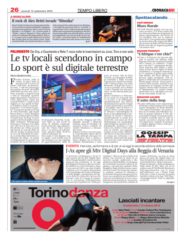 26 TEMPO LIBERO venerdì 12 settembre 2014 A MONCALIERI Spettacolando Il rock di Alex Britti invade “Ritmika” Ma chi l’ha detto che il blues serve solo per cantare la tristezza? Sicuramente non la pensa così Alex Britti. Il cantautore e chitarrista romano questa sera, dalle 22, sarà al 45°Nord di Moncalieri in via Postiglione 1 per il concerto gratuito di “Ritmika”. L’autore di “Oggi sono io” è felice, o almeno così sembra. Per rendersene conto basta ascoltare di “Bene così”, la canzone uscita in queste settimane che dà anche il titolo all’ultimo album del Jimy Hendrix di Roma. Felicità, secondo Alex Britti, non è sinonimo di frivolezza. La chitarra CAFÈ NERUDA Blues Rurale di Alex emerge più forte e malinconica che mai. Abbandonati i toni leggeri dei successi pop, Britti si è “riconvertito” al suo primo amore: il rock. La chitarra acustica viene messa in soffitta o quasi e comunque farà rare apparizioni. Alex dimostrerà la propria abilità come chitarrista elettrico, anche se per gli appassionati, non è certo una novità. Un vero e proprio “manico”, come si dice in gergo. Ce n’è abbastanza per far ballare il pubblico senza sosta, almeno un’ora e mezza. [g.m.] ÔIl Cafè Neruda riparte con un concerto acustico. È il blues rurale del trio Demontis-Rainero-Scagliarini il primo appuntamento del locale di via Giachino 28/e per la stagione 2014-2015. Uno spettacolare viaggio in musica fino alle origini del blues che portano al delta del Mississippi. Prime note alle 22. Ingresso gratuito con tessera Arci. PALINSESTO Da Grp, a Quartarete a Rete 7: ecco tutte le trasmissioni su Juve, Toro e non solo Le tv locali scendono in campo Lo sport è sul digitale terrestre Marco Spadavecchia F ischio d’inizio, palla al centro. In gioco tutta la passione per il calcio sul manto dell’etere piemontese. In onda, i volti dei personaggi che parlano di sport, all’ombra della Mole ma non solo. Juve e Toro, in primis, a seguire le big e tutte le discipline sportive legate alla regione. Forza Juve è l’urlo della prima serata del venerdì di Rete 7, canale 12 del digitale, le voci quelle di Marco Venditti e Franco Leonetti. È grande e “ti fa tremar le gambe” la passione granata sul ring di Toro Scatenato, agli angoli Hervè Bricca e Gino Strippoli insieme ai tanti ospiti in studio il lunedì sera. No stop, le news sportive di Nicola Gallo e dei tg della redazione Videogruppo Piemonte e Torinow, sui canali 18 e 199. Juve & Toro news è il filo diretto con i tifosi, in onda dal lunedì al venerdì dalle 16 alle 18, mentre la prima serata si vive con Tuttoderby il venerdì, in studio Marcello Chirico e Massimo De Marzi. Al canale 11 di Quarterete Tv prende vita il battito dei Cuori Bianconeri Le redazioni delle tv locali sono pronte per scendere in campo di Giancarla Tenivella, il giovedì dalle 21 alle 22.30, in attesa di definire l’appuntamento riservato agli appassionati del Torino (Toro amore mio= e la striscia di informazione sportiva delle 19.30 in coda al notiziario T4. Sul canale 13 del digitale, Grp tv regala i suoi lunedì sera al tifo torinista con una tripletta di approfondimenti, dalle 20 alle 23.30: i Ragazzi del Fila, Orgoglio Granata e Memorie Granata, spazi di attualità e di memoria storica condotti da Astrid J Bauducco e Alessandro Costa. Sempre su Grp e sui suoi canali, la produzione Mopi offre le finestre dedicate allo sport dilettantistico, Pane e Calcio e Pane e Basket con la Pms Basketball. Primantenna è Area TO Goal, lo storico talk di Clara Vercelli, in compagnia di Beppe Gandolfo e degli avvocati Antonio Foti, Francesco Paulicelli e Vilmer Perga, con Carlo Buonerba, Filippo De Lucia e un ricco parterre, dal 3 ottobre e tutti i venerdì sera alla posizione 14 del telecomando piemontese. Sport e territorio su Telecupole, al canale 15: il lunedì sera c’è la serie A di Pallapugno, quotidianamente una striscia di informazione sportiva legata al calcio piemontese, ma anche a discipline come le bocce e i motori. Oltre i confini regionali, Telecity e Telesubalpina offrono ai loro affezionati le produzioni di 7Gold e Telenova, rispettivamente ai canali 10 e 16 del dtt, così come sul 18 di Videogruppo con i programmi della redazione sportiva di Telelombardia, Antenna 3 e Top Calcio 24. Ardore e fede calcistica in diretta, una passione sempre accesa come i riflettori del calcio e le luci dei salotti tv, in campo per informare e intrattenere, attaccando gli spazi dei cuori dei tanti amanti del nostro pallone. REGIONE PIEMONTE “L’Afrique c’est chic!” ÔL’arte e la fantasia dei giovani africani in mostra nel palazzo della Regione Piemonte in piazza Castello 165 a Torino. La collettiva “L’Afrique c’est chic!”, organizzata da Missione Giovani Fma Onlus e Salesiane di Don Bosco Figlie di Maria Ausiliatrice, si inaugura domani alle 17, ospitata al primo piano della Sala Mostre. Sei Paesi africani, 14 giovani artisti emergenti, 250 ragazze in difficoltà che riscoprono la libertà grazie all’arte. Sono questi i numeri della mostra, inserita in un programma di sostegno rivolto alle ragazze vittime della violenza e dello sfruttamento. La mostra resterà aperta fino al 21 settembre con orario di visita dalle 10 alle 19. MIRAFIORI GALERIE Il mito della Jeep ÔIl mito della Jeep come espressione di libertà e sfide estreme rivive nella mostra fotografica di Paolo Baraldi “The spirit of freedom” da stasera e fino al 19 ottobre alla Mirafiori Galerie di piazza Cattaneo 9. Più che un semplice brand, con questi scatti, il famoso modello noto in tutto il mondo, racconta il classico stile di vita americano, simbolo di potenza e solidità. Ingresso libero, tutti giorni dalle 9 alle 20. EVENTO Interviste, performance e dj set: al via oggi la seconda edizione della kermesse J-Ax apre gli Mtv Digital Days alla Reggia di Venaria J-Ax sarò lo starter della manifestazione Ô Interviste, performance e dj set. È tutto pronto per gl