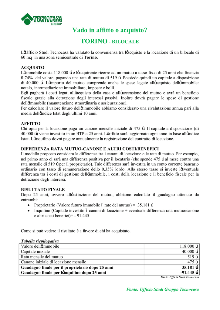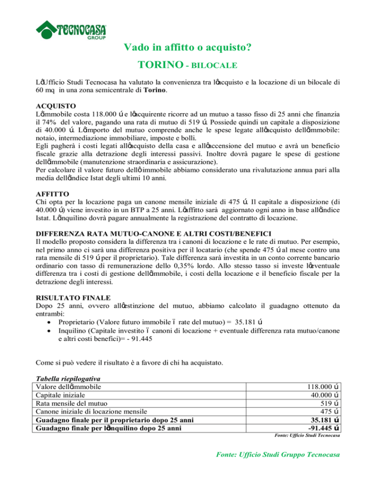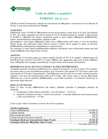 Vado in affitto o acquisto? TORINO - BILOCALE L’Ufficio Studi Tecnocasa ha valutato la convenienza tra l’acquisto e la locazione di un bilocale di 60 mq in una zona semicentrale di Torino. ACQUISTO L’immobile costa 118.000 € e l’acquirente ricorre ad un mutuo a tasso fisso di 25 anni che finanzia il 74% del valore, pagando una rata di mutuo di 519 €. Possiede quindi un capitale a disposizione di 40.000 €. L’importo del mutuo comprende anche le spese legate all’acquisto dell’immobile: notaio, intermediazione immobiliare, imposte e bolli. Egli pagherà i costi legati all’acquisto della casa e all’accensione del mutuo e avrà un beneficio fiscale grazie alla detrazione degli interessi passivi. Inoltre dovrà pagare le spese di gestione dell’immobile (manutenzione straordinaria e assicurazione). Per calcolare il valore futuro dell’ immobile abbiamo considerato una rivalutazione annua pari alla media dell’indice Istat degli ultimi 10 anni. AFFITTO Chi opta per la locazione paga un canone mensile iniziale di 475 €. Il capitale a disposizione (di 40.000 €) viene investito in un BTP a 25 anni. L’affitto sarà aggiornato ogni anno in base all’indice Istat. L’inquilino dovrà pagare annualmente la registrazione del contratto di locazione. DIFFERENZA RATA MUTUO-CANONE E ALTRI COSTI/BENEFICI Il modello proposto considera la differenza tra i canoni di locazione e le rate di mutuo. Per esempio, nel primo anno ci sarà una differenza positiva per il locatario (che spende 475 € al mese contro una rata mensile di 519 € per il proprietario). Tale differenza sarà investita in un conto corrente bancario ordinario con tasso di remunerazione dello 0,35% lordo. Allo stesso tasso si investe l’eventuale differenza tra i costi di gestione dell’immobile, i costi della locazione e il beneficio fiscale per la detrazione degli interessi. RISULTATO FINALE Dopo 25 anni, ovvero all’estinzione del mutuo, abbiamo calcolato il guadagno ottenuto da entrambi: · Proprietario (Valore futuro immobile – rate del mutuo) = 35.181 € · Inquilino (Capitale investito – canoni di locazione + eventuale differenza rata mutuo/canone e altri costi benefici)= - 91.445 Come si può vedere il risultato è a favore di chi ha acquistato. Tabella riepilogativa Valore dell’immobile Capitale iniziale Rata mensile del mutuo Canone iniziale di locazione mensile Guadagno finale per il proprietario dopo 25 anni Guadagno finale per l’inquilino dopo 25 anni 118.000 € 40.000 € 519 € 475 € 35.181 € -91.445 € Fonte: Ufficio Studi Tecnocasa Fonte: Ufficio Studi Gruppo Tecnocasa TORINO - TRILOCALE L’Ufficio Studi Tecnocasa ha valutato la convenienza tra l’acquisto e la locazione di un trilocale di 85 mq in una zona semicentrale di Torino. ACQUISTO L’immobile costa 200.000 € e l’acquirente ricorre ad un mutuo a tasso fisso di 25 anni che finanzia il 70% del valore, pagando una rata di mutuo di 834 €. Possiede quindi un capitale a disposizione di 75.000 €. L’importo del mutuo comprende anche le spese legate all’acquisto dell’immobile: notaio, intermediazione immobiliare, imposte e bolli. Egli pagherà i costi legati all’acquisto della casa e all’accensione del mutuo e avrà un beneficio fiscale grazie alla detrazione degli interessi passivi. Inoltre dovrà pagare le spese di gestione dell’immobile (manutenzione straordinaria e assicurazione). Per calcolare il valore futuro dell’ immobile abbiamo considerato una rivalutazione annua pari alla media dell’indice Istat degli ultimi 10 anni. AFFITTO Chi opta per la locazione paga un canone mensile iniziale di 625 €. Il capitale a disposizione (di 75.000 €) viene investito in un BTP a 25 anni. L’affitto sarà aggiornato ogni anno in base all’indice Istat. L’inquilino dovrà pagare annualmente la registrazione del contratto di locazione. DIFFERENZA RATA MUTUO-CANONE E ALTRI COSTI/BENEFICI Il modello proposto considera la differenza tra i canoni di locazione e le rate di mutuo. Per esempio, nel primo anno ci sarà una differenza positiva per il locatario (che spende 625 € al mese contro una rata mensile di 834 € per il proprietario). Tale differenza sarà investita in un conto corrente bancario ordinario con tasso di remunerazione dello 0,35% lordo. Allo stesso tasso si investe l’eventuale differenza tra i costi di gestione dell’immobile, i costi della locazione e il beneficio fiscale per la detrazione degli interessi. RISULTATO FINALE Dopo 25 anni, ovvero all’estinzione del mutuo, abbiamo calcolato il guadagno ottenuto da entrambi: · Proprietario (Valore futuro immobile – rate del mutuo) = 73.642 € · Inquilino (Capitale investito – canoni di locazione + eventuale differenza rata mutuo/canone e altri costi benefici = -13.962 Come si può vedere il risultato è a favore di chi ha acquistato. Tabella riepilogativa Valore dell’immobile Capitale iniziale Rata mensile del mutuo Canone iniziale di locazione mensile Guadagno finale per il proprietario dopo 25 anni Guadagno finale per l’inquilino dopo 25 anni 200.000 € 75.000 € 834 € 625 € 73.642 € -13.962 € Fonte: Ufficio Studi Tecnocasa Fonte: Ufficio Studi Gruppo Tecnocasa