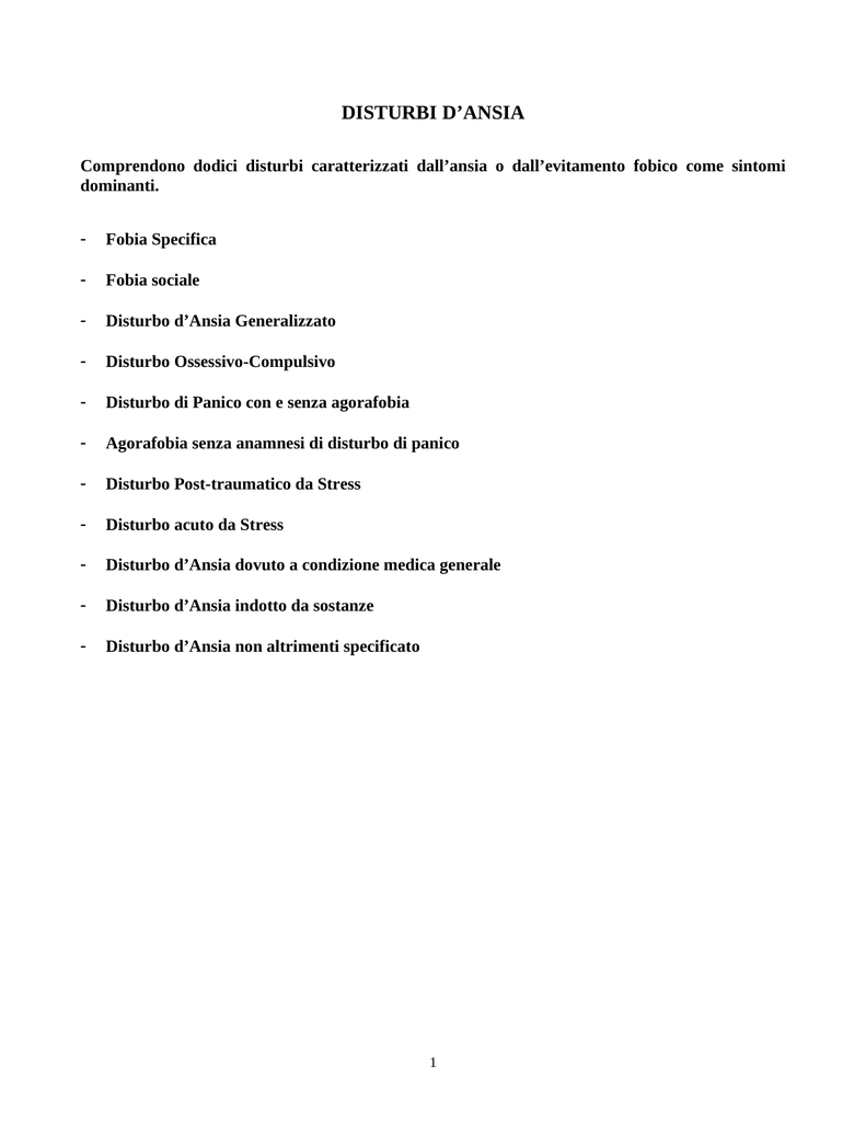 DISTURBI D’ANSIA Comprendono dodici disturbi caratterizzati dall’ansia o dall’evitamento fobico come sintomi dominanti. - Fobia Specifica - Fobia sociale - Disturbo d’Ansia Generalizzato - Disturbo Ossessivo-Compulsivo - Disturbo di Panico con e senza agorafobia - Agorafobia senza anamnesi di disturbo di panico - Disturbo Post-traumatico da Stress - Disturbo acuto da Stress - Disturbo d’Ansia dovuto a condizione medica generale - Disturbo d’Ansia indotto da sostanze - Disturbo d’Ansia non altrimenti specificato 1 FOBIA SPECIFICA Diagnosi DSM-IV La fobia specifica si caratterizza per una marcata e persistente paura, eccessiva o irragionevole, provocata dalla presenza o dall’attesa di un oggetto o di una situazione specifici (per es. animali, sangue, volare, altezze) [criterio A]. L’esposizione allo stimolo fobico provoca un’immediata risposta ansiosa che può sfociare in un attacco di panico situazionale (nei bambini l’ansia può essere espressa tramite pianti, scoppi d’ira, irrigidimenti, o aggrappandosi) [criterio B]. La persona, non necessariamente i bambini, riconosce che le paure sono eccessive ed irragionevoli [criterio C]. Le situazioni fobiche vengono evitate o sopportate con intenso disagio [criterio D], e l’evitamento o il disagio collegato alle situazioni temute deve significativamente interferire con il funzionamento lavorativo, sociale o deve essere presente marcato disagio per il fatto di soffrire di questo disturbo [criterio E]. La durata del disturbo nei minori deve essere di almeno 6 mesi [criterio F]; infine, il disturbo non deve essere meglio giustificato da altro disturbo mentale o da una condizione medica generale o dall’assunzione di sostanze [criterio G]. [Fonte: adattamento da Mini DSM-IV, Masson: Milano, 1997, pag. 226-228]. Le fobie specifiche sono dunque comportamenti di evitamento di cose o situazioni specifiche che attivano un’ansia sproporzionata e irragionevole. Possono essere divise in sottotipi a seconda della fonte della paura, e il loro contenuto può variare nelle varie culture. Sono esperienze comuni e ubiquitarie che spesso non creano un problema tale da richiedere un trattamento. Importante per il discrimine fra normalità e patologia e quindi per considerare questi comportamenti come un disturbo psicologico è il criterio E. La teoria psicoanalitica spiega la fobia specifica come conseguenza dello spostamento (meccanismo di difesa) dell’angoscia segnale su oggetti o situazioni che hanno una relazione simbolica con la situazione traumatica rimossa, in questo modo il pericolo viene fronteggiato con l’evitamento, e viene rafforzata la rimozione della situazione originaria fonte dell’ansia (vedi il caso del piccolo Hans descritto da Freud). Le teorie comportamentali considerano le fobie specifiche come comportamenti appresi mediante condizionamento classico, operante e imitazione di modelli. La teoria del condizionamento all’evitamento ritiene che la fobia si sviluppi attraverso due processi di apprendimento interconnessi, un iniziale condizionamento classico che porta ad associare un evento che produce dolore o paura ad uno stimolo neutro e un successivo condizionamento operante all’evitamento con rinforzo positivo determinato dalla conseguente riduzione dell’ansia. Gli studi clinici e sperimentali basati su questa teoria hanno prodotto dati molto contrastanti (vedi Davison e Neale, pag. 129-132) che suggeriscono il coinvolgimento anche di processi di diverso tipo. La teoria dell’apprendimento vicario, considera all’origine delle fobie l’osservazione delle reazioni di paura degli altri o la descrizione di ciò che potrebbe accadere. Anche in questo caso non si tratta di un modello esplicativo valido per tutte le fobie, perché non tutti i fobici riferiscono di avere assistito ad esperienze spiacevoli di altre persone, e molte persone che vi hanno assistito non sviluppano fobie. Le teorie cognitive sull’origine delle fobie danno rilievo al fatto che le persone che sviluppano fobie o altri disturbi d’ansia, a differenza di quelle che non le sviluppano avrebbero una spiccata tendenza a prestare attenzione agli stimoli negativi e una più alta aspettativa sul verificarsi di eventi negativi nel futuro. 2 FOBIA SOCIALE Diagnosi DSM-IV La fobia sociale si contraddistingue per una paura marcata e persistente nei confronti di situazioni sociali o prestazioni che comportano l’esposizione a persone non familiari o il possibile giudizio di altri. In tali situazioni la persona teme di mostrare ansia o di agire in modo umiliante ed imbarazzante (nei bambini deve essere presente la capacità di stabilire rapporti appropriati all’età con persone familiari, e l’ansia deve manifestarsi nell’interazione con i coetanei e non solo con gli adulti) [criterio A]. L’esposizione alla situazione temuta causa ansia che può assumere le forme dell’attacco di panico causato o sensibile alla situazione (nei bambini l’ansia può essere espressa con pianti, scoppi d’ira o irrigidimento) [criterio B]. La persona adulta, non necessariamente i bambini, riconosce che la paura è eccessiva o irragionevole [criterio C]. Le situazioni temute sono evitate o sopportate con intensa ansia o disagio [criterio D] e l’evitamento delle situazioni, l’ansia anticipatoria o il disagio provato nelle situazioni sociali o prestazionali interferiscono significativamente con il funzionamento lavorativo (o scolastico), o con le attività e le relazioni sociali, oppure è presente marcato disagio per il fatto di avere la fobia [criterio E]. Il disturbo, nei minori, deve essere presente da almeno sei mesi [criterio F]. La fobia non deve essere giustificabile dall’assunzione di sostanze o da una condizione medica generale, o da una diverso disturbo mentale [criterio G], e nel caso fossero presenti altri disturbi mentali (ad es. un disturbo della comunicazione) o una condizione medica generale compromessa (ad es. il tremore nella malattia
