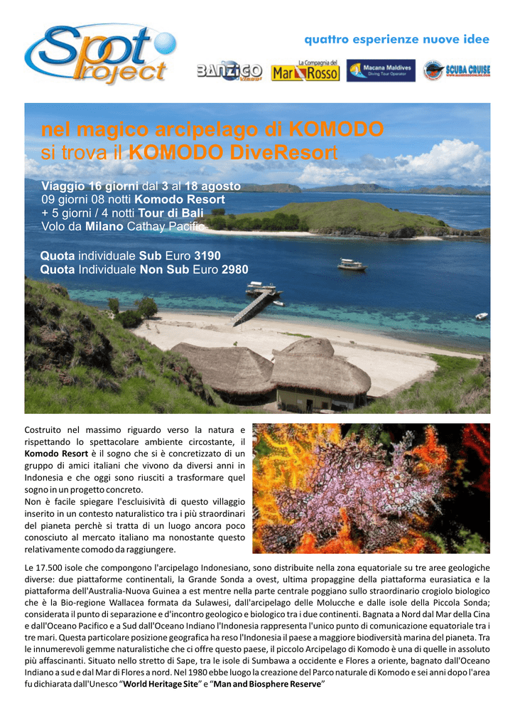 quattro esperienze nuove idee nel magico arcipelago di KOMODO si trova il KOMODO DiveResort Viaggio 16 giorni dal 3 al 18 agosto 09 giorni 08 notti Komodo Resort + 5 giorni / 4 notti Tour di Bali Volo da Milano Cathay Pacific Quota individuale Sub Euro 3190 Quota Individuale Non Sub Euro 2980 Costruito nel massimo riguardo verso la natura e rispettando lo spettacolare ambiente circostante, il Komodo Resort è il sogno che si è concretizzato di un gruppo di amici italiani che vivono da diversi anni in Indonesia e che oggi sono riusciti a trasformare quel sogno in un progetto concreto. Non è facile spiegare l'escluisività di questo villaggio inserito in un contesto naturalistico tra i più straordinari del pianeta perchè si tratta di un luogo ancora poco conosciuto al mercato italiano ma nonostante questo relativamente comodo da raggiungere. Le 17.500 isole che compongono l'arcipelago Indonesiano, sono distribuite nella zona equatoriale su tre aree geologiche diverse: due piattaforme continentali, la Grande Sonda a ovest, ultima propaggine della piattaforma eurasiatica e la piattaforma dell'Australia-Nuova Guinea a est mentre nella parte centrale poggiano sullo straordinario crogiolo biologico che è la Bio-regione Wallacea formata da Sulawesi, dall'arcipelago delle Molucche e dalle isole della Piccola Sonda; considerata il punto di separazione e d'incontro geologico e biologico tra i due continenti. Bagnata a Nord dal Mar della Cina e dall'Oceano Pacifico e a Sud dall'Oceano Indiano l'Indonesia rappresenta l'unico punto di comunicazione equatoriale tra i tre mari. Questa particolare posizione geografica ha reso l'Indonesia il paese a maggiore biodiversità marina del pianeta. Tra le innumerevoli gemme naturalistiche che ci offre questo paese, il piccolo Arcipelago di Komodo è una di quelle in assoluto più affascinanti. Situato nello stretto di Sape, tra le isole di Sumbawa a occidente e Flores a oriente, bagnato dall'Oceano Indiano a sud e dal Mar di Flores a nord. Nel 1980 ebbe luogo la creazione del Parco naturale di Komodo e sei anni dopo l'area fu dichiarata dall'Unesco “World Heritage Site” e “Man and Biosphere Reserve” PROGRAMMA VIAGGIO Venerdì 03 Partenza da Milano con volo Cathay via Hong Kong Sabato 04 Arrivo a Denpasar assistenza e trasferimento presso Ramada Benoa 5* B/B Domenica 05 Trasferimento aeroporto. Volo interno per Labuan Bajo. Assistenza aeroporto e trasferimento in barca al Komodo Resort (1 ora) Da domenica 05 a domenica 12 8 pernottamenti al Komodo Dive Resort Lunedì 13 Assistenza e trasferimento in barca da Resort a Labuan Bajo. Volo interno Labuan Bajo Denpasar (Bali). Assistenza in aeroporto per Tour Bali Da lunedì 13 a venerdì 17 Tour Bali come da programma Venerdì 17 fine del Tour. Trasferimento in aeroporto per volo Cathay Pacific Denpasar – Hong Kong – Milano Sabato 18 arrivo a Milano in prima mattinata (vedi operativi) Il programma non prevede possibilità di modifiche in quanto strutturato con blocco posti sul volo Cathay Pacific da Milano e dei servizi locali LA QUOTA COMPRENDE Volo di linea Cathay Pacific in classe N/economy via Hong Kong da Milano Supplemento Alta Stagione aerea Franchigia bagaglio 30 kg. per volo intercontinentale Tutti i trasferimenti Volo interno Denpasar-Labuan Bajo A/R 1 notte in andata a Bali Hotel Ramada Benoa 5* pernottamento in camera doppia e prima colazione 8 pernonottamenti al Komodo Resort in pensione completa in camera doppia + acqua, the e caffè. Altre bevande escluse. Per sub pacchetto 14 immersioni Tour Bali 5 giorni 4 notti con guida lingua italiana o inglese Trasferimenti con minibus con autista Pernottamenti in hotel cat. Superior B/B in camera doppia Tutti i pranzi tranne giorno 1 e 5. Cena il giorno 2 (vedere programma Tour) Ingressi nelle località turistiche - Donazioni villaggi LA QUOTA NON COMPRENDE Tasse aeree intercontinentali circa 290 euro Voli avvicinamento a Milano da 180 euro (su richiesta) Assicurazione annullamento viaggio Visto consolare Indonesia 25 $ da pagare in loco Tasse aerop. internazionali circa 13 euro da pagare in loco in moneta locale Tasse aerop. nazionali in uscita 4 euro da pagare in loco moneta locale Escursione isola di Rinca (Varani di Komodo) 30 euro da pagare in loco Tour Bali Spese personali, mance e bevande che non siano acqua ai pasti I pasti non indicati come compresi (quindi 3 pranzi e 3 cene non compresi) SUPPLEMENTI E RIDUZIONI RESORT Supplemento camera singola 33 euro al giorno Riduzione terzo letto 28 euro al giorno Riduzione bambini da 7 a 12 anni – 50% servizi resort Riduzione bambini da 0 a 6 anni free per servizi resort Supplemento camera singola Tour Bali 190 euro totali TASSE PARCO KOMODO (da pagare in loco) Tasse Parco Marino Komodo solo per divers 40 euro Tassa Parco Marino valida per tutti i non divers 30 euro Tassa escursione draghi di Komodo 12 euro Mance ed extra di carattere personale OPERATIVI AEREI CATHAY PACIFIC 03 Agosto - Italia – HongKong 13.25 – 07.00 04 Agosto - HongKong – Denpasar 10.20 – 14.55 17 Agosto - Denpasar – HongKong 16.05 – 20.50 18 Agosto - HongKong – Italia 00.45 – 07.50 CATHAY PACIFIC - La quota sopraindicata è calcolata considerando voli Cathay Pacific da Milano Malpensa via Hong Kong in classe N. VOLI INTERNI - Le maggiori compagnie aeree locali che operano sulla tratta Denpasar - Labuan Bajo sono Transmusa, Merpati e Lion Air. I costi della biglietteria e gli orari di volo possono variare senza preavviso pertanto la quota definitiva e l'orario di partenza potranno essere comunicati soltanto all'atto della conferma. La quota volo che abbiamo considerato è quella pubblicata. FRANCHIGIA BAGAGLIO VOLI INTERNI - Franchigia bagaglio 15 kg. Il costo dell'eccedenza è di circa 1,30 euro per chilo per tratta. Da saldare in loco. CAMBIO DOLLARO La quota di partecipazione è calcolata in base al cambio 1.00 Euro = 1.30 USD e nel caso di variazione del tasso di cambio superiore al 3% rispetto alla parità 