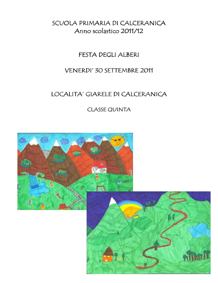 SCUOLA PRIMARIA DI CALCERANICA Anno scolastico 2011/12 FESTA DEGLI ALBERI VENERDI’ 30 SETTEMBRE 2011 LOCALITA’ GIARELE DI CALCERANICA CLASSE QUINTA NEL BOSCO Io nel bosco fitto fitto Mi ci butto a capofitto, E sai che cosa trovo? Un bell’uovo! Forse di pernice, È in mezzo a una radice. Da lontano arriva un canto, Io lo ascolto e mi incanto, potrebbe esser di un uccello appoggiato a un ramoscello. Ecco uno scoiattolo, che mangia delle noci Lui non vuole sentir voci. D’un tratto cala la notte, Ho sensazione che qualcuno mi prenda a botte Sento versi di civetta, Vedo occhi gialli che mi guardano a distanza stretta. Finalmente di nuovo sorge il sole, Vedo una volpe con la sua prole. Poi vedo di nuovo Quel piccolo uovo, Lì c’è un uccello Che s’abbevera al ruscello Lui s’avvicina All’uovo, nella tana piccolina. Era suo quell’uovo bello, era di un fringuello. Federico e Liam IL BOSCO IL BOSCO CON I SUOI ALBERI ASSOMIGLIA A TANTE PICCOLE VERDI CASETTE, GLI ABETI E I PINI SONO COME GRATTACIELI. IL BOSCO E' COME UN PAESE. IL BOSCO HA MOLTI ABITANTI GRANDI E PICCINI: SCOIATTOLI, PICCHI, CERVI E CAPRIOLI. IL BOSCO E' COME UN PAESE. IL BOSCO HA TANTI SEGRETI: FUNGHI, FIORI, PICCOLE BACCHE, MUSCHI, LICHENI, SASSI E PICCOLI TESORI SCONOSCIUTI. GLI ALBERI SONO SONO NOSTRI AMICI E NON DOBBIAMO MAI DIMENTICARLI. Angelica e Valentina Asia LE STAGIONI DEL BOSCO Nel bosco in inverno è piuttosto freddino, ma il legno per noi arde nel camino. In primavera sbocciano i fiori; gli alberi diventano di tutti i colori. D'estate c'è il sole che picchia in testa, per gli alberi è tempo di festa. In autunno l'albero si spoglia e di un piatto di funghi fa venir voglia. Silenzio, buon odore, cinguettii regnano certo nel bosco ch'è qui. Pamela e Chiara NEL BOSCO In un bosco lontano lontano Sotto il candore della montagna C’era una casa piccina piccina Dove un uomo felice abitava. In quel bosco vivevan scoiattoli Cervi merli e tanti animali. Come un giardino quel bosco era pulito! Nessun sporcava Nessun bruciava E il bosco felice viveva. C’erano larici, faggi e castagni Tutto era bello, lindo e soleggiato. Tanti sapori, odori e silenzio Regnavan nel bosco insieme alla quiete. Com’era bello viver nel bosco! Martino e Kristian IL MIO AMICO ALBERO Il mio amico albero sulla montagna innevata felice se ne sta, regalando ossigeno a chi non ce l'ha. Le sue stagioni sono un po' strambe si spoglia quando fa freddo,si riveste quando è caldo, non si mette mai i pantaloni perché non ha gambe. Sui suoi lunghi rami si posan gli uccellini, gli scoiattoli nel suo tronco, le lucertole sulle radici dormon felici. Questa creatura va rispettata non va rovinata né bruciata, ogni rametto è pieno di vita non va sfiorato, né toccato con le dita. Quando lo abbraccio mi sento protetto, quando lo vedo triste corro in soccorso, quando è piccolino lo aiuto a crescere, quando grande sarà diventerà il mio secondo papà. La grande foresta è il polmone del mondo, se viene tagliata l' aria pulita non esisterà più, per vivere ancora non tagliatene più. Gli alberi sono come degli amici vanno aiutati per essere felici, con questa poesia ho trovato un nuovo amico: non soffre il freddo ne il caldo, non ha braccia ne gambe, non può vendicarsi, ma soffre in silenzio. Dobbiamo aiutare con impegno e fedeltà il nostro amico albero che sempre ci aiuterà. Noemi e Michelle LA FESTA DEGLI ALBERI Il bosco per ogni bambino è un posto incantato. Ci sono scoiattoli, gufi e un pipistrellino. Gli uccellini cinguettano allegramente e il tempo scorre velocemente. Gli alberi sono tutti amici e riparano piccoli animaletti. Le persone del bosco vedono un bel panorama e fanno festa. Le fragoline e i mirtilli subito faccio sparire. Alla festa degli alberi mangiano tutti allegramente ed i giochi iniziano finalmente. Alessio, Fabrizio e Nicola