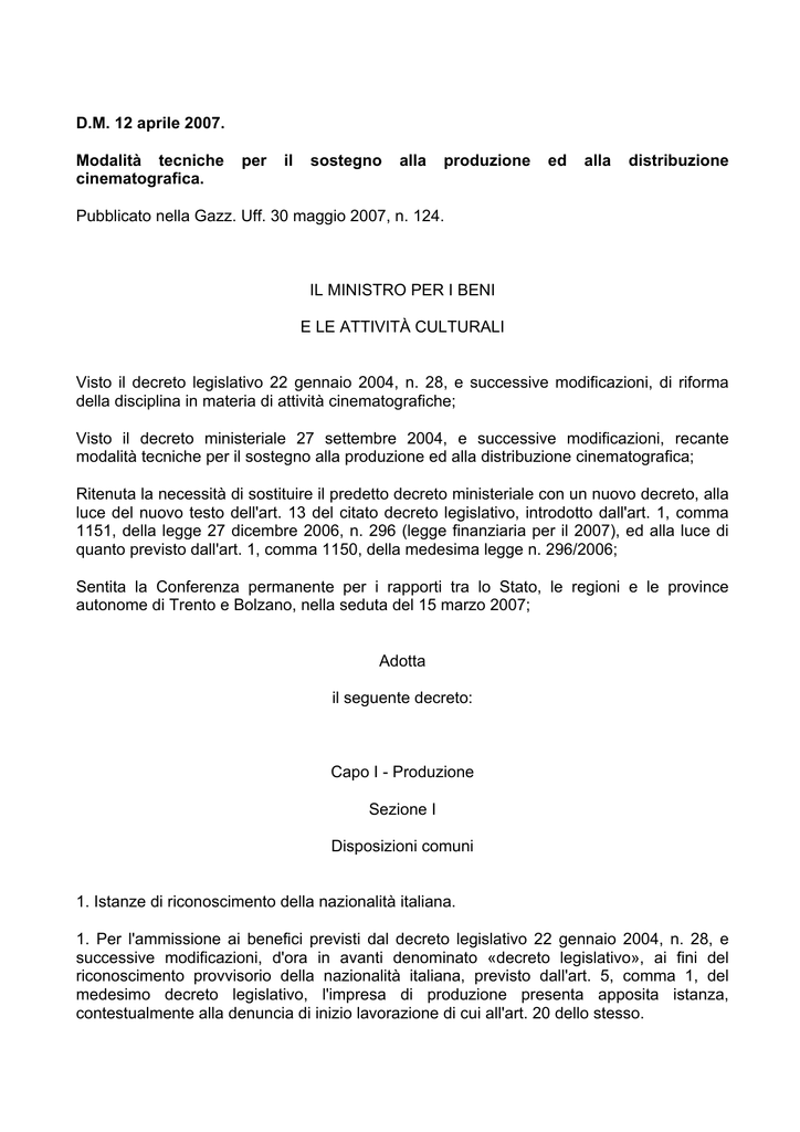 D.M. 12 aprile 2007. Modalità tecniche cinematografica. per il sostegno alla produzione ed alla distribuzione Pubblicato nella Gazz. Uff. 30 maggio 2007, n. 124. IL MINISTRO PER I BENI E LE ATTIVITÀ CULTURALI Visto il decreto legislativo 22 gennaio 2004, n. 28, e successive modificazioni, di riforma della disciplina in materia di attività cinematografiche; Visto il decreto ministeriale 27 settembre 2004, e successive modificazioni, recante modalità tecniche per il sostegno alla produzione ed alla distribuzione cinematografica; Ritenuta la necessità di sostituire il predetto decreto ministeriale con un nuovo decreto, alla luce del nuovo testo dell'art. 13 del citato decreto legislativo, introdotto dall'art. 1, comma 1151, della legge 27 dicembre 2006, n. 296 (legge finanziaria per il 2007), ed alla luce di quanto previsto dall'art. 1, comma 1150, della medesima legge n. 296/2006; Sentita la Conferenza permanente per i rapporti tra lo Stato, le regioni e le province autonome di Trento e Bolzano, nella seduta del 15 marzo 2007; Adotta il seguente decreto: Capo I - Produzione Sezione I Disposizioni comuni 1. Istanze di riconoscimento della nazionalità italiana. 1. Per l'ammissione ai benefici previsti dal decreto legislativo 22 gennaio 2004, n. 28, e successive modificazioni, d'ora in avanti denominato «decreto legislativo», ai fini del riconoscimento provvisorio della nazionalità italiana, previsto dall'art. 5, comma 1, del medesimo decreto legislativo, l'impresa di produzione presenta apposita istanza, contestualmente alla denuncia di inizio lavorazione di cui all'art. 20 dello stesso. 2. L'istanza dovrà contenere, oltre agli elementi indicati nella denuncia di inizio lavorazione: a) la dichiarazione che il film è destinato al pubblico, prioritariamente nella sala cinematografica; b) la dichiarazione che il progetto filmico si intende realizzato quale film di produzione nazionale o di interesse culturale; c) il piano grafico di lavorazione con l'indicazione delle località di ripresa, delle pose, degli interni e degli esterni; d) elenco del personale tecnico con l'indicazione delle rispettive mansioni e nazionalità, e del personale artistico con suddivisione tra interpreti principali e secondari e indicazione delle nazionalità; e) dichiarazione di sussistenza dei requisiti per il riconoscimento definitivo della nazionalità italiana richiesti dall'art. 5 o, per i film di interesse culturale, dall'art. 7 del decreto legislativo, ed eventuali richieste di deroghe, adeguatamente motivate, previste dai medesimi articoli. 3. I provvedimenti di riconoscimento provvisorio della nazionalità italiana sono adottati, entro centoventi giorni dalla presentazione dell'istanza, dal direttore generale per il cinema. 4. Il provvedimento di riconoscimento della nazionalità italiana, concesso ai sensi del comma 3, ai fini dell'ammissione ai benefici previsti dal decreto legislativo, è revocato, a film ultimato, qualora questo non presenti i requisiti preventivamente dichiarati. La revoca può essere disposta immediatamente quando risulti agli atti dell'amministrazione la mancanza dei requisiti richiesti e dichiarati. Il soggetto che ha ottenuto il provvedimento di riconoscimento provvisorio della nazionalità italiana è tenuto a comunicare alla direzione generale per il cinema ogni variazione intervenuta rispetto a quanto preventivamente dichiarato. 5. Entro novanta giorni dalla data di presentazione della copia campione, le imprese produttrici per le quali non sia intervenuto provvedimento di revoca ai sensi del comma 4, presentano al direttore generale per il cinema istanza di riconoscimento definitivo della nazionalità italiana ai fini dell'ammissione ai benefici di legge. Il direttore generale provvede entro i successivi novanta giorni, disponendo, in caso positivo, l'iscrizione del film in appositi elenchi informatici istituiti presso la direzione generale. 2. Istanze di riconoscimento dell'interesse culturale e di contributo. 1. Le istanze di riconoscimento dell'interesse culturale sono presentate alla direzione generale per il cinema, corredate dalla ricevuta attestante il versamento del contributo per spese istruttorie, effettuato in conto entrate eventuali dello Stato, presso la sezione di tesoreria provinciale competente per territorio. Per le istanze di riconoscimento dell'interesse culturale relative ai lungometraggi, l'importo è pari a tremila euro. Per le istanze relative alle opere prime e seconde, l'importo è pari a ottocento euro. Per le istanze relative ai cortometraggi ed allo sviluppo delle sceneggiature originali, l'importo è pari a duecentocinquanta euro. L'istanza può contenere la richiesta del solo riconoscimento dell'interesse culturale, ovvero anche del contributo di cui all'art. 3. In questo caso, va specificato sia l'importo richiesto, sia se il predetto contributo è domandato per la produzione, per la distribuzione, per l'esportazione, ovvero soltanto per una o due delle tre voci. 2. L'istanza è presentata dal legale rappresentante dell'impresa produttrice, contestualmente o successivamente alla presentazione dell'istanza per il riconoscimento provvisorio della nazionalità italiana. 3. Le istanze di riconoscimento dell'interesse culturale devono inoltre essere corredate, in quindici copie debitamente fascicolate, dei seguenti documenti: a) un analitico preventivo dei costi di produzione; b) un analitico preventivo sia dei costi di distribuzione in Italia che dei costi di distribuzione e vendita all'estero; c) un dettagliato piano finanziario preventivo, con l'indicazione di eventuali prevendite e minimi garantiti relativi alla distribuzione in Italia e all'estero, e di eventuali apporti in compartecipazione e in coproduzione; d) un piano dei ricavi destinati alla copertura del costo industriale del film, come definito all'art. 3, comma 1; e) ad esclusione dei cortometraggi, una certificazione analitica della congruità del preventivo di costo e del piano 