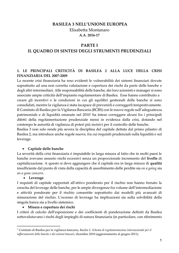 BASILEA 3 NELL’UNIONE EUROPEA Elisabetta Montanaro A.A. 2016-17 PARTE I IL QUADRO DI SINTESI DEGLI STRUMENTI PRUDENZIALI 1. LE PRINCIPALI CRITICITÀ DI BASILEA 2 ALLA LUCE DELLA CRISI FINANZIARIA DEL 2007-2009 La recente crisi finanziaria ha reso evidenti le vulnerabilità dei sistemi finanziari dovute soprattutto ad una non corretta valutazione e copertura dei rischi da parte delle banche e degli altri intermediari. Alle responsabilità delle banche, dei loro azionisti e manager si sono associate ampie criticità dell’impianto regolamentare di Basilea. Esse hanno contribuito a creare gli incentivi e le condizioni in cui gli squilibri gestionali delle banche si sono consolidati, mentre la vigilanza è stata incapace di prevenirli e correggerli tempestivamente. Il Comitato di Basilea per la Vigilanza Bancaria (BCBS) con le nuove regole sull’adeguatezza patrimoniale e di liquidità emanate nel 20101 ha inteso correggere alcuni fra i principali difetti della regolamentazione prudenziale messi in evidenza dalla crisi, dotando nel contempo le autorità di vigilanza di poteri più incisivi per il controllo delle banche. Basilea 3 non solo rende più severa la disciplina del capitale dettata dal primo pilastro di Basilea 2, ma introduce anche regole nuove, fra cui requisiti prudenziali sulla liquidità e sul leverage. Capitale delle banche La severità della crisi finanziaria è imputabile in larga misura al fatto che in molti paesi le banche avevano assunto rischi eccessivi senza un proporzionale incremento del livello di capitalizzazione. A questo si deve aggiungere che il capitale era in larga misura di qualità insufficiente dal punto di vista della capacità di assorbimento delle perdite sia on a going sia on a gone concern. Leverage I requisiti di capitale rapportati all’attivo ponderato per il rischio non hanno frenato la crescita del leverage delle banche, per le ampie divergenze fra volume dell’intermediazione e attività ponderate per il rischio consentite soprattutto dai modelli più avanzati di misurazione del rischio. L’eccesso di leverage ha implicazioni sia sulla solvibilità della singola banca sia a livello sistemico. Misura e copertura dei rischi I criteri di calcolo dell’esposizione e dei coefficienti di ponderazione definiti da Basilea sottovalutavano i rischi degli impieghi di natura finanziaria (in particolare, con riferimento 1 Comitato di Basilea per la vigilanza bancaria, Basilea 3. Schema di regolamentazione internazionale per il rafforzamento delle banche e dei sistemi bancari, dicembre 2010 (aggiornamento al giugno 2011). 1 alle esposizioni del trading book, al rischio di controparte, alle cartolarizzazioni e a varie operazioni fuori bilancio). Il trattamento privilegiato delle attività finanziarie in termini di assorbimento di capitale era basato sull’ipotesi che i mercati in cui sono trattate queste attività fossero costantemente liquidi ed efficienti. La fragilità di questa ipotesi è stata dimostrata dalla crisi: un’aliquota rilevante delle perdite subite dalle banche e dagli altri intermediari è derivata proprio dalle attività di mercato. Anche il rischio di molte poste fuori bilancio era stato sottovalutato. In particolare, le banche e i regolatori non avevano adeguatamente valutato il rischio di “re-intermediazione” delle esposizioni fuori bilancio, ossia il rischio che queste operazioni si possano trasformare in attivi per cassa di bassa qualità in situazioni di stress dei mercati, com’è avvenuto per gli impegni a concedere liquidità ai veicoli (SPV) nei processi di cartolarizzazione2. Liquidità Durante gli anni precedenti la crisi, molte banche si erano abituate a operare con uno sbilancio di scadenze e di valute molto consistente e con margini ridotti di disponibilità liquide, confidando nella costante possibilità di approvvigionarsi di liquidità sul mercato facilmente e a costi contenuti. All’esplodere della crisi, per effetto della perdita di fiducia nella liquidità delle banche, l’offerta di risorse liquide delle controparti di mercato si è ridotta drasticamente, generando severi problemi di funding e obbligando le banche centrali ad erogare volumi consistenti di credito di emergenza. Profili macro-prudenziali Uno dei principali limiti del modello di regolamentazione prudenziale di Basilea è l’ottica micro-prudenziale, come se garantire la solvibilità della singola banca equivalesse a garantire la stabilità del sistema bancario come aggregato. La crisi ha dimostrato che un approccio solo micro-prudenziale non è sufficiente a correggere i fattori di vulnerabilità sistemica. I principali fattori di rischio sistemico non adeguatamente coperti da Basilea 2 sono: la pro-ciclicità3, ossia la tendenza delle banche, in larga misura per effetto della regolamentazione del capitale, a comportarsi in modo da amplificare le fasi cicliche dell’economia; la interconnessione, ossia la concentrazione di rischi all’interno di settori del sistema finanziario (banche e altri intermediari, come le società di assicurazione) fra loro E’ molto frequente che la banca originante accordi al veicolo (acquirente dei crediti cartolarizzati ed emittente degli ABS) linee di credito (liquidity facilities) che hanno una duplice finalità: migliorare il giudizio sul merito creditizio delle emissioni (credit enhancement); fornire al veicolo un vero e proprio supporto creditizio da utilizzare quando le scadenze dei pagamenti sugli ABS non coincidano con i flussi finanziari (per interessi e rimborsi di capitale) prodotti dal portafoglio cartolarizzato. In pratica le due finalità tendono spesso a sommarsi: infatti, qualora il veicolo abbia difficoltà a collocare i titoli, utilizza le linee di credito dell’originante, ritrasferendo a carico della banca i rischi del portafoglio ceduto. Basilea 2 sottovalutava questo “rischio di reintermediazione”, prevedendo per le linee di credito con finalità di credit enhancement e con scadenz
