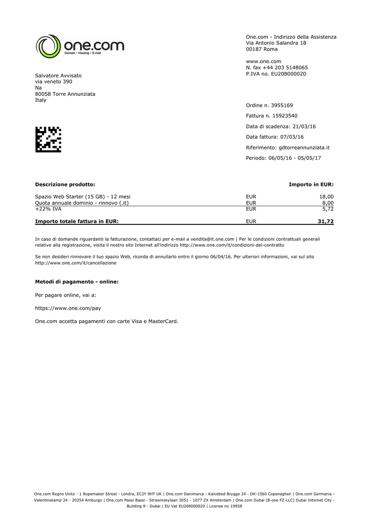 One.com - Indirizzo della Assistenza Via Antonio Salandra 18 00187 Roma www.one.com N. fax +44 203 5148065 P.IVA no. EU208000020 Salvatore Avvisato via veneto 390 Na 80058 Torre Annunziata Italy Ordine n. 3955169 Fattura n. 15923540 Data di scadenza: 21/03/16 Data fattura: 07/03/16 Riferimento: gdtorreannunziata.it Periodo: 06/05/16 - 05/05/17 Descrizione prodotto: Importo in EUR: Spazio Web Starter (15 GB) - 12 mesi Quota annuale dominio - rinnovo (.it) +22% IVA EUR EUR EUR 18,00 8,00 5,72 Importo totale fattura in EUR: EUR 31,72 In caso di domande riguardanti la fatturazione, contattaci per e-mail a [email protected] | Per le condizioni contrattuali generali relative alla registrazione, visita il nostro sito Internet all’indirizzo http://www.one.com/it/condizioni-del-contratto Se non desideri rinnovare il tuo spazio Web, ricorda di annullarlo entro il giorno 06/04/16. Per ulteriori informazioni, vai sul sito http://www.one.com/it/cancellazione Metodi di pagamento - online: Per pagare online, vai a: https://www.one.com/pay One.com accetta pagamenti con carte Visa e MasterCard. One.com Regno Unito - 1 Ropemaker Street - Londra, EC2Y 9HT UK | One.com Danimarca - Kalvebod Brygge 24 - DK-1560 Copenaghen | One.com Germania Valentinskamp 24 - 20354 Amburgo | One.com Paesi Bassi - Strawinskylaan 3051 - 1077 ZX Amsterdam | One.com Dubai (B-one FZ-LLC) Dubai Internet City Building 9 - Dubai | EU Vat EU208000020 | License no 19958