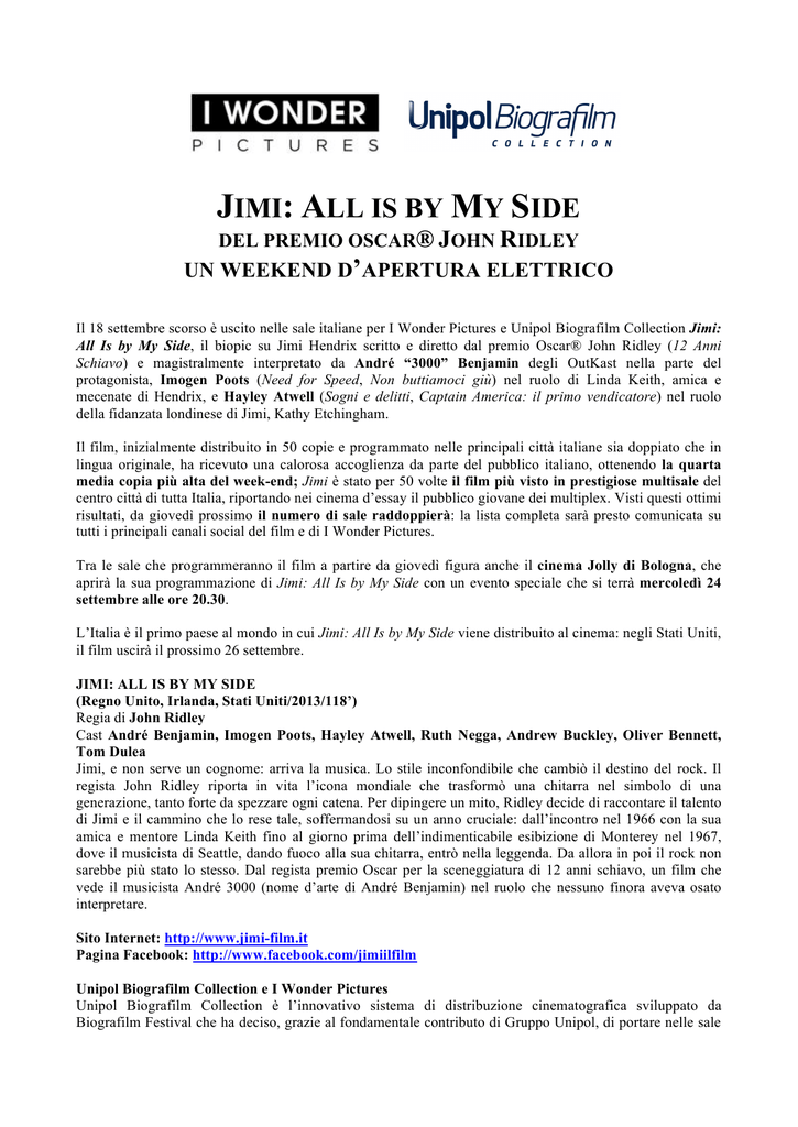 JIMI: ALL IS BY MY SIDE DEL PREMIO OSCAR® JOHN RIDLEY UN WEEKEND D’APERTURA ELETTRICO Il 18 settembre scorso è uscito nelle sale italiane per I Wonder Pictures e Unipol Biografilm Collection Jimi: All Is by My Side, il biopic su Jimi Hendrix scritto e diretto dal premio Oscar® John Ridley (12 Anni Schiavo) e magistralmente interpretato da André “3000” Benjamin degli OutKast nella parte del protagonista, Imogen Poots (Need for Speed, Non buttiamoci giù) nel ruolo di Linda Keith, amica e mecenate di Hendrix, e Hayley Atwell (Sogni e delitti, Captain America: il primo vendicatore) nel ruolo della fidanzata londinese di Jimi, Kathy Etchingham. Il film, inizialmente distribuito in 50 copie e programmato nelle principali città italiane sia doppiato che in lingua originale, ha ricevuto una calorosa accoglienza da parte del pubblico italiano, ottenendo la quarta media copia più alta del week-end; Jimi è stato per 50 volte il film più visto in prestigiose multisale del centro città di tutta Italia, riportando nei cinema d’essay il pubblico giovane dei multiplex. Visti questi ottimi risultati, da giovedì prossimo il numero di sale raddoppierà: la lista completa sarà presto comunicata su tutti i principali canali social del film e di I Wonder Pictures. Tra le sale che programmeranno il film a partire da giovedì figura anche il cinema Jolly di Bologna, che aprirà la sua programmazione di Jimi: All Is by My Side con un evento speciale che si terrà mercoledì 24 settembre alle ore 20.30. L’Italia è il primo paese al mondo in cui Jimi: All Is by My Side viene distribuito al cinema: negli Stati Uniti, il film uscirà il prossimo 26 settembre. JIMI: ALL IS BY MY SIDE (Regno Unito, Irlanda, Stati Uniti/2013/118’) Regia di John Ridley Cast André Benjamin, Imogen Poots, Hayley Atwell, Ruth Negga, Andrew Buckley, Oliver Bennett, Tom Dulea Jimi, e non serve un cognome: arriva la musica. Lo stile inconfondibile che cambiò il destino del rock. Il regista John Ridley riporta in vita l’icona mondiale che trasformò una chitarra nel simbolo di una generazione, tanto forte da spezzare ogni catena. Per dipingere un mito, Ridley decide di raccontare il talento di Jimi e il cammino che lo rese tale, soffermandosi su un anno cruciale: dall’incontro nel 1966 con la sua amica e mentore Linda Keith fino al giorno prima dell’indimenticabile esibizione di Monterey nel 1967, dove il musicista di Seattle, dando fuoco alla sua chitarra, entrò nella leggenda. Da allora in poi il rock non sarebbe più stato lo stesso. Dal regista premio Oscar per la sceneggiatura di 12 anni schiavo, un film che vede il musicista André 3000 (nome d’arte di André Benjamin) nel ruolo che nessuno finora aveva osato interpretare. Sito Internet: http://www.jimi-film.it Pagina Facebook: http://www.facebook.com/jimiilfilm Unipol Biografilm Collection e I Wonder Pictures Unipol Biografilm Collection è l’innovativo sistema di distribuzione cinematografica sviluppato da Biografilm Festival che ha deciso, grazie al fondamentale contributo di Gruppo Unipol, di portare nelle sale italiane un’accurata selezione di documentari e biopic incisivi ed efficaci nel delineare nuovi modi di analizzare, comprendere e affrontare le complesse dinamiche del mondo contemporaneo. Ufficio Stampa Bologna - Laboratorio delle Parole di Francesca Rossini [email protected] - 051 63 11 504, 335 54 11 331 Claudia Tomassini + Associates Claudia Tomassini – 3343075056 - Federica Ceraolo - 3409172947 [email protected] Press Office 2.0 - Alessandro Diele [email protected] - 051 40 70 166, 333 9580208