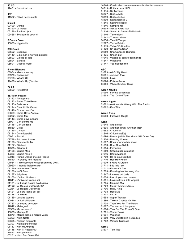 10 CC 12451 - I'm not in love 187 11522 - Nikad neces znati 2 Be 3 09499 - Donne 14790 - La Salsa 06136 - Partir un jour 09466 - Toujours là pour toi 3 Doors Down 10033 - Kryptonite 360 Gradi 06592 - Bababye 07149 - E poi non ti ho vista più rmx 06593 - Giorno di sole 06594 - Sandra 06591 - Vado al mare 4 Non Blondes 08964 - Manic monday 08970 - Space man 08758 - What's Up 12498 - What's Up (Remix) 78 bit 06590 - Fotografia 883 Max Pezzali 01142 - Aereoplano 01122 - Andra Tutto Bene 01123 - Bella vera 01124 - Chiuditi Nel Cesso 01146 - Ci sono anch'io 09609 - Come Deve Andare 00252 - Come Mai 01143 - Come deve andare 06991 - Con dentro me 01145 - Con un deca 14839 - Credi 01125 - Cumuli 01134 - Dimmi perchè 06961 - Eccoti 07788 - Fai come ti pare 01126 - Finalmente Tu 01127 - Gli Anni 12335 - Gli anni 2 01128 - Grazie Mille 12336 - Grazie mille 2 00016 - Hanno Ucciso L'uomo Ragno 14840 - I Cowboy non mollano 04554 - Il mio secondo tempo (Sanremo 2011) 03950 - Il mondo insieme a te 01129 - Innamorare Tanto 01130 - Io Ci Saro' 01137 - Jolly blue 01138 - L'ultimo bicchiere 14841 - L'universo tranne noi 01131 - La Lunga Estate Caldissima 01132 - La Regina Del Celebrita' 00254 - La Regola Dell'amico 01121 - La dura legge del gol 13135 - La strada 01139 - Lasciati toccare 10034 - Le luci di Natale 07787 - Lo strano percorso 14842 - Mai uguali 09588 - Me la cavero' 10035 - Medley 01 13879 - Mezzo pieno o mezzo vuoto 00393 - Nella Notte 00395 - Nessun rimpianto 00397 - Nient'altro che noi 01117 - Non Mi Arrendo 01118 - Non Ti Passa Piu' 14843 - Non pensavo 00251 - Nord Sud Ovest Est 14844 - Quello che comunemente noi chiamiamo amore 00519 - Rotta x casa di Dio 01115 - Se Tornerai 00077 - Sei Un Mito 13099 - Sei fantastica 13100 - Sei fantastica 2 14845 - Sei uno sfigato 14846 - Sempre noi 00255 - Senza Averti Qui 01116 - Siamo Al Centro Del Mondo 01140 - Tenendomi 01141 - Ti sento vivere 00256 - Tieni Il Tempo 12577 - Torno Subito 01119 - Tutto Ciò Che Ho 01120 - Un Giorno Cosi' 00250 - Una Canzone D'amore 01135 - Uno in piu' 11945 - Viaggio al centro del mondo 14847 - Weekend 01147 - You needed me ABC 03573 - All Of My Heart 03581 - Jackson Five 03579 - Love 03578 - Poison Arrow 03580 - When Smokey Sings Aaron Neville 03560 - For the goodtimes 03558 - The Grand Tour Aaron Tippin 03561 - Ain't Nothin' Wrong With The Radio 03562 - Kiss This Aaron Yung 03563 - Farewell, Riegle Abba 01945 - Angel eyes 01695 - Another Town, Another Train 01692 - Chiquitita 11246 - Chiquitita (Es) 01696 - Dance (While The Music Still Goes On) 01300 - Dancing Queen 01697 - Does your mother know 01693 - Dum Dum Diddle 01694 - Fernando 11259 - Gracias por la musica 01946 - Hasta Mañana 01709 - He Is Your Brother 01710 - Hey Hey Helen 01939 - I Have A Dream 01711 - I do i do i do 01712 - Kisses Of Fire 01703 - Knowing Me Knowing You 01947 - La reina del baile 01890 - Lay all your love on me 01891 - Lovers (live a little longer) 01705 - Mamma Mia 01700 - Money Money Money 01706 - Ring, Ring 01708 - Rock Me 01707 - S.O.S. 01698 - Super Trouper 01886 - Take A Chance On Me 01704 - Than You For The Music 01887 - The name of the game 01888 - Two For The Price Of One 01701 - Voulez Vous 01691 - Waterloo 01889 - Why Did It Have To Be Me 01702 - Winner Takes All Abreu 03577 - Tico Tico Ac Dc 03604 - For those about to rock 03605 - Have a drink on me 03603 - Highway To Hell 09328 - Thunder Struck 03606 - Who made who 03602 - Whole Lotta Rosie 09458 - You shook me all night long Aca Lukas 11517 - Burbon 11518 - Dijabolik 11519 - Pesma od bola Ace Frehley 03607 - New York groove Ace of Base 03609 - All That She Wants 03615 - Alliage 03614 - Beautiful day 03610 - Don't turn around 03611 - Life is a flower 03612 - Lucky love 03608 - Sign 03613 - Wheel of fortune Achille Togliani 06596 - Canzone Da Due Soldi 15105 - Canzone Da Due Soldi (Vers. Dixilandi) 06597 - Come pioveva 15106 - La Luna Si Veste D'argento 06595 - Mogliettina 09122 - Tammuriata nera Adele 14858 - Best for last 13768 - Chasing Pavement 14859 - Cold shoulder 14860 - Crazy for you 14861 - Daydreamer 14862 - First love 14863 - Love Song 14864 - Melt my heart to stone 14865 - My same 14866 - One and only 14867 - Right as rain 14868 - Rolling In The Deep 14869 - Rumour has it 14870 - Set Fire To The Rain 14871 - Skyfall 14872 - Someone Like You 14873 - Take it all 14874 - Turning tables Adrian Gurvitz 10040 - Classic Adriano Celentano 00099 - 24000 Baci 14875 - 30 donne del west 06994 - A New Orleans 01075 - Acquarello 06609 - Addormentarmi cosi 06610 - Ancora vivo 01042 - Angel 14876 - Anna parte 01046 - Apri il cuore 13758 - Aria non sei più tu 06611 - Atmosfera 01062 - Attraverso me 06612 - Auilule 00021 - Azzurro 06613 - Azzurro remix 2002 00416 - Baci 00717 - Be bop a lula 06614 - Bellissima 06615 - Bianco Natale 12378 - Bisogna far qualcosa 11958 - Bisogna far qualcosa 2 11959 - Blue jeans rock 13073 - Blue jeans rock 2 08720 - Blueberry hill 14878 - Brivido Felino 06616 - Buonasera dottore 03345 - C'e' sempre un motivo 01064 - Canzone 06995 - Cercami 13845 - Che cosa ti farei 14879 - Che taggia di 07151 - Chi ce l'ha con me 06617 - Chi mai sara' la ragazza del clan 00799 - Chi non lavora non fa l'amore 13075 - Chi non lavora non fa l'amore 2 00600 - Ciao Ragazzi Ciao 14880 - Ciao Ti Diro 01056 - Confessa 14249 - Confessa (vers. Country) 06996 - Conto su di te 01061 - Così come sei 06618 - Cosi' no 06997 - Crederò 01063 - Desidero te 06604 - Deus 14882 - Diana 07155 - Dimenticare e ricominciare 14883 - Dolce Fuoco Dell'amore 01072 - Dolce rompi 06998 - Don't play that song 13182 - Dormi amore 06605 - E voi ballate 01051 - E' ancora sabato 06999 - E' finita 07157 - E' inutile davvero 14884 - Eh gia 14885 - Er Piu 01052 - Eravamo in centomila 14886 - Fa male 13377 - Fascino 13869 - Fiori 07000 - Forse eri meglio di lei 14887 - Fresco 06606 - Fumo negli occhi 07001 - Fuoco 00828 - Grazie Prego Scusi 13650 - Hai bucato la mia vita (vers. Samba) 13188 - Hai bucat