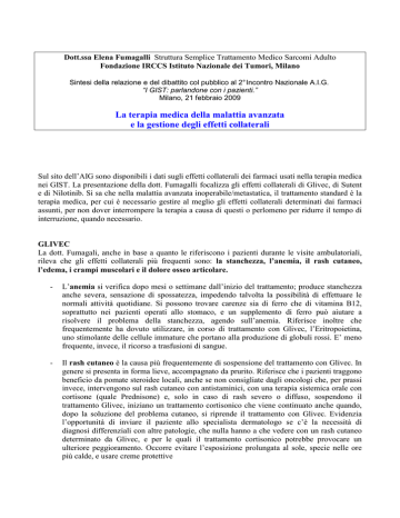 Dott.ssa Elena Fumagalli Struttura Semplice Trattamento Medico Sarcomi Adulto Fondazione IRCCS Istituto Nazionale dei Tumori, Milano Sintesi della relazione e del dibattito col pubblico al 2° Incontro Nazionale A.I.G. “I GIST: parlandone con i pazienti.” Milano, 21 febbraio 2009 La terapia medica della malattia avanzata e la gestione degli effetti collaterali Sul sito dell’AIG sono disponibili i dati sugli effetti collaterali dei farmaci usati nella terapia medica nei GIST. La presentazione della dott. Fumagalli focalizza gli effetti collaterali di Glivec, di Sutent e di Nilotinib. Si sa che nella malattia avanzata inoperabile/metastatica, il trattamento standard è la terapia medica, per cui è necessario gestire al meglio gli effetti collaterali determinati dai farmaci assunti, per non dover interrompere la terapia a causa di questi o perlomeno per ridurre il tempo di interruzione, quando necessario. GLIVEC La dott. Fumagali, anche in base a quanto le riferiscono i pazienti durante le visite ambulatoriali, rileva che gli effetti collaterali più frequenti sono: la stanchezza, l’anemia, il rash cutaneo, l’edema, i crampi muscolari e il dolore osseo articolare. - L’anemia si verifica dopo mesi o settimane dall’inizio del trattamento; produce stanchezza anche severa, sensazione di spossatezza, impedendo talvolta la possibilità di effettuare le normali attività quotidiane. Si possono trovare carenze sia di ferro che di vitamina B12, soprattutto nei pazienti operati allo stomaco, e un supplemento di ferro può aiutare a risolvere il problema della stanchezza, agendo sull’anemia. Riferisce inoltre che frequentemente ha dovuto utilizzare, in corso di trattamento con Glivec, l’Eritropoietina, uno stimolante delle cellule immature che portano alla produzione di globuli rossi. E’ meno frequente, invece, il ricorso a trasfusioni di sangue. - Il rash cutaneo è la causa più frequentemente di sospensione del trattamento con Glivec. In genere si presenta in forma lieve, accompagnato da prurito. Riferisce che i pazienti traggono beneficio da pomate steroidee locali, anche se non consigliate dagli oncologi che, per prassi invece, intervengono sul rash cutaneo con antistaminici, con una terapia sistemica orale con cortisone (quale Prednisone) e, solo in caso di rash severo o diffuso, sospendono il trattamento Glivec, iniziano un trattamento cortisonico che viene continuato anche quando, dopo la soluzione del problema cutaneo, si riprende il trattamento con Glivec. Evidenzia l’opportunità di inviare il paziente allo specialista dermatologo se c’è la necessità di diagnosi differenziali con altre patologie, che nulla hanno a che vedere con un rash cutaneo determinato da Glivec, e per le quali il trattamento cortisonico potrebbe provocare un ulteriore peggioramento. Occorre evitare l’esposizione prolungata al sole, specie nelle ore più calde, e usare creme protettive - L’edema da Glivec di solito si osserva nelle prime settimane dall’inizio del trattamento ma si può presentare anche dopo mesi; si manifesta in genere come edema periorbitale (gonfiori agli occhi) o edema perimalleolare (gonfiori alle caviglie) e tende ad essere generalizzato. Per questo la dottoressa consiglia ai pazienti di controllare frequentemente il peso e il verificarsi di gonfiori agli occhi e alle caviglie; inoltre consiglia il controllo della pressione arteriosa, perché il farmaco può causare aumento della pressione e, quindi, ipertensione, mentre molto più rari sono i casi di versamento pleurico e ancora più rari quelli di versamento pericardico. L’utilizzo di diuretici come il Lasix con un eventuale supplemento di potassio è consigliato in caso di edema importante generalizzato, ma anche in caso di edema localizzato in zona perimalleolare e periorbitale per il fastidio che questo produce. Solo in caso di edema generalizzato importante si sospende Glivec, per riprenderlo dopo i benefici ottenuti col diuretico. Talvolta, a seconda delle condizioni generali del paziente, non si riprende subito la dose completa di Glivec, ma si può iniziare con tre compresse, per ritornare in pochi giorni al dosaggio pieno. - La nausea e la esofagite sono altri effetti che si possono avere in corso di trattamento con Glivec; possono essere tenute sotto controllo con delle semplici precauzioni quali, per esempio, assumere Glivec a stomaco pieno, eventualmente durante il pasto; evitare di sdraiarsi nelle due ore successive all’assunzione di Glivec, specie se si soffriva già di esofagite o di ernia iatale. In caso di totale intollerabilità al farmaco da parte del paziente o di impossibilità all’assunzione del farmaco in un'unica dose, si può suddividere la dose in due somministrazioni giornaliere aiutando il paziente anche con farmaci come il Plasil e lo Zofran. E’ singolare il caso riferito dalla dottoressa di un paziente per il quale, vista la sua intollerabilità all’ingestione delle compresse, i medici hanno deciso di cambiare la formulazione del farmaco, facendolo sciogliere nel succo di mela. - I crampi muscolari, come ben sanno tutti i pazienti affetti da GIST, sono frequenti e colpiscono soprattutto le mani, i piedi e anche le dita; si verificano soprattutto di notte e possono essere legati ad una diminuzione dei livelli di calcio e di magnesio durante il trattamento con Glivec. Una volta accertata la carenza di calcio/magnesio, si può consigliare una supplementazione di questi elementi e anche della vitamina D, che permette un miglior assorbimento del calcio. Invece risultano vani i tentativi di controllare con antidolorifici la sintomatologia. L’assunzione di Gabapentil giova molto nel caso di dolore neuropatico. Per quanto concerne la potenziale alterazione del metabolismo sia osseo che minerale in corso di trattamento con Glivec, indicata in un articolo pubblicato due anni fa, la D.ssa Fumagalli sostiene che non c’è stata una dimostrazione certa che il Glivec determini ciò; nei