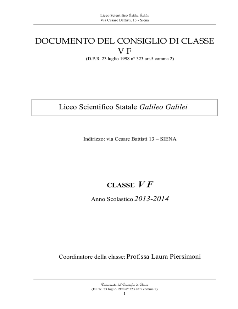Liceo Scientifico Galileo Galilei Via Cesare Battisti, 13 - Siena DOCUMENTO DEL CONSIGLIO DI CLASSE VF (D.P.R. 23 luglio 1998 n° 323 art.5 comma 2) Liceo Scientifico Statale Galileo Galilei Indirizzo: via Cesare Battisti 13 – SIENA CLASSE VF Anno Scolastico 2013-2014 Coordinatore della classe: Prof.ssa Laura Piersimoni Documento del Consiglio di Classe (D.P.R. 23 luglio 1998 n° 323 art.5 comma 2) 1 Liceo Scientifico Galileo Galilei Via Cesare Battisti, 13 - Siena 1. PRESENTAZIONE SINTETICA: a) b) c) Storia del triennio della classe Composizione del Consiglio di classe e continuità didattica nel triennio Situazione di partenza della classe nell’anno scolastico in corso a) Storia del triennio della classe La classe V F è formata da 21 alunni (15 femmine, 6 maschi) provenienti da ambienti socialmente e culturalmente eterogenei. In terza liceo erano 20, ma due risultarono non promossi. Nella quarta fu inserito uno studente ed altri due arrivarono all’inizio del secondo quadrimestre: uno proveniente da altra scuola, l’altro da diversa sezione. In questo anno scolastico si è inserita una nuova alunna, proveniente da altra scuola, proprio alla fine del primo quadrimestre. E’ necessario sottolineare che nel corso di studi non tutte le materie hanno mantenuto la continuità didattica, tuttavia gli alunni si sono adeguati ai nuovi metodi di insegnamento e, con l’impegno e la serietà che ha sempre caratterizzato questo gruppo, la classe ha ottenuto un livello di conoscenze, competenze e capacità di rielaborazione generalmente buono. b) Composizione del Consiglio di Classe e continuità didattica nel triennio DISCIPLINE CONTINUITA’ NEL TRIENNIO Mori Nicoletta ITALIANO – LATINO NO (solo quinta) Piersimoni Laura INGLESE SI STORIA E FILOSOFIA SI MATEMATICA E FISICA NO (dalla quarta) Parigi Francesco SCIENZE SI Tanzini Marta DISEGNO E STORIA DELL’ARTE NO (solo quinta) ED. FISICA SI IRC SI DOCENTI SimonciniMariaGrazia Valentini Sergio Tancredi Elisabetta Saluzzi Rosa Documento del Consiglio di Classe (D.P.R. 23 luglio 1998 n° 323 art.5 comma 2) 2 Liceo Scientifico Galileo Galilei Via Cesare Battisti, 13 - Siena c) Situazione di partenza della classe nell’anno scolastico in corso La classe si è distinta per interesse, impegno e partecipazione al dialogo educativo ed ha preso parte alle varie iniziative della scuola. Il livello di preparazione all’inizio dell’anno scolastico in corso era generalmente buono. 2. OBIETTIVI GENERALI (educativi e formativi) Capacità trasversali: relazionali, comportamentali e cognitive. In relazione alla personalità, alle attitudini, agli interessi, alle possibilità dei singoli alunni si sono effettuati interventi di vario tipo con lo scopo di visualizzare le capacità di ciascuno. Si è teso a far maturare: le capacità espressive la competenza comunicativa le abilità logiche (deduzione, indagine e sintesi) le abilità di riflessione critica Gli studenti hanno risposto generalmente in modo positivo alle sollecitazioni conseguendo, nel complesso, risultati mediamente buoni in ordine agli obiettivi di cui sopra. 4. ATTIVITA’ EXTRA, PARA, INTER CURRICOLARI (Viaggi di istruzione, visite guidate, scambi, stages, tirocini, mostre, conferenze, teatro, cinema, attività sportive, ecc. a cui la classe ha partecipato nel corso dell’a. s. 2013-2014) 29/11/2013: Incontro per Progetto Galileo; titolo: “Il cosmo vivente. L'astrobiologia e la ricerca della vita dell'universo” 11/12/2013: Visita a VIRGO e mostra dedicata a Bruno Pontecorvo (Pisa) 14/01/2014: Incontro per Progetto Galileo, titolo: “La luna come fonte d'ispirazione della poesia, dialogo fra uomo di scienza”- critico letterario Marino Biondi, Università di Firenze; Alberto Righini, Università di Firenze’ 27/01/2014: Giornata della Memoria 15/02/2014: Giornata Galileiana dal 9/3 al 16/3/14: Viaggio d’ Istruzione a Parigi 13/05/2014: Incontro con Valerio Castronuovo, titolo: ‘Gli anni di piombo’ Collaborazione al restauro degli strumenti scientifici del vecchio Osservatorio dei Cappuccini, risalenti al XIX secolo, esposti in teche all’interno della scuola. Documento del Consiglio di Classe (D.P.R. 23 luglio 1998 n° 323 art.5 comma 2) 3 Liceo Scientifico Galileo Galilei Via Cesare Battisti, 13 - Siena 5. CRITERI E STRUMENTI DELLA MISURAZIONE (punteggi e livelli) E DELLA VALUTAZIONE (indicatori e descrittori adottati per la formulazione di giudizi e/o per l’attribuzione dei voti) approvati dal Collegio dei Docenti (GRIGLIA) Particolare attenzione è stata riservata alla valutazione, intesa come momento costruttivo di verifica dell’attività didattica, dei livelli di apprendimento e di maturazione degli alunni. La valutazione globale dell’alunno ha tenuto conto dell’impegno, dell’assiduità della frequenza, del profitto, dei miglioramenti intervenuti, delle capacità, delle potenzialità, degli obiettivi formativi e dei contenuti minimi raggiunti. La valutazione prevede, inoltre, come parametro, la realtà specifica della classe anche nella prospettiva di un corretto orientamento scolastico. Modalità di verifica I metodi di rilevazione del livello di preparazione globale raggiunto sono stati: colloqui con domande esplorative, al fine di accertare il livello di preparazione in maniera continua al fine di stimolare lo studio costante colloqui formali alla cattedra, al fine di accertare in maniera più approfondita i livelli di preparazione, questionari di varia tipologia per accertare conoscenze essenziali e principî generali; elaborazione di testi di varia tipologia per verificare le conoscenze, le competenze e, soprattutto, la capacità di analisi, di sintesi e di critica; simulazioni di terza prova d’Esame facendo ricorso alla Tipologia B, ovvero a quesiti a risposta singola, alla cui trattazione sono state assegnate al più dieci righe. Sono allegate al presente Documento criteri e strumenti di misurazione e valutazione disciplinari del Consiglio di classe 