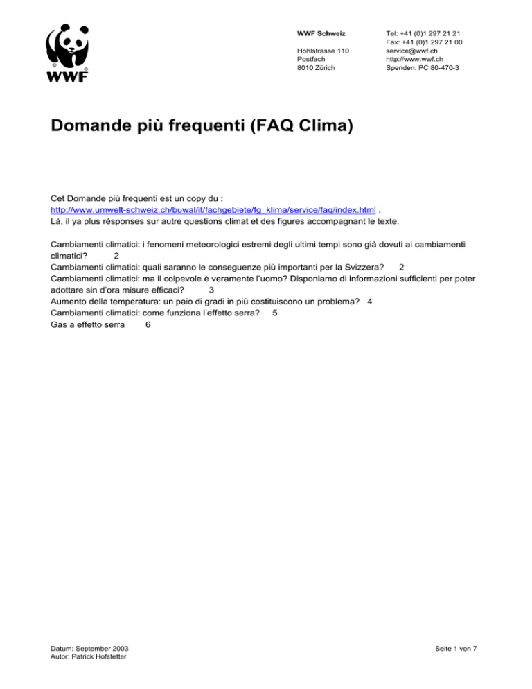 WWF Schweiz Hohlstrasse 110 Postfach 8010 Zürich Tel: +41 (0)1 297 21 21 Fax: +41 (0)1 297 21 00 [email protected] http://www.wwf.ch Spenden: PC 80-470-3 Domande più frequenti (FAQ Clima) Cet Domande più frequenti est un copy du : http://www.umwelt-schweiz.ch/buwal/it/fachgebiete/fg_klima/service/faq/index.html . Là, il ya plus résponses sur autre questions climat et des figures accompagnant le texte. Cambiamenti climatici: i fenomeni meteorologici estremi degli ultimi tempi sono già dovuti ai cambiamenti climatici? 2 Cambiamenti climatici: quali saranno le conseguenze più importanti per la Svizzera? 2 Cambiamenti climatici: ma il colpevole è veramente l’uomo? Disponiamo di informazioni sufficienti per poter adottare sin d’ora misure efficaci? 3 Aumento della temperatura: un paio di gradi in più costituiscono un problema? 4 Cambiamenti climatici: come funziona l’effetto serra? 5 Gas a effetto serra 6 Datum: September 2003 Autor: Patrick Hofstetter Seite 1 von 7 Domande più frequenti (FAQ Clima) Cambiamenti climatici: i fenomeni meteorologici estremi degli ultimi tempi sono già dovuti ai cambiamenti climatici? Negli ultimi anni, abbiamo assistito a diversi eventi meteorologici estremi che hanno provocato danni ingentissimi (situazione marzo 2002): Colate di fango a Gondo, maltempo ed esondazioni in Ticino (ottobre 2000) Uragano Lothar (dicembre 1999) Inondazioni in vaste aree dell’Altipiano (maggio 1999) Valanghe (febbraio 1999) Colate di fango a Sachseln (agosto 1997) Incendi di boschi in Ticino e Mesolcina (aprile 1997) Alluvione in Ticino (ottobre 1993) Piena a Saas e Briga (settembre 1993) Tempesta Vivian (febbraio 1990) Inondazioni nella valle della Reuss e in Ticino; colate di fango a Poschiavo (agosto 1987) La domanda sorge spontanea: questi eventi sono segni precursori di un clima che si sta modificando in Svizzera? I climatologi ci forniscono due risposte: La prima: i modelli climatici utilizzati attualmente concordano sul fatto che l’apporto prolungato di gas a effetto serra originati dalle attività umane provoca un aumento della temperatura, dell’energia e del vapore acqueo nell’atmosfera. In particolare, l’elevato tasso di vapore acqueo può esprimersi sotto forma di precipitazioni molto abbondanti e, a causa dell’energia di evaporazione, in un rafforzamento dei cicloni. Si suppone quindi che l’aumento della concentrazione media globale dei gas a effetto serra nell’atmosfera provochi un’intensificazione dei fenomeni climatici estremi (incl. ondate di calore o periodi di siccità). La seconda: un fenomeno estremo isolato non può essere considerato come una prova inconfutabile del cambiamento climatico. Questi eventi meteorologici straordinari vengono scatenati dall’interazione tra diversi fattori: i cambiamenti climatici possono contribuire – ad esempio attraverso l’eventuale aumento della quantità di precipitazioni – ma non possono essere l’unica causa di quest’evoluzione. Analizzando la storia del clima, notiamo in effetti che i fenomeni estremi si verificano anche in un’atmosfera che non ha subito alcun influsso da parte dell’uomo. E poiché gli eventi estremi sono molto rari, per dimostrare statisticamente una variazione della loro frequenza ci vogliono parecchi decenni. Comunque, nel XX secolo in Svizzera si è registrato un netto incremento – dal 20 al 40 percento – delle precipitazioni abbondanti o intense, come quelle che si verificano circa una volta al mese. Questo dato corrisponde alle proiezioni dei modelli climatici. Cambiamenti climatici: quali saranno le conseguenze più importanti per la Svizzera? La maggior parte degli aspetti analizzati – tra i quali il bilancio idrico, l’agricoltura, gli ecosistemi, i boschi, la salute – interessano direttamente o indirettamente anche la Svizzera. Datum: September 2003 Autor: Patrick Hofstetter Seite 2 von 7 Domande più frequenti (FAQ Clima) Dati importanti per la Svizzera: 1) Conseguenze per il clima e la meteorologia: Nell’arco alpino, i cambiamenti climatici saranno più importanti rispetto alle zone di pianura. L’IPCC prevede un aumento della temperatura media annua compreso tra 0,65 e 2,75 gradi Celsius entro il 2050 (rispetto al 1990). Per la Svizzera, da un’analisi degli scenari per lo stesso periodo risulta un aumento compreso tra 0,5 e 4,8 gradi Celsius. Il riscaldamento potrebbe essere particolarmente marcato in estate. Le precipitazioni dovrebbero aumentare in inverno, mentre in tutte le altre stagioni, secondo i modelli matematici di cui disponiamo attualmente, sono possibili sia grandi aumenti che grandi diminuzioni. Le variazioni possono avere un’intensità molto diversa a seconda della regione (a Nord o a Sud delle Alpi). A causa del riscaldamento dell’atmosfera, si prevedono variazioni nella situazione meteorologica giornaliera (frequenza e durata delle condizioni meteorologiche) e nell’evoluzione dei fenomeni estremi (tempeste, piogge torrenziali, ecc.). Con grande probabilità, a lungo termine aumenterà la frequenza di precipitazioni abbondanti ed estreme, di estati torride e di inverni miti. Nel corso del XXI secolo, la frequenza e l’intensità delle tempeste potrebbe aumentare ma anche diminuire, anche se una riduzione generale della frequenza potrebbe essere accompagnata da un rafforzamento dell’intensità degli eventi straordinari. Le condizioni meteorologiche estreme provocano danni ingentissimi (citiamo la piena di Briga nel 1993, l’uragano Lothar nel 1999, le colate di fango in Vallese nell’ottobre 2000). 2) Conseguenze per l’ambiente: Il bilancio idrico reagirà con particolare sensibilità alle conseguenze dei cambiamenti climatici regionali che si manifesteranno nei prossimi decenni in Svizzera: tra le reazioni più gravi, assisteremo probabilmente a un ritiro accelerato dei ghiacciai e a una chiara trasformazione del ciclo dell’acqua. Lo scioglimento delle nevi inizierà in anticipo sulla stagione e i fiumi t