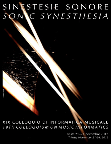 © Ivan Penov SINESTESIE SONORE SONIC SYNESTHESIA X I X C O L L O Q U I O D I I N F O R M AT I C A M U S I C A L E 1 9 T H C O L L O Q U I U M O N M U S I C I N F O R M AT I C S Trieste 21–24 novembre1 2012 Trieste, November 21-24, 2012 2 XIX Colloquio di Informatica Musicale 19th Colloquium on Music Informatics SINESTESIE SONORE SONIC SYNESTHESIA Trieste 21–24 novembre 2012 Triest, November 21-24, 2012 credito cooperativo del carso zadružna kraška banka 3 AIMI – Associazione di Informatica Musicale Italiana www.aimi-musica.org Conservatorio di Musica “Giuseppe Tartini” di Trieste Dipartimento di Nuove Tecnologie e Linguaggi Musicali www.conservatorio.trieste.it In collaborazione con Casa della Musica / Scuola di Musica 55 di Trieste www.scuoladimusica55.it Teatro Miela www.miela.it Università degli Studi di Udine Dipartimento di Matematica e Informatica www.dimi.uniud.it Cantierezero Translocal collective for music and contemporary arts (I/A) www.cantierezero.org Consortium GARR La Rete Italiana dell’Università e della Ricerca www.garr.it Con il patrocinio di Comune di Trieste Con il contributo di Fondazione Benefica Kathleen Foreman Casali SKE Fonds - Austro Mechana www.ske-fonds.at Forum Austriaco di Cultura Milano www.bmeia.gv.at ZKB - Credito Cooperativo del Carso www.zkb.it Con l’amichevole collaborazione di Scuola Superiore Internazionale di Musica da Camera “Trio di Trieste” Collegio del Mondo Unito dell’Adriatico O.N.L.U.S. www.uwcad.it Servizio Concerti Cerneaz Accademia Ars Nova www.arsnovatrieste.it Musicali Rossoni www.musicalirossoni.it Civico Museo Teatrale “Carlo Schmidl” Trieste www.triestecultura.it Media partner RTV Koper - Capodistria www.rtvslo.si./capodistria 4 XIX COLLOQUIO DI INFORMATICA MUSICALE L’Associazione di Informatica Musicale Italiana (AIMI), fondata nel 1981, è punto di riferimento nel panorama italiano per musicisti e ricercatori interessati al rapporto tra musica, scienza e tecnologia. L’AIMI, che vanta tra i suoi associati musicisti e ricercatori di rilevanza internazionale, patrocina con cadenza biennale i Colloqui di Informatica Musicale (CIM), che rappresentano il più atteso momento di discussione scientifica e di confronto musicale della comunità italiana di informatica musicale. Il Colloquio di Informatica Musicale costituisce il punto d’incontro tra gli scienziati, gli artisti e i musicologi che si dedicano secondo le rispettive metodologie all’interazione musica-tecnologia e ha come scopo la divulgazione delle loro ricerche sulle applicazioni artistico-musicali delle tecnologie informatiche, nei risvolti accademici, artistici, culturali e pedagogici. Come di consueto, il programma del Colloquio include comunicazioni scientifiche, attività didattiche e produzioni artistiche. Le comunicazioni scientifiche/artistiche sono state selezionate mediante una Call for papers e i lavori musicali e artistici mediante una Call for scores/works; tutte le proposte sono state vagliate dal Comitato scientifico e selezione musicale. SINESTESIE SONORE I temi dell’edizione 2012 sono multimodalità e interattività. Attraverso le tecnologie digitali, le diverse forme d’arte tendono oggi a stabilire forti interconnessioni estetiche e luoghi di coabitazione. In particolare il suono è sempre più presente e quasi necessario in qualsiasi tipo di espressione artistica. In una recente call for papers del Leonardo Music Journal si legge: “Art is getting noisier every day. Whether made by sculptors, video artists, composers, printmakers or installation artists, there’s no question but that “Sound Art” is a genre ascendant.” Il suono si integra quindi in senso multimodale nel discorso artistico e, spesso, il mezzo tecnologico è lo strumento più efficace per raggiungere questo scopo. In modo simile, la tecnologia odierna permette lo sviluppo di lavori artistici in cui l’interazione con la macchina da parte di un performer, o da parte del pubblico, diventa sempre più dinamicamente legata al corpo e a ciò che avviene nell’ambiente in cui l’opera si colloca. L’idea di embodiment e di recupero della fisicità nel rapporto con la macchina sono stimolo di nuove forme di espressione e relazione con la tecnologia, non solo in ambito artistico ma anche nella vita quotidiana. 5 19th COLLOQUIUM ON MUSIC INFORMATICS The Italian Association of Music Informatics (AIMI), founded in 1981, is a reference point for Italian musicians and researchers who are interested in the relationships between music, science and technology. The AIMI, which counts internationally renowned musicians and researchers among its affiliates, organizes every two years the Colloquium on Music Informatics, representing the most important moment of scientific discussion and musical debate in the Italian community of music informatics. The Colloquium on Music Informatics is a touch point for scientists, artists and musicologists who dedicate their methodologies to the interaction between music and technology, and serves the dissemination of their research on the artistic-musical applications of information technology in all its academic, artistic, cultural and pedagogical facets. As it is customary, the program of the Colloquium includes scientific communications, seminal activities and artistic productions. The scientific/artistic communications have been selected trough a Call for papers, and the musical and artistic works through a parallel Call for scores/works; all submissions have been reviewed by the Scientific and Music Committee. SONIC SYNESTHESIA The themes of the 2012 edition are multimodality and interactivity. By means of the digital technologies, the different forms of art tend to establish strong aesthetical connexions and cohabitation grounds. In particular sound is more and more present and felt as necessary in any kind of artistic expression. In a recent call for papers by the Leonardo Music Journal, one can read: “Art is getting noi