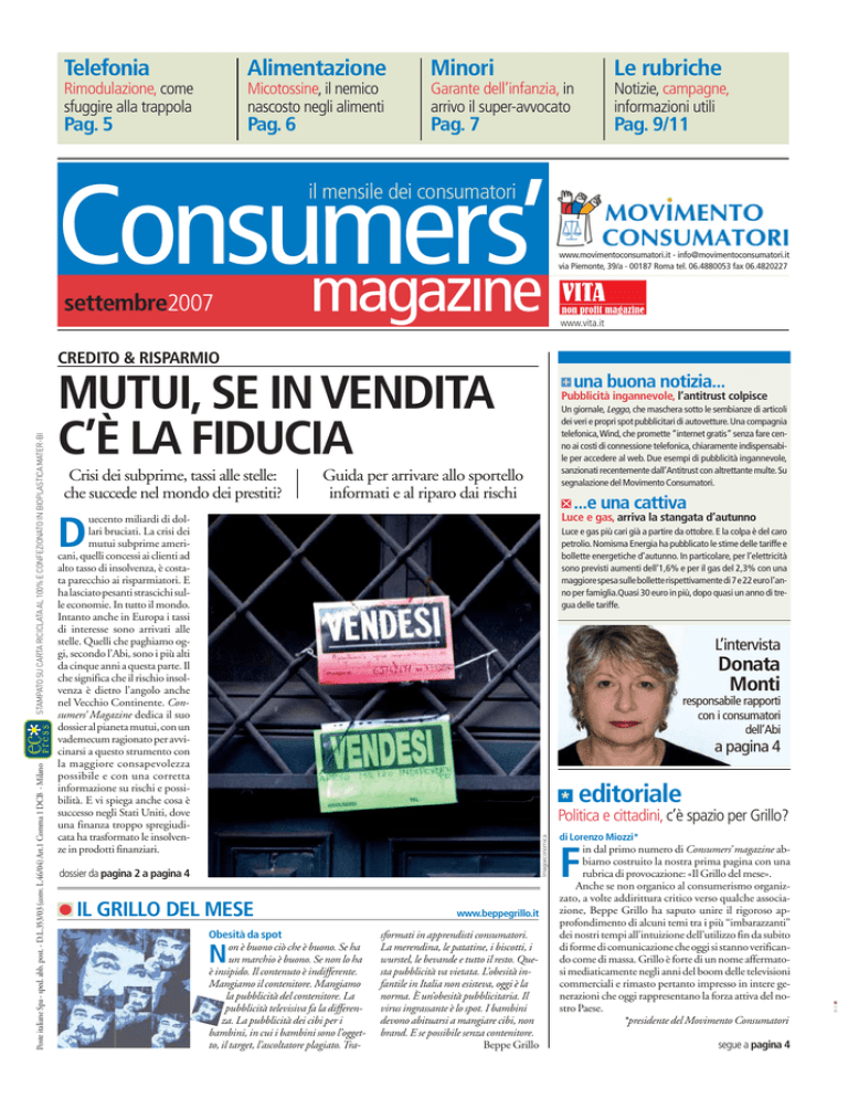 Telefonia Alimentazione Minori Le rubriche Rimodulazione, come sfuggire alla trappola Micotossine, il nemico nascosto negli alimenti Garante dell’infanzia, in arrivo il super-avvocato Notizie, campagne, informazioni utili Pag. 5 Pag. 6 Pag. 7 Pag. 9/11 Consumers’ magazine il mensile dei consumatori www.movimentoconsumatori.it - [email protected] via Piemonte, 39/a - 00187 Roma tel. 06.4880053 fax 06.4820227 settembre2007 www.vita.it MUTUI, SE IN VENDITA C’È LA FIDUCIA Crisi dei subprime, tassi alle stelle: che succede nel mondo dei prestiti? + una buona notizia... Pubblicità ingannevole, l’antitrust colpisce Un giornale, Leggo, che maschera sotto le sembianze di articoli dei veri e propri spot pubblicitari di autovetture.Una compagnia telefonica,Wind, che promette “internet gratis” senza fare cenno ai costi di connessione telefonica, chiaramente indispensabile per accedere al web. Due esempi di pubblicità ingannevole, sanzionati recentemente dall’Antitrust con altrettante multe. Su segnalazione del Movimento Consumatori. Guida per arrivare allo sportello informati e al riparo dai rischi ...e una cattiva Luce e gas, arriva la stangata d’autunno uecento miliardi di dollari bruciati. La crisi dei mutui subprime americani, quelli concessi ai clienti ad alto tasso di insolvenza, è costata parecchio ai risparmiatori. E ha lasciato pesanti strascichi sulle economie. In tutto il mondo. Intanto anche in Europa i tassi di interesse sono arrivati alle stelle. Quelli che paghiamo oggi, secondo l’Abi, sono i più alti da cinque anni a questa parte. Il che significa che il rischio insolvenza è dietro l’angolo anche nel Vecchio Continente. Consumers’ Magazine dedica il suo dossier al pianeta mutui, con un vademecum ragionato per avvicinarsi a questo strumento con la maggiore consapevolezza possibile e con una corretta informazione su rischi e possibilità. E vi spiega anche cosa è successo negli Stati Uniti, dove una finanza troppo spregiudicata ha trasformato le insolvenze in prodotti finanziari. D Luce e gas più cari già a partire da ottobre. E la colpa è del caro petrolio. Nomisma Energia ha pubblicato le stime delle tariffe e bollette energetiche d’autunno. In particolare, per l’elettricità sono previsti aumenti dell’1,6% e per il gas del 2,3% con una maggiore spesa sulle bollette rispettivamente di 7 e 22 euro l’anno per famiglia.Quasi 30 euro in più, dopo quasi un anno di tregua delle tariffe. L’intervista Donata Monti responsabile rapporti con i consumatori dell’Abi a pagina 4 * editoriale Politica e cittadini, c’è spazio per Grillo? Imagoeconomica Poste italiane Spa - sped. abb. post. - D.L.353/03 (conv. L.46/04) Art.1 Comma 1 DCB - Milano STAMPATO SU CARTA RICICLATA AL 100% E CONFEZIONATO IN BIOPLASTICA MATER-BI CREDITO & RISPARMIO dossier da pagina 2 a pagina 4 IL GRILLO DEL MESE Obesità da spot on è buono ciò che è buono. Se ha un marchio è buono. Se non lo ha è insipido. Il contenuto è indifferente. Mangiamo il contenitore. Mangiamo la pubblicità del contenitore. La pubblicità televisiva fa la differenza. La pubblicità dei cibi per i bambini, in cui i bambini sono l’oggetto, il target, l’ascoltatore plagiato. Tra- N www.beppegrillo.it sformati in apprendisti consumatori. La merendina, le patatine, i biscotti, i wurstel, le bevande e tutto il resto. Questa pubblicità va vietata. L’obesità infantile in Italia non esisteva, oggi è la norma. È un’obesità pubblicitaria. Il virus ingrassante è lo spot. I bambini devono abituarsi a mangiare cibi, non brand. E se possibile senza contenitore. Beppe Grillo di Lorenzo Miozzi* in dal primo numero di Consumers’ magazine abbiamo costruito la nostra prima pagina con una rubrica di provocazione: «Il Grillo del mese». Anche se non organico al consumerismo organizzato, a volte addirittura critico verso qualche associazione, Beppe Grillo ha saputo unire il rigoroso approfondimento di alcuni temi tra i più “imbarazzanti” dei nostri tempi all’intuizione dell’utilizzo fin da subito di forme di comunicazione che oggi si stanno verificando come di massa. Grillo è forte di un nome affermatosi mediaticamente negli anni del boom delle televisioni commerciali e rimasto pertanto impresso in intere generazioni che oggi rappresentano la forza attiva del nostro Paese. *presidente del Movimento Consumatori F segue a pagina 4 dossier 2 Consumers’ magazine IL TEMA DEL MESE Mutui, il rischio più grande? La disinformazione Glossario Le parole per capire Tasso ufficiale di riferimento È il tasso a cui la Banca centrale europea concede prestiti alle altre banche. È l’unità di misura del mercato finanziario: in base ad esso vengono determinati il tasso d’interesse (applicato dalle banche ai propri clienti) e il tasso interbancario (quello che si applica ai prestiti fra le banche). Dal gennaio 1999 il Tasso ufficiale di riferimento sostituisce il Tasso ufficiale di sconto, fissato dalla Banca d’Italia e applicato nelle sue operazioni di rifinanziamento nei confronti del sistema bancario. Indice sintetico di costo, estinzione anticipata, tasso fisso e variabile, intermediari creditizi. Se in Italia il rischio subprime sembra scongiurato, chiedere un prestito può nascondere molte trappole. È fondamentale, quindi, saperne il più possibile. Ecco un vademecum per orientarsi Euribor L’Euribor (Euro interbank offered rate) è il tasso d’interesse, applicato ai prestiti in euro, calcolato giornalmente come media semplice delle quotazioni rilevate a mezzogiorno su un campione, selezionato periodicamente dalla European Banking Federation, di banche con elevato merito di credito. È una media dei tassi applicati nelle contrattazioni tra banche. L’Euribor varia in misura maggiore rispetto al Tur ed è aggiornato quotidianamente. Come influisce l’Euribor sul mutuo? Nei mutui a tasso fisso il tasso di interesse è calcolato all’inizio del contratto e non muta per tutta la durata del mu