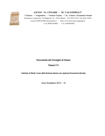 LICEO “G. CESARE – M. VALGIMIGLI” * Classico – * Linguistico – * Scienze Umane – * Sc. Umane / Economico Sociali Presidenza e Segreteria: Via Brighenti, 38 – 47921 Rimini Tel. 0541-23523 Fax 0541-54592 E-mail: [email protected] – Web: www.liceocesarevalgimigli.it C.M. RNPC01000V - C.F. 91059030402 Documento del Consiglio di Classe Classe V C Indirizzo di Studi: Liceo delle Scienze Umane con opzione Economico-Sociale Anno Scolastico 2014 – 15 Indice Finalità generali del corso di studi e quadro orario Membri del Consiglio di classe Profilo della classe Storia della classe Uscite didattiche, viaggi d’istruzione ed altre attività didattiche Simulazioni di terza prova Obiettivi didattici trasversali perseguiti e raggiunti Strumenti e criteri di valutazione Pag. 3 Pag. 4 Pag. 5 Pag. 6 Pag. 7 Pag. 7 Pag. 8 Pag. 8 Allegati: 1. Copia delle simulazioni di terza prova assegnate durante l’anno scolastico, pag. 9 2. Copia delle griglie di valutazione utilizzate per la correzione delle simulazioni, pag. 22 3. Programmi svolti, pag. 28 2 Finalità dell’indirizzo di studio e quadro orario Il Liceo delle Scienze Umane Economico-Sociali - è una NOVITA’ introdotta dalla RIFORMA della Scuola Superiore che allinea l’Italia agli altri Paesi Europei - è orientato a comprendere il mondo di oggi nella sua complessità - le discipline specifiche dell’indirizzo valorizzano la CENTRALITA’ dell’INDIVIDUO nel mondo globalizzato - si colloca all’interno della TRADIZIONE LICEALE coniugando lo studio delle discipline umanistiche con quello delle discipline scientifiche - tutte le discipline curricolari concorrono a leggere ed interpretare la società contemporanea utilizzando linguaggi, metodi e categorie messi a disposizione dalla ricerca scientifica Competenze in uscita, specifiche dell’indirizzo Economico-sociale: - Conoscenza dei significati, dei metodi e delle categorie interpretative messe a disposizione delle scienze economiche, giuridiche e sociologiche; - Consapevolezza dei caratteri dell’economia come scienza delle scelte responsabili sulle risorse di cui l’uomo dispone e del diritto come scienza delle regole di natura giuridica che disciplinano la convivenza sociale; - Individuazione delle categorie antropologiche e sociali utili per la comprensione e classificazione dei fenomeni culturali; - Capacità di misurare, con l’ausilio di strumenti matematici, statistici e informatici, i fenomeni economici e sociali indispensabili alla verifica dei principi teorici; - Capacità di utilizzare le prospettive filosofiche, storico-geografiche e scientifiche nello studio delle interdipendenze tra i fenomeni internazionali, nazionali, locali e personali; - Capacità di identificare il legame esistente fra i fenomeni culturali, economici e sociali e le istituzioni politiche sia in relazione alla dimensione nazionale ed europea sia a quella globale - Acquisizione in una seconda lingua moderna (francese) di strutture, modalità e competenze comunicative corrispondenti almeno al Livello B1 del Quadro Comune Europeo di Riferimento QUADRO ORARIO DEL LICEO DELLE SCIENZE UMANE CON OPZIONE ECONOMICO-SOCIALE Materie 1°anno 2°anno 3°anno 4°anno 5°anno Religione/alternativa 1 1 1 1 1 Italiano 4 4 4 4 4 Storia e Geografia 3 3 - - - Lingua straniera1 Inglese 3 3 3 3 3 Lingua straniera 2 Francese 3 3 3 3 3 Diritto ed Economia 3 3 3 3 3 Scienze Umane* 3 3 3 3 3 Storia - - 2 2 2 Filosofia - -- 2 2 2 Matematica** 3 3 3 3 3 Fisica - - 2 2 2 Scienze naturali*** 2 2 - - - Storia dell’arte - - 2 2 2 Educazione fisica 2 2 2 2 2 Totale unità didattiche 27 27 30 30 30 * Antropologia, Metodologia della ricerca, Psicologia e Sociologia ** con Informatica al primo biennio *** Biologia, Chimica, Scienze della Terra 3 Membri del Consiglio di Classe La composizione del Consiglio di Classe della V C, per l’anno scolastico 2014-15, è riportata nella tabella sottostante. Disciplina Religione Italiano Inglese Francese Diritto ed Economia Scienze Umane Storia Filosofia Matematica Fisica Storia dell’arte Educazione fisica Orario annuo 33 132 99 99 99 99 66 66 99 66 66 66 Docente Bianchi Giorgia Bonci Sara Zardi Sandra Masi Marina Bacchini Valentina Geri Elena Fabbri Paolo Velleca Antonio Gabrielli Elisa Argazzi Rodolfo Di Camillo Nicola Donati Maria Cristina Nel corso del triennio si sono registrati diversi avvicendamenti Terzo anno: docenti di Diritto ed Economia, Scienze Umane (due docenti), Matematica, Inglese, Storia (due docenti) Quarto anno: docenti di Italiano, Diritto ed Economia, Scienze Umane, Filosofia, Storia dell’arte Quinto anno: docenti di Italiano, Diritto ed Economia, Storia, Filosofia, Fisica. 4 Profilo della classe omissis 5 La classe è composta dai seguenti alunni: 1 2 3 4 5 6 7 8 9 10 Cognome Baciu Baronio Calmarini Cosano Fora Gafà Muccioli Muratori Olei Russo Nome Alexandra Gianina Davide Matteo Rojas Alisea Ebi Andrea Carlotta Nicolò Danca Vittoria Storia della classe La storia della VC LES è piuttosto complessa in quanto, oltre all’avvicendamento di molti insegnanti, ci sono stati profondi cambiamenti anche nella composizione della classe. L’attuale VC è composta da un gruppo che non è partito compatto dalla prima e non ha avuto, quindi, lo stesso percorso scolastico per cinque anni. Nell’anno 2010/2011 erano presenti solo IA e IB. Degli attuali alunni di VC solo 3 ragazze erano iscritte in prima, due in IA e una in IB. Nell’anno 2011/2012 è stata formata la classe IIC composta da alcuni ragazzi provenienti dalle due prime dell’anno precedente, da ragazzi provenienti da altre scuole e da ragazzi che hanno ripetuto il secondo anno. Su 17 ragazzi iscritti 8 non sono stati ammessi alla classe successiva. Nell’anno 2012/2013 ,in terza, ai 9 alunni promossi si sono aggiunti 3 ragazzi provenienti da altri Istituti, una ragazza proveniente dall’estero e un ragazzo del LES non ammesso al quarto anno. A fine anno un’alunna è stata respinta. Nell’anno 201