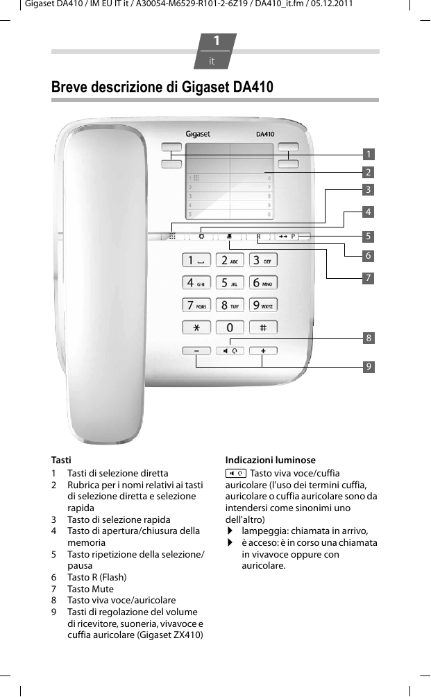 Gigaset DA410 / IM EU IT it / A30054-M6529-R101-2-6Z19 / DA410_it.fm / 05.12.2011 1 it Breve descrizione di Gigaset DA410 1 2 3 4 5 6 7 8 9 Tasti 1 Tasti di selezione diretta 2 Rubrica per i nomi relativi ai tasti di selezione diretta e selezione rapida 3 Tasto di selezione rapida 4 Tasto di apertura/chiusura della memoria 5 Tasto ripetizione della selezione/ pausa 6 Tasto R (Flash) 7 Tasto Mute 8 Tasto viva voce/auricolare 9 Tasti di regolazione del volume di ricevitore, suoneria, vivavoce e cuffia auricolare (Gigaset ZX410) Indicazioni luminose A Tasto viva voce/cuffia auricolare (l'uso dei termini cuffia, auricolare o cuffia auricolare sono da intendersi come sinonimi uno dell'altro) lampeggia: chiamata in arrivo, è acceso: è in corso una chiamata in vivavoce oppure con auricolare. ¤ ¤ Gigaset DA410 / IM EU IT it / A30054-M6529-R101-2-6Z19 / DA410_it.fm / 05.12.2011 2 it Installazione del telefono 2 ¤ Collegare l’estremità corta del cavo spiralato del microtelefono nell’apposita presa del microtelefono e quella lunga alla presa (4). Collegare il cavo di linea in dotazione nella presa (1) situata sul lato inferiore del telefono quindi attestare il lato opposto del cavo nella presa a parete utilizzando apposito adattatore, detto spina tripolare con presa jack (non inclusa nella confezione), se la linea termina (a muro) ancora con la vecchia presa tripolare. Fissare il cavo telefonico nella scanalatura antistrappo usando la scanalatura con uscita verso l’alto (2) per l’uso a tavolo e quella verso il basso (3) per l’installazione a parete. ¤ 5 6 1 4 3 ¤ Collegare l’auricolare Inserire il connettore RJ9 di un auricolare a filo adatto (come ad es. Gigaset ZX410) nella presa (5). Fissaggio a parete Praticare due fori ad una distanza di 7 99,4 mm nella parete e fissare due viti. Rimuovere il supporto a muro del microtelefono (6) con un cacciavite e inserirlo nel vano del microtelefono come indicato in figura (7). In questo modo il microtelefono rimarrà agganciato, tramite l’apposita fessura, anche se il telefono viene posizionato in verticale. Tramite i fori predisposti agganciare il telefono alle viti precedentemente fissate a muro per posizionarlo. Attenzione: Per assicurare un posizionamento stabile del microtelefono inserire il supporto di aggancio del microtelefono come indicato in figura 7. ¤ ¤ ¤ Gigaset DA410 / IM EU IT it / A30054-M6529-R101-2-6Z19 / DA410_it.fm / 05.12.2011 3 it Note di sicurezza e posizionamento Attenzione Per poter sfruttare tutte le prestazioni offerte dal vostro nuovo telefono e per un suo uso corretto e sicuro, invitate chiunque potrebbe usare l’apparato a leggere attentamente il presente manuale d’uso e le note di sicurezza. Durante il posizionamento, il collegamento e l’uso del telefono attenersi alle indicazioni riportate di seguito: u Utilizzare solo i cavi forniti in dotazione, in caso di sostituzione assicurarsi che siano identici agli originali. u Effettuare i collegamenti in modo appropriato ( pag. 2) e posizionare il cavo di linea in modo che non vi sia pericolo di inciamparvisi. u Utilizzare solo gli accessori originali Gigaset, come ad esempio l’auricolare Gigaset ZX410. Auricolari diversi, anche se dotati dello stesso tipo di spinotto, potrebbero funzionare parzialmente oppure non funzionare del tutto. Se si collega un auricolare non Gigaset, per la vostra sicurezza, ridurre il volume di Gigaset DA410 al minimo poiché qualora il segnale acustico nell’auricolare fosse molto alto il suo uso potrebbe causare danni seri e permanenti all’udito. u Posizionare l’apparecchio su una superficie non sdrucciolevole. u Per tutelare la vostra sicurezza e per non danneggiare il telefono evitare assolutamente di utilizzarlo in stanze da bagno o in cabine della doccia (ambienti umidi). Il telefono non è impermeabilizzato. u Evitare temperature estreme, il telefono deve funzionare ad una temperatura compresa tra + 5° C a + 40° C. Non esporre il telefono a fonti di calore o a raggi solari diretti. u Non buttare l’apparato nel fuoco (v. istruzioni per lo smaltimento a fine vita). u Non utilizzare l’apparato in ambienti a rischio di esplosione, ad esempio non utilizzarlo per segnalare una fuga di gas qualora ci si trovi nelle vicinanze della perdita. £ u Non posizionare l’apparato vicino ad altri dispositivi elettrici o campi magnetici onde evitare interferenze reciproche, la qualità della conversazione potrebbe peggiorare. Mantenere almeno circa un metro di distanza. u Proteggere il telefono da polvere, liquidi e vapori aggressivi. u Non inserire oggetti appuntiti e metallici in alcuna delle fessure o prese. u Non toccare i contatti delle prese con oggetti appuntiti e metallici! u Non trasportare il telefono sostenendolo per i cavi! u Generalmente i piedini degli apparecchi non lasciano tracce, tuttavia, su superfici particolarmente delicate come mobili laccati o lucidi, in particolare se trattati con solventi di pulizia a base chimica, è opportuno prendere le necessarie precauzioni. u In caso di cessione dell’apparato consegnare sempre anche il presente manuale d’uso. La rubrica di Gigaset DA410 dispone di una memoria permanente. Prima della cessione a terzi si suggerisce la cancellazione dei numeri di telefono memorizzati. u In caso di guasti scollegare l’apparato e, senza aprirlo, mandarlo in riparazione presso un centro di assistenza autorizzato. Attenzione alla privacy: Conferenza sulla stessa linea Seguendo le istruzioni per la connessione il telefono risulterà sempre collegato in parallelo alla linea telefonica. Praticamente questo consente che il telefono possa essere utilizzato per colloquiare tra più persone (“in conferenza”) con l’eventuale chiamato o chiamante attraverso più telefoni collegati Gigaset DA410 / IM EU IT it / A30054-M6529-R101-2-6Z19 / DA410_it.fm / 05.12.2011 4 it alla stessa linea telefonica. In conversazioni di carattere personale è opportuno d’altra parte assicurarsi di 