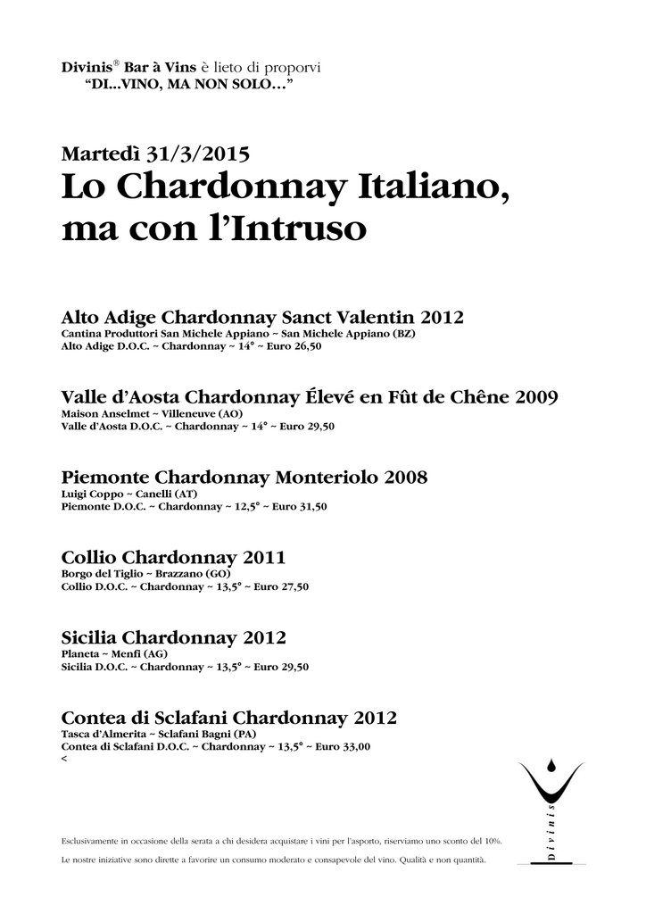 Divinis® Bar à Vins è lieto di proporvi “DI...VINO, MA NON SOLO…” Martedì 31/3/2015 Lo Chardonnay Italiano, ma con l’Intruso Alto Adige Chardonnay Sanct Valentin 2012 Cantina Produttori San Michele Appiano ~ San Michele Appiano (BZ) Alto Adige D.O.C. ~ Chardonnay ~ 14° ~ Euro 26,50 Valle d'Aosta Chardonnay Élevé en Fût de Chêne 2009 Maison Anselmet ~ Villeneuve (AO) Valle d'Aosta D.O.C. ~ Chardonnay ~ 14° ~ Euro 29,50 Piemonte Chardonnay Monteriolo 2008 Luigi Coppo ~ Canelli (AT) Piemonte D.O.C. ~ Chardonnay ~ 12,5° ~ Euro 31,50 Collio Chardonnay 2011 Borgo del Tiglio ~ Brazzano (GO) Collio D.O.C. ~ Chardonnay ~ 13,5° ~ Euro 27,50 Sicilia Chardonnay 2012 Planeta ~ Menfi (AG) Sicilia D.O.C. ~ Chardonnay ~ 13,5° ~ Euro 29,50 Contea di Sclafani Chardonnay 2012 Tasca d'Almerita ~ Sclafani Bagni (PA) Contea di Sclafani D.O.C. ~ Chardonnay ~ 13,5° ~ Euro 33,00 < Esclusivamente in occasione della serata a chi desidera acquistare i vini per l’asporto, riserviamo uno sconto del 10%. Le nostre iniziative sono dirette a favorire un consumo moderato e consapevole del vino. Qualità e non quantità. CHARDONNAY Un nome così familiare agli appassionati di vino di tutto il mondo che molti non sanno che si tratta di una varietà viticola. Nella terra natia, la Borgogna, lo Chardonnay è stato a lungo l'unico vitigno da cui derivavano tutti i migliori bianchi. Perciò, in una terra che si affida alle indicazioni geografiche, il suo nome era noto solo ai viticoltori. Tutto è cambiato in tempi recenti, con l'introduzione di etichette varietali, quando Chardonnay è diventato in pratica un marchio di fabbrica. È tanto popolare che non si usano quasi mai sinonimi (ma qualche austriaco della Stiria continua a chiamarlo Morillon). Il livello alcolico relativamente elevato del vino, che sovente può lasciare una sensazione di lieve dolcezza, ha probabilmente contribuito a tale popolarità, come l'ovvio richiamo del rovere usato molto spesso per produrlo. Non sono però soltanto gli appassionati di vino ad apprezzare le grandi attrattive, facili da cogliere e difficili da descrivere, del dorato Chardonnay (l'iniziativa dell'Australian Wine Research Institute, un'analisi delle componenti aromatiche delle varietà maggiori, ha incontrato nello Chardonnay un soggetto particolarmente sfuggente, identificando componenti che si trovano anche in lamponi, vaniglia, frutti tropicali, pesche, pomodori, tabacco, tè e petali di rose). I viticoltori apprezzano la facilità con cui possono ricavare rese relativamente alte da questo vitigno in climi diversi tra loro (può rendersi necessario limitarne la vigoria naturale con un'alta densità d'impianto o con il controllo della vegetazione). Ma la qualità del vino è fortemente compromessa da rese superiori a 80 hl/ha, e per ottenere vini di grande qualità bisogna limitarsi a 30 hl/ha o meno. L'unica seria riserva è che la vite germoglia abbastanza presto, subito dopo il Pinot Noir, con conseguente, regolare rischio di gelate primaverili per le vigne più fredde di Chablis e Champagne. La vite è soggetta a colatura e occasionalmente ad acinellatura e le bucce degli acini, piuttosto sottili, possono favorire il marciume se piove in vendemmia, ma si sviluppa in climi diversi come quello di Chablis in Francia settentrionale e nella calda Riverland australiana. Il momento della vendemmia è cruciale perché lo Chardonnay, diversamente dal Cabernet Sauvignon, può perdere rapidamente nelle fasi successive di maturazione la necessaria acidità. I produttori amano lo Chardonnay per la sua maturità regolarmente buona e la sua flessibilità. Risponde positivamente a una serie di tecniche di vinificazione ben più ampia di altre varietà: allo Chardonnay si può applicare la ricetta della Mosella o del Vouvray, ossia una lunga macerazione a bassa temperatura seguita da un immediato imbottigliamento, oppure lo si può fermentare e affinare in botticelle di rovere, e il frutto di qualità superiore sopporta bene il legno nuovo. Si piega senza difficoltà alla scelta di ciascun produttore in fatto di fermentazione malolattica, per ammorbidire il vino, e di bàtonnage. È altresì un ingrediente essenziale in gran parte dei migliori spumanti del mondo, non solo nello Champagne, dimostrando la sua capacità di invecchiare in bottiglia anche quando è vendemmiato precocemente. Se invece viene vendemmiato tardi, ha dimostrato di saper produrre alcuni vini dolci degni di lode, in particolare nel Màconnais, in Romania e in Nuova Zelanda, da uve attaccate dal marciume nobile. Riesce a conservare in buona parte il suo carattere anche quando è tagliato con altre varietà meno di moda come Chenin Blanc, Sémillon o Colombard per soddisfare la domanda del segmento più basso del mercato, forse perché il suo carattere, diversamente da quello dell'altro bianco di gran moda, il Sauvignon Blanc, non è troppo marcato. Lo Chardonnay di viti giovani o troppo produttive può risultare quasi acquoso. I prodotti di base sono appena fruttati (mela o melone), ma al suo meglio questo vitigno, come il Pinot Noir, non è che il mezzo d'espressione del carattere della vigna in cui cresce. In molti altri vini ambiziosi fatti a immagine dei grandi Bourgogne bianchi il suo «gusto» in realtà è quello del rovere in cui è stato affinato o il risultato delle tecniche di vinificazione impiegate (si veda sopra). Quando il vigneto è sito nel posto giusto, le rese non sono eccessive, l'acidità non troppo bassa e la vinificazione corretta, lo Chardonnay può dare vini che continuano a migliorare in bottiglia per uno, due e eccezionalmente più decenni, ma non è una varietà in grado di dare vini di lunghissima durata, al contrario del RIESLING e dei migliori CHENIN BLANC e SÉMILLON colpiti dalla botrite. Le origini dello Chardonnay sono oscure. Si è creduto a lungo che fosse una mutazione bianca del Pinot Noir, tanto da essere chiamato Pinot Chardonnay, ma Galet offre valide indicazi