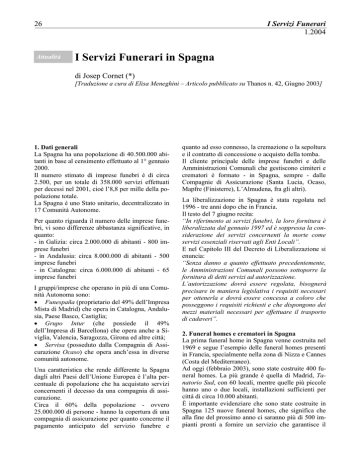26 Attualità I Servizi Funerari 1.2004 I Servizi Funerari in Spagna di Josep Cornet (*) [Traduzione a cura di Elisa Meneghini – Articolo pubblicato su Thanos n. 42, Giugno 2003] 1. Dati generali La Spagna ha una popolazione di 40.500.000 abitanti in base al censimento effettuato al 1° gennaio 2000. Il numero stimato di imprese funebri è di circa 2.500, per un totale di 358.000 servizi effettuati per decessi nel 2001, cioè l’8,8 per mille della popolazione totale. La Spagna è uno Stato unitario, decentralizzato in 17 Comunità Autonome. Per quanto riguarda il numero delle imprese funebri, vi sono differenze abbastanza significative, in quanto: - in Galizia: circa 2.000.000 di abitanti - 800 imprese funebri - in Andalusia: circa 8.000.000 di abitanti - 500 imprese funebri - in Catalogna: circa 6.000.000 di abitanti - 65 imprese funebri I gruppi/imprese che operano in più di una Comunità Autonoma sono: • Funespaña (proprietario del 49% dell’Impresa Mista di Madrid) che opera in Catalogna, Andalusia, Paese Basco, Castiglia; • Grupo Intur (che possiede il 49% dell’Impresa di Barcellona) che opera anche a Siviglia, Valencia, Saragozza, Girona ed altre città; • Servisa (posseduto dalla Compagnia di Assicurazione Ocaso) che opera anch’essa in diverse comunità autonome. Una caratteristica che rende differente la Spagna dagli altri Paesi dell’Unione Europea è l’alta percentuale di popolazione che ha acquistato servizi concernenti il decesso da una compagnia di assicurazione. Circa il 60% della popolazione - ovvero 25.000.000 di persone - hanno la copertura di una compagnia di assicurazione per quanto concerne il pagamento anticipato del servizio funebre e quanto ad esso connesso, la cremazione o la sepoltura e il contratto di concessione o acquisto della tomba. Il cliente principale delle imprese funebri e delle Amministrazioni Comunali che gestiscono cimiteri e crematori è formato - in Spagna, sempre - dalle Compagnie di Assicurazione (Santa Lucia, Ocaso, Mapfre (Finisterre), L’Almudena, fra gli altri). La liberalizzazione in Spagna è stata regolata nel 1996 - tre anni dopo che in Francia. Il testo del 7 giugno recita: “In riferimento ai servizi funebri, la loro fornitura è liberalizzata dal gennaio 1997 ed è soppressa la considerazione dei servizi concernenti la morte come servizi essenziali riservati agli Enti Locali”. E nel Capitolo III del Decreto di Liberalizzazione si enuncia: “Senza danno a quanto effettuato precedentemente, le Amministrazioni Comunali possono sottoporre la fornitura di detti servizi ad autorizzazione. L’autorizzazione dovrà essere regolata, bisognerà precisare in maniera legislativa i requisiti necessari per ottenerla e dovrà essere concessa a coloro che posseggono i requisiti richiesti e che dispongono dei mezzi materiali necessari per effettuare il trasporto di cadaveri”. 2. Funeral homes e crematori in Spagna La prima funeral home in Spagna venne costruita nel 1969 e segue l’esempio delle funeral homes presenti in Francia, specialmente nella zona di Nizza e Cannes (Costa del Mediterraneo). Ad oggi (febbraio 2003), sono state costruite 400 funeral homes. La più grande è quella di Madrid, Tanatorio Sud, con 60 locali, mentre quelle più piccole hanno uno o due locali, installazioni sufficienti per città di circa 10.000 abitanti. È importante evidenziare che sono state costruite in Spagna 125 nuove funeral homes, che significa che alla fine del prossimo anno ci saranno più di 500 impianti pronti a fornire un servizio che garantisce il 27 mantenimento della sanità pubblica, con riguardo ai processi degenerativi che intervengono dopo la morte e che possono colpire le persone, se non vengono seguite le regole per il trattamento igienico dei cadaveri raccomandate dal Ministero della Salute. Le Comunità Autonome meglio dotate di questo tipo di impianto, protettore della sanità pubblica, sono: - Catalogna 91 - Castiglia-León 52 - Galizia 36 - Valencia 35 - Navarra 24 Per quanto concerne le isole che formano comunità autonome diverse: - Isole Canarie 14 - Isole Baleari 5 Riguardo ai Crematori, il loro aumento in Spagna è stato spettacolare. In Spagna (febbraio 2003) esistono in totale 107 crematori, con 141 forni crematori. I crematori in progetto o in corso di costruzione sono 32. Questo numero di impianti sta a significare che qualsiasi cittadino in Spagna avrà un crematorio ad una distanza massima di 50 km. Oggi vi sono, tra le Canarie, delle isole che non dispongono ancora di crematorio, come Hierro, Gomera, Las Palmas, ma invece Ceuta e Melilla offrono questo servizio. Il primo impianto di cremazione fu costruito a Madrid nel 1974 ed il secondo a Saragozza nel 1979. Gli ultimi 12 anni (1990-2002) hanno dimostrato il consolidamento della cremazione in Spagna, grazie alle posizioni progressiste della Chiesa Cattolica che non ha fatto opposizione a questa pratica, considerata una scelta valida per la disposizione dei corpi, purché questa scelta non venga attuata per ragioni anti-cristiane o anti-religiose. Nel 2002 sono state eseguite 59.000 cremazioni su un totale 355.000 decessi (stima), cioè un totale del 16%, molto vicino alle cifre della Francia (19% nel 2001) e molto più alto rispetto a quelle dell’Italia (5%). Il consolidamento della cremazione in Spagna è una questione di pochi anni, poiché la stima per il 2008 sarà all’incirca del 25% del totale dei servizi funebri effettuati. 3. Tanatoprassi I trattamenti di tanatoprassi sono considerati importanti poiché determinano un miglioramento evidente nel trattamento sanitario del cadavere e I Servizi Funerari 1.2004 di conseguenza nel mantenimento della sanità pubblica. Il pioniere spagnolo in queste tecniche è Barcellona, che ha seguito le tecniche francesi, ed il progresso negli ultimi 5 anni è stato sostanziale. Questo servizio è importante per: • la presentazione del defunto in cassa aperta • la conservazione del cadavere (minimo 2 anni) 