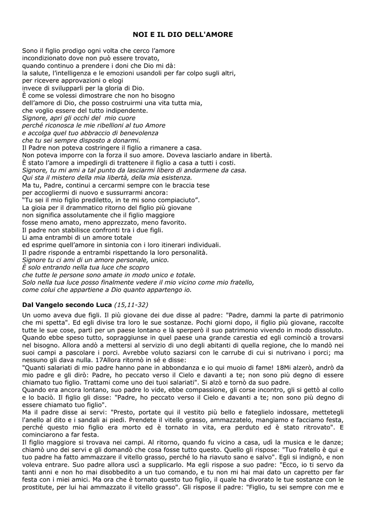 NOI E IL DIO DELL'AMORE Sono il figlio prodigo ogni volta che cerco l’amore incondizionato dove non può essere trovato, quando continuo a prendere i doni che Dio mi dà: la salute, l’intelligenza e le emozioni usandoli per far colpo sugli altri, per ricevere approvazioni o elogi invece di svilupparli per la gloria di Dio. È come se volessi dimostrare che non ho bisogno dell’amore di Dio, che posso costruirmi una vita tutta mia, che voglio essere del tutto indipendente. Signore, apri gli occhi del mio cuore perché riconosca le mie ribellioni al tuo Amore e accolga quel tuo abbraccio di benevolenza che tu sei sempre disposto a donarmi. Il Padre non poteva costringere il figlio a rimanere a casa. Non poteva imporre con la forza il suo amore. Doveva lasciarlo andare in libertà. È stato l’amore a impedirgli di trattenere il figlio a casa a tutti i costi. Signore, tu mi ami a tal punto da lasciarmi libero di andarmene da casa. Qui sta il mistero della mia libertà, della mia esistenza. Ma tu, Padre, continui a cercarmi sempre con le braccia tese per accogliermi di nuovo e sussurrarmi ancora: “Tu sei il mio figlio prediletto, in te mi sono compiaciuto”. La gioia per il drammatico ritorno del figlio più giovane non significa assolutamente che il figlio maggiore fosse meno amato, meno apprezzato, meno favorito. Il padre non stabilisce confronti tra i due figli. Li ama entrambi di un amore totale ed esprime quell’amore in sintonia con i loro itinerari individuali. Il padre risponde a entrambi rispettando la loro personalità. Signore tu ci ami di un amore personale, unico. È solo entrando nella tua luce che scopro che tutte le persone sono amate in modo unico e totale. Solo nella tua luce posso finalmente vedere il mio vicino come mio fratello, come colui che appartiene a Dio quanto appartengo io. Dal Vangelo secondo Luca (15,11-32) Un uomo aveva due figli. Il più giovane dei due disse al padre: "Padre, dammi la parte di patrimonio che mi spetta". Ed egli divise tra loro le sue sostanze. Pochi giorni dopo, il figlio più giovane, raccolte tutte le sue cose, partì per un paese lontano e là sperperò il suo patrimonio vivendo in modo dissoluto. Quando ebbe speso tutto, sopraggiunse in quel paese una grande carestia ed egli cominciò a trovarsi nel bisogno. Allora andò a mettersi al servizio di uno degli abitanti di quella regione, che lo mandò nei suoi campi a pascolare i porci. Avrebbe voluto saziarsi con le carrube di cui si nutrivano i porci; ma nessuno gli dava nulla. 17Allora ritornò in sé e disse: "Quanti salariati di mio padre hanno pane in abbondanza e io qui muoio di fame! 18Mi alzerò, andrò da mio padre e gli dirò: Padre, ho peccato verso il Cielo e davanti a te; non sono più degno di essere chiamato tuo figlio. Trattami come uno dei tuoi salariati". Si alzò e tornò da suo padre. Quando era ancora lontano, suo padre lo vide, ebbe compassione, gli corse incontro, gli si gettò al collo e lo baciò. Il figlio gli disse: "Padre, ho peccato verso il Cielo e davanti a te; non sono più degno di essere chiamato tuo figlio". Ma il padre disse ai servi: "Presto, portate qui il vestito più bello e fateglielo indossare, mettetegli l'anello al dito e i sandali ai piedi. Prendete il vitello grasso, ammazzatelo, mangiamo e facciamo festa, perché questo mio figlio era morto ed è tornato in vita, era perduto ed è stato ritrovato". E cominciarono a far festa. Il figlio maggiore si trovava nei campi. Al ritorno, quando fu vicino a casa, udì la musica e le danze; chiamò uno dei servi e gli domandò che cosa fosse tutto questo. Quello gli rispose: "Tuo fratello è qui e tuo padre ha fatto ammazzare il vitello grasso, perché lo ha riavuto sano e salvo". Egli si indignò, e non voleva entrare. Suo padre allora uscì a supplicarlo. Ma egli rispose a suo padre: "Ecco, io ti servo da tanti anni e non ho mai disobbedito a un tuo comando, e tu non mi hai mai dato un capretto per far festa con i miei amici. Ma ora che è tornato questo tuo figlio, il quale ha divorato le tue sostanze con le prostitute, per lui hai ammazzato il vitello grasso". Gli rispose il padre: "Figlio, tu sei sempre con me e tutto ciò che è mio è tuo; ma bisognava far festa e rallegrarsi, perché questo tuo fratello era morto ed è tornato in vita, era perduto ed è stato ritrovato". Riflessione di don Gianluca Zurra NOI E IL DIO DELL’AMORE - Sulle tracce del Padre misericordioso Il titolo dell’incontro ci mette già sulla giusta strada. Prima di tutto, “noi” sta a significare che non esiste rapporto con Dio che non implichi tutta la nostra concreta libertà. Le parabole custodiscono questo segreto fondamentale: costringono ciascuno di noi a prendere posizione, nessuno può stare alla finestra. Togli la storia, la concretezza delle cose, la sensibilità … perdi Dio stesso, che non si rivela altrove, ma proprio e soltanto nella relazione vissuta e nello spessore del terreno storico. In seconda battuta, l’espressione “il Dio dell’amore” indica che non è in gioco un qualunque Dio, ma il Padre di Gesù, di cui il Figlio fa esperienza dentro la sua stessa corporeità. Le parabole rivelano come Gesù, attraversando i paesaggi più consueti della sua esistenza, percepisce come presente e all’opera il Padre suo. Entriamo dunque nella parabola del Padre misericordioso per lasciare che sia essa a porre le condizioni perché ciascuno di noi faccia esperienza di un Dio così. 1. Il padre: creazione come nascita Il padre lascia partire il figlio, semplicemente perché riconosce nell’inevitabilità di quello stacco il gesto più trasparente del senso dell’educazione e della nascita. Il figlio non è possesso dei genitori, ma promessa che libera da ogni forma di dominio: il figlio deve imparare a camminare con le proprie gambe. Il senso della creazione è racchiuso in questo gesto sorprendente del padre: Dio crea l’uomo come colui che lo fronteggia nella sua libertà, ed è pronto a lascia