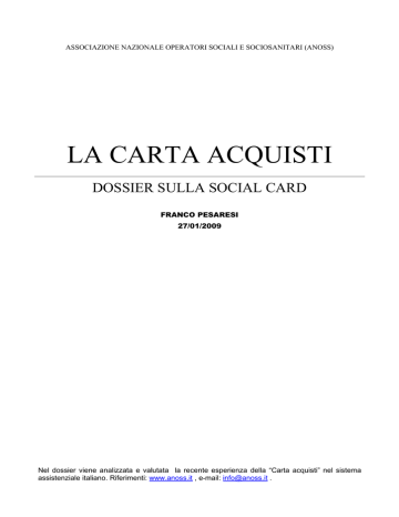 ASSOCIAZIONE NAZIONALE OPERATORI SOCIALI E SOCIOSANITARI (ANOSS) LA CARTA ACQUISTI DOSSIER SULLA SOCIAL CARD FRANCO PESARESI 27/01/2009 Nel dossier viene analizzata e valutata la recente esperienza della “Carta acquisti” nel sistema assistenziale italiano. Riferimenti: www.anoss.it , e-mail: [email protected] . Indice Pag. 1. L’istituzione della “Carta acquisti” 2 2. I beneficiari della “Carta acquisti” 2.1. Requisiti per ottenere la Carta acquisti 2.2. Requisiti molto stringenti 2.3. Il basso numero dei beneficiari 2.4. La Carta acquisti è efficace? 2 2 5 5 7 3. Le procedure per l’attivazione della Carta 3.1. La presentazione della domanda 3.2. Accredito della provvista e successivi controlli 3.3. La mancata copertura della Carta 8 8 9 9 4. L’uso della Carta 4.1. La Carta è anonima? 10 10 5. I commercianti 11 6. Il finanziamento e il costo della Carta 6.1. Il finanziamento della Carta 6.2. Il finanziamento privato della Carta 6.3. Le varie ipotesi governative di finanziamento 6.4. Il costo amministrativo di gestione del sistema 12 12 13 14 15 7. Le esperienze straniere 7.1. L’esperienza statunitense 7.2. Le esperienze europee 7.3. Insegnamenti dalle esperienze straniere 16 16 17 17 8. Conclusioni 18 Riferimenti normativi 20 Bibliografia 20 2 1. L’ISTITUZIONE DELLA “CARTA ACQUISTI” 1 Il Decreto Legge n. 112/20082 ha istituito la "Carta acquisti" finalizzata all'acquisto da parte di soggetti poveri di beni destinati al soddisfacimento delle esigenze prioritariamente di natura alimentare e successivamente anche energetiche, con onere a carico dello Stato. Si tratta di una carta a banda magnetica prepagata e ricaricabile sulla quale vengono accreditati, a favore degli aventi diritto, 40 euro mensili con cui potranno essere acquistati generi alimentari o potranno essere pagate bollette di pubblici servizi. La Carta acquisti (o “social card” termine spesso usato nel linguaggio giornalistico) è una normale carta di pagamento elettronica emessa da Poste italiane, che potrà essere utilizzata per effettuare acquisti in tutti i negozi alimentari abilitati al circuito Mastercard, nonché per il pagamento delle bollette della luce e del gas. Inoltre, nei negozi che espongono lo stesso simbolo (carrellino) presente sulla carta potranno essere ottenuti degli sconti aggiuntivi. Ai possessori di Carta acquisti si applicano anche le tariffe agevolate per il consumo di energia elettrica. Il fine è quello di sostenere i consumi delle famiglie in difficoltà. Due decreti ministeriali3, hanno stabilito sia le modalità di emissione e di funzionamento della Carta acquisti, nonché i requisiti per l'ottenimento della stessa. 2. I BENEFICIARI DELLA “CARTA ACQUISTI” 2.1. Requisiti per ottenere la Carta acquisti La Carta acquisti spetta ai cittadini italiani, residenti in Italia con età pari o superiore a 65 anni, o di età non superiore a tre anni. In quest'ultimo caso la Carta dovrà essere richiesta, per ciascun figlio inferiore a tre anni, da uno dei genitori, dal tutore, o dall'affidatario. Sono poi previsti i seguenti ulteriori requisiti che devono essere tutti posseduti dal soggetto richiedente: a) SOGGETTO DI ETA' PARI O SUPERIORE A 65 ANNI • essere soggetto incapiente (è da considerarsi soggetto incapiente il soggetto la cui imposta netta, ai fini dell'imposta sul reddito delle persone fisiche, risulta pari a zero con riferimento al secondo periodo di imposta antecedente al momento di richiesta o di verifica); • godere di trattamenti pensionistici di importo inferiore a euro 6.000 o di importo inferiore a euro 8.000 se di età pari o superiore a 70 anni; nel caso in cui l'importo dei trattamenti dipenda da redditi propri, il cumulo dei redditi e dei trattamenti deve essere inferiore a tali soglie; i redditi propri da considerare sono quelli rilevanti ai fini della definizione dell'ammontare dei trattamenti. A questo fine rilevano tutti i trattamenti pensionistici di qualunque tipologia, compresi quelli esenti da Irpef (come, ad esempio, rendita INAIL, invalidità civile o indennità di accompagnamento), ovvero le quote di trattamento non 1 L’associazione nazionale operatori sociali e sociosanitari (ANOSS) è una associazione che riunisce tutti gli operatori pubblici e privati del settore sociale e sociosanitario. Franco Pesaresi è il presidente dell’ANOSS. Sito web: www.anoss.it , indirizzo e-mail: [email protected] . 2 convertito, con modificazioni, con la legge 6 agosto 2008, n. 133 (articolo 81, comma 32). 3 decreto del Ministero dell’Economia e delle finanze del Ministero del lavoro, della salute e delle politiche sociali n. 89030 del 16 settembre 2008, modificato con il decreto del Ministero dell’Economia e delle finanze del Ministero del lavoro, della salute e delle politiche sociali n. 104376 del 7 novembre 2008. 3 • • • imponibili ai fini fiscali (come la maggiorazione sociale). La verifica deve essere effettuata tramite l'accesso al casellario centrale dei pensionati, e deve essere effettuata anche con riferimento alle prestazioni erogate da enti diversi dall'INPS. Nel caso in cui almeno uno dei trattamenti sia collegato al reddito, il requisito reddituale richiesto per la concessione della Carta deve essere verificato congiuntamente ai redditi rilevanti per la determinazione del trattamento stesso. Nella valutazione devono essere presi in considerazione i soli redditi personali che incidono sulla determinazione del diritto e della misura della prestazione collegata al reddito. I redditi devono essere verificati in base all'informazione memorizzata nel database delle pensioni. In particolare: o nel caso in cui la prestazione sia integrata al trattamento minimo, devono essere verificati i redditi personali rilevanti ai fini dell'integrazione al trattamento minimo; o nel caso in cui vengano erogate prestazioni accessorie funzionali al reddito (quali maggiorazione sociale o quattordicesima) devono essere verificati i redditi personali rile