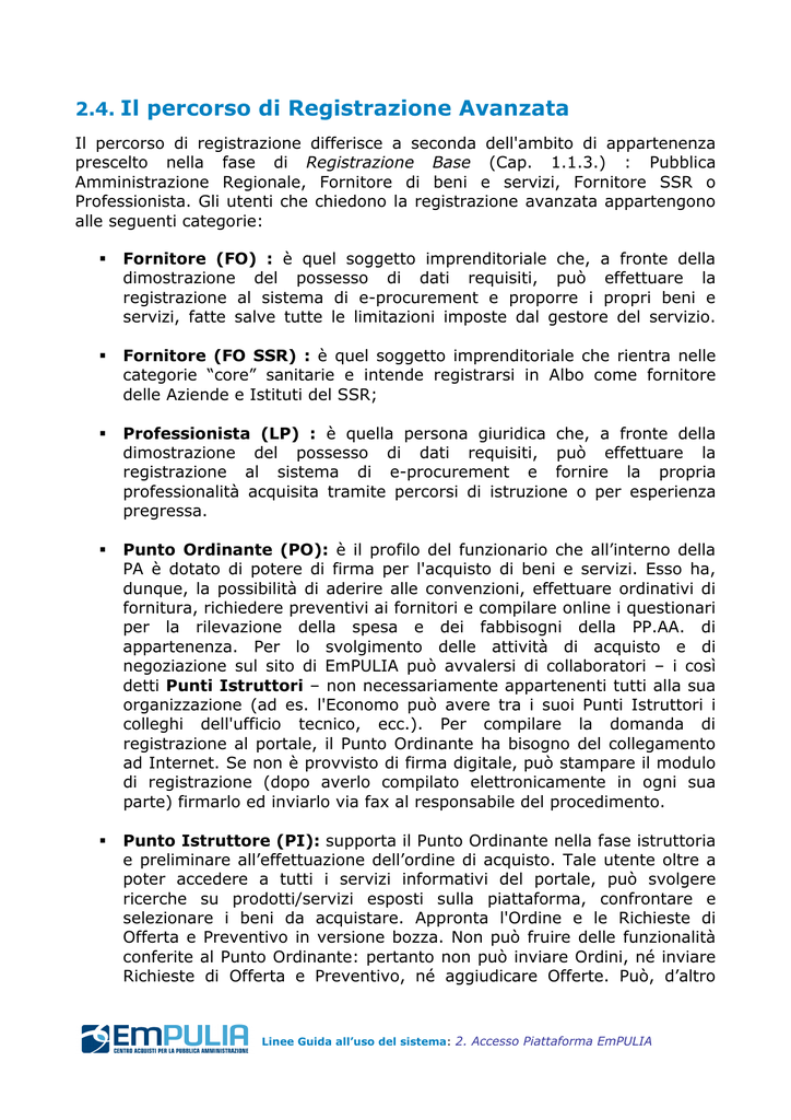 2.4. Il percorso di Registrazione Avanzata Il percorso di registrazione differisce a seconda dell'ambito di appartenenza prescelto nella fase di Registrazione Base (Cap. 1.1.3.) : Pubblica Amministrazione Regionale, Fornitore di beni e servizi, Fornitore SSR o Professionista. Gli utenti che chiedono la registrazione avanzata appartengono alle seguenti categorie: Fornitore (FO) : è quel soggetto imprenditoriale che, a fronte della dimostrazione del possesso di dati requisiti, può effettuare la registrazione al sistema di e-procurement e proporre i propri beni e servizi, fatte salve tutte le limitazioni imposte dal gestore del servizio. Fornitore (FO SSR) : è quel soggetto imprenditoriale che rientra nelle categorie “core” sanitarie e intende registrarsi in Albo come fornitore delle Aziende e Istituti del SSR; Professionista (LP) : è quella persona giuridica che, a fronte della dimostrazione del possesso di dati requisiti, può effettuare la registrazione al sistema di e-procurement e fornire la propria professionalità acquisita tramite percorsi di istruzione o per esperienza pregressa. Punto Ordinante (PO): è il profilo del funzionario che all’interno della PA è dotato di potere di firma per l'acquisto di beni e servizi. Esso ha, dunque, la possibilità di aderire alle convenzioni, effettuare ordinativi di fornitura, richiedere preventivi ai fornitori e compilare online i questionari per la rilevazione della spesa e dei fabbisogni della PP.AA. di appartenenza. Per lo svolgimento delle attività di acquisto e di negoziazione sul sito di EmPULIA può avvalersi di collaboratori – i così detti Punti Istruttori – non necessariamente appartenenti tutti alla sua organizzazione (ad es. l'Economo può avere tra i suoi Punti Istruttori i colleghi dell'ufficio tecnico, ecc.). Per compilare la domanda di registrazione al portale, il Punto Ordinante ha bisogno del collegamento ad Internet. Se non è provvisto di firma digitale, può stampare il modulo di registrazione (dopo averlo compilato elettronicamente in ogni sua parte) firmarlo ed inviarlo via fax al responsabile del procedimento. Punto Istruttore (PI): supporta il Punto Ordinante nella fase istruttoria e preliminare all’effettuazione dell’ordine di acquisto. Tale utente oltre a poter accedere a tutti i servizi informativi del portale, può svolgere ricerche su prodotti/servizi esposti sulla piattaforma, confrontare e selezionare i beni da acquistare. Appronta l'Ordine e le Richieste di Offerta e Preventivo in versione bozza. Non può fruire delle funzionalità conferite al Punto Ordinante: pertanto non può inviare Ordini, né inviare Richieste di Offerta e Preventivo, né aggiudicare Offerte. Può, d’altro Linee Guida all’uso del sistema: 2. Accesso Piattaforma EmPULIA canto, registrarsi autonomamente al sito, ma deve inserire la UserID del Punto Ordinante di riferimento, per ottenere la sua approvazione. Per compilare il modulo di registrazione on line occorre imputare a sistema i dati anagrafici personali e per le pubbliche amministrazioni dell’Ente di appartenenza. La sessione di lavoro relativa alla compilazione del modulo suddetto, per ragioni di sicurezza, termina automaticamente dopo qualche minuto di inattività dell’utente. Linee Guida all’uso del sistema: 2. Accesso Piattaforma EmPULIA 2.4.3. Registrazione come PA Gli utenti della PA possono alternativamente registrarsi come: • Punto Ordinante • Punto Istruttore 2.4.3.1. Registrazione come Punto Ordinante Nella procedura di registrazione avanzata, l’utente della PA, che intende registrarsi come Punto Ordinante, dopo essersi autenticato entra nella pagina a lui riservata - ben visibile dalla scritta in alto a sinistra «Benvenuto Nome Cognome (Sanità, Regione, Enti Locali, Altri Enti) ». Il primo passo è quello di scegliere il profilo di registrazione mediante la pressione del link “Registrati come Punto Ordinante” per poi eseguire il corrispondente percorso di registrazione avanzata. Le prime informazioni da inserire riguardano i dati anagrafici (i campi contrassegnati con l’asterisco sono obbligatori) e i dati relativi alla Pubblica Amministrazione di Appartenenza. Linee Guida all’uso del sistema: 2. Accesso Piattaforma EmPULIA Inserire i campi Nome, Cognome, Codice Fiscale, Luogo e Data di Nascita (nel formato gg/mm/aaaa). Ricorda che il sistema svolge un controllo automatico sul C.F. pertanto eventuali errori di digitazione impediscono all’utente di proseguire. Inserire poi l’Ufficio d’appartenenza, la Qualifica, il Telefono, il Fax e l’indirizzo E-mail. Se l’utente, possedendo l’apposito dispositivo di firma digitale, intende utilizzarlo ai fini della registrazione, deve selezionare il “radio button” Firma digitale; in caso contrario Nessun dispositivo di Firma. Se per ogni singolo acquisto è definito un limite di spesa, allora selezionare il “radio button” SI indicando nella casella di testo che comparirà, l’importo massimo in euro (€) comprensivo di IVA. In alternativa selezionare il “radio button” NO. Linee Guida all’uso del sistema: 2. Accesso Piattaforma EmPULIA Nella fase successiva bisogna inserire i dati relativi alla PA di appartenenza. Per semplificare la procedura ed evitare errori di digitazione è possibile, premendo il pulsante “ Anagrafica ”, ricercare e selezionare l’anagrafica della propria struttura. E’ possibile in alternativa, digitare le informazioni Denominazione, Partita IVA, Indirizzo, Numero Civico, Comune, Provincia, CAP, Nazione. Nel riquadro relativo all’Anagrafica della Pubblica Amministrazione è possibile filtrare i dati per denominazione o per provincia; la Tipologia è impostata a priori dal sistema riportando l’ambito di appartenenza indicato nella registrazione base (Regione, Sanità, Enti Locali, Altri Enti). Linee Guida all’uso del sistema: 2. Accesso Piattaforma EmPULIA Premere il pulsante “Filtra” per visualizzare le PA che soddisfano i suddet