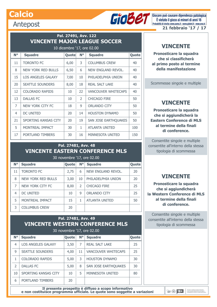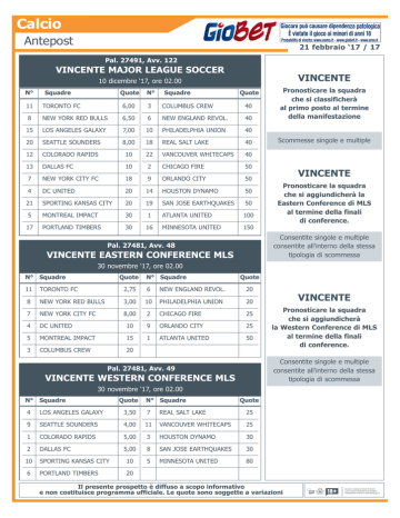 Calcio Antepost 21 febbraio ‘17 / 17 Pal. 27491, Avv. 122 VINCENTE MAJOR LEAGUE SOCCER VINCENTE 10 dicembre ‘17, ore 02.00 N° Squadre Quote N° Squadre Quote 11 TORONTO FC 6,00 3 COLUMBUS CREW 40 8 NEW YORK RED BULLS 6,50 6 NEW ENGLAND REVOL. 40 15 LOS ANGELES GALAXY 7,00 10 PHILADELPHIA UNION 40 20 SEATTLE SOUNDERS 8,00 18 REAL SALT LAKE 40 12 COLORADO RAPIDS 10 22 VANCOUVER WHITECAPS 40 13 DALLAS FC 10 2 CHICAGO FIRE 50 7 NEW YORK CITY FC 18 9 ORLANDO CITY 50 4 DC UNITED 20 14 HOUSTON DYNAMO 50 21 SPORTING KANSAS CITY 20 19 SAN JOSE EARTHQUAKES 50 5 MONTREAL IMPACT 30 1 ATLANTA UNITED 100 17 PORTLAND TIMBERS 30 16 MINNESOTA UNITED 150 Pronosticare la squadra che si classificherà al primo posto al termine della manifestazione Scommesse singole e multiple VINCENTE Pronosticare la squadra che si aggiundicherà la Eastern Conference di MLS al termine della finali di conference. Consentite singole Cons e multiple consentite all'interno della stessa tipologia di scommessa Pal. 27481, Avv. 48 VINCENTE EASTERN CONFERENCE MLS 30 novembre ‘17, ore 02.00 N° Squadre Quote N° Squadre Quote 11 TORONTO FC 2,75 6 NEW ENGLAND REVOL. 20 8 NEW YORK RED BULLS 3,00 10 PHILADELPHIA UNION 20 7 NEW YORK CITY FC 8,00 2 CHICAGO FIRE 25 4 DC UNITED 10 9 ORLANDO CITY 25 5 MONTREAL IMPACT 15 1 ATLANTA UNITED 50 3 COLUMBUS CREW 20 VINCENTE Pronosticare la squadra che si aggiundicherà la Western Conference di MLS al termine della finali di conference. Consentite singole Con e multiple consentite all'interno della stessa tipologia di scommessa Pal. 27481, Avv. 49 VINCENTE WESTERN CONFERENCE MLS 30 novembre ‘17, ore 02.00 N° Squadre Quote N° Squadre Quote 4 LOS ANGELES GALAXY 3,50 7 REAL SALT LAKE 25 9 SEATTLE SOUNDERS 4,00 11 VANCOUVER WHITECAPS 25 1 COLORADO RAPIDS 5,00 3 HOUSTON DYNAMO 30 2 DALLAS FC 5,00 8 SAN JOSE EARTHQUAKES 30 10 SPORTING KANSAS CITY 10 5 MINNESOTA UNITED 80 6 PORTLAND TIMBERS 20 Il presente prospetto è diffuso a scopo informativo e non costituisce programma ufficiale. Le quote sono soggette a variazioni Giocare è vietato ai minori di 18 anni e può causare dipendenza patologica. Probabilità di vincita su www.aams.gov.it.