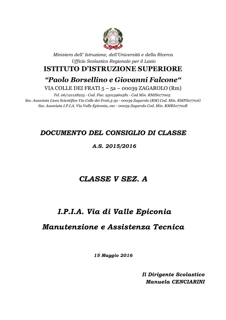 Ministero dell’ Istruzione, dell’Università e della Ricerca Ufficio Scolastico Regionale per il Lazio ISTITUTO D’ISTRUZIONE SUPERIORE “Paolo Borsellino e Giovanni Falcone“ VIA COLLE DEI FRATI 5 – 5a – 00039 ZAGAROLO (Rm) Tel. 06/121128225 - Cod. Fisc. 93015960581 - Cod Min. RMIS077005 Sez. Associata Liceo Scientifico Via Colle dei Frati,5-5a - 00039 Zagarolo (RM) Cod. Min. RMPS07701G Sez. Associata I.P.I.A. Via Valle Epiconia, snc - 00039 Zagarolo Cod. Min. RMRI07701R DOCUMENTO DEL CONSIGLIO DI CLASSE A.S. 2015/2016 CLASSE V SEZ. A I.P.I.A. Via di Valle Epiconia Manutenzione e Assistenza Tecnica 15 Maggio 2016 Il Dirigente Scolastico Manuela CENCIARINI Indice generale 1. Informazioni di carattere generale sull'Istituto Scolastico..................................................4 1.1 Caratteristiche dell’Istituto............................................................................................4 1.2 L’Istituto Professionale..................................................................................................4 1.2.1 Strutture della scuola..............................................................................................4 1.2.2 L'indirizzo “Manutenzione e assistenza tecnica”...................................................4 1.2.3 Prospettive di lavoro...............................................................................................5 2. Profilo ed evoluzione storica della classe.............................................................................6 2.1 Elenco degli alunni.........................................................................................................8 2.2 Consiglio di classe..........................................................................................................9 3. Metodologie e strumenti didattici adottati nel percorso formativo..................................10 3.1 Strumenti di verifica.....................................................................................................11 3.2 Attività finalizzate all’integrazione del percorso formativo........................................13 4. Relazioni finali e programmi svolti.....................................................................................14 4.1 Relazione finale e programmi svolti delle discipline “Lingua e letteratura italiana” e “Storia”.................................................................................................................................14 4.2 Relazione finale e programma svolto della disciplina “Lingua inglese”.....................16 4.3 Relazione finale e programma svolto della disciplina “Matematica”.........................17 4.4 Relazione finale e programma svolto della disciplina “Tecnologie meccaniche e applicazioni”........................................................................................................................21 4.5 Relazione finale e programma svolto della disciplina “Laboratori tecnologici”........24 4.6 Relazione finale e programma svolto della disciplina “Tecnologie e tecniche di installazione e manutenzione”............................................................................................27 4.7 Relazione finale e programma svolto della disciplina “Tecnologie elettricoelettroniche e applicazioni”.................................................................................................31 4.8 Relazione finale e programma svolto della disciplina “Scienze motorie e sportive”.38 4.9 Relazione finale e programma svolto della disciplina “Religione cattolica”.............40 5. Attività programmate dal Consiglio di Classe per l'Esame di Stato..................................42 5.1 Simulazioni della prima prova dell'Esame di Stato....................................................42 5.1.1 Griglie di valutazione della prima prova dell'Esame di Stato.............................42 5.2 Simulazioni della Seconda prova dell'Esame di Stato................................................46 5.2.1 Griglia di valutazione della Seconda prova dell'Esame di Stato.........................46 2 5.3 Simulazioni della Terza prova dell'Esame di Stato.....................................................46 5.3.1 Griglia di valutazione della Terza prova dell'Esame di Stato..............................46 5.3.2 Sezione informativa sulla terza prova..................................................................46 Allegato A - Testo proposto nella simulazione della prima prova degli Esami di Stato effettuata l'11 aprile 2016........................................................................................................49 Allegato B - Testo proposto nella simulazione della prima prova degli Esami di Stato effettuata il 9 maggio 2016......................................................................................................57 Allegato C - Testo proposto nella simulazione della seconda prova degli Esami di Stato effettuata il 21 aprile 2016.......................................................................................................64 Allegato D - Testo proposto nella simulazione della seconda prova degli Esami di Stato effettuata il 13 maggio 2016....................................................................................................68 Allegato E - Testo proposto nella simulazione della terza prova degli Esami di Stato effettuata il 27 aprile 2016.......................................................................................................70 Allegato F - Testo proposto nella simulazione della terza prova degli Esami di Stato effettuata il 26 maggio 2016....................................................................................................79 3 1. Informazioni di carattere generale sull'Istituto Scolastico 1.1 Caratteristiche dell’Istituto Il Liceo Scientifico di Zagarolo, sito in via Colle dei Frati 5, dall’anno scolastico 2008/09 costitui