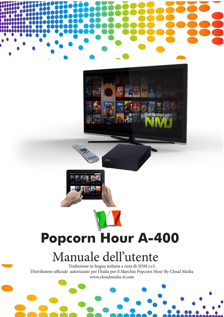 Popcorn Hour A-400 Manuale dell’utente Traduzione in lingua italiana a cura di 3DM s.r.l. Distributore ufficiale autorizzato per l’Italia per il Marchio Popcorn Hour By Cloud Media www.cloudmedia-it.com Indice 1. Introduzione.................................................................................................................3 2. Contenuto della confezione.....................................................................................3 3. Informazioni sulla sicurezza...................................................................................4 4. Specifiche Tecniche....................................................................................................5 5. Come iniziare...................................................................................................................6 5.1 Panoramica sul Popcorn Hour A-00 ............................................................................. 6 5.2 Connessione alla TV tramite HDMI................................................................................ 7 5.3 Connessione alla TV tramite cavi Composito ............................................................. 8 5.4 Connessione alla TV tramite cavi Component............................................................ 9 6. Telecomando................................................................................................................ 10 7. Introduzione al Menù Home.................................................................................... 16 8. Setup rapido guidato.................................................................................................. 17 9. Setup................................................................................................................................ 23 9.1 Preferenze............................................................................................................................24 9.2 Audio......................................................................................................................................25 9.3 Video......................................................................................................................................26 9.4 Rete (Configurazione IP).................................................................................................29 9.5 Condivisioni di rete...........................................................................................................30 9.5.1 Aggiungere una condivisione.................................................................................................31 9.5.2 Sfogliare risorse condivise......................................................................................................32 9.5.3 Modificare le risorse condivise.............................................................................................33 9.6 Controllo genitori..............................................................................................................34 9.7 BD/DVD/Audio CD.............................................................................................................35 9.8 Manutenzione.....................................................................................................................36 9.8.1 Aggiornamento Firmware.......................................................................................................37 10. Apps Market............................................................................................................... 38 10.1 Login all’ Apps Market...................................................................................................40 11. File Browser............................................................................................................... 41 11.1 Comandi e opzioni...........................................................................................................41 11.1.1 Configurazione..........................................................................................................................42 11.2 File Manager......................................................................................................................44 12. Video Meta Data........................................................................................................ 45 12.1 Pagina informazioni video...........................................................................................46 12.2 Download miniature e Meta-Data dei video...........................................................47 12.3 Modifica o aggiornamento Informazioni Video....................................................49 12.4 Download Sottotitoli......................................................................................................52 13. Ne tworked Media Jukebox.................................................................................... 54 13.1 Configurazione NMJ........................................................................................................55 13.2 Navigare in NMJ................................................................................................................60 13.3 Aggiornamento informazioni NMJ ............................................................................64 13.4 Netorked Nedia Jukebox Manager.............................................................................67 14. NMT Apps.................................................................................................................... 69 14.1 Installazione delle NMT Apps......................................................................................70 14.2 Utilizzo del Server FTP..................................................................................................74 14.3 Utilizzo del Server Samba.............................................................................................74 14.4 Utilizzo del Client Torrent ............