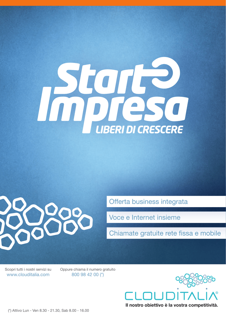 Offerta business integrata Voce e Internet insieme Chiamate gratuite rete fissa e mobile Scopri tutti i nostri servizi su Oppure chiama il numero gratuito www.clouditalia.com 800 98 42 00 (*) Il nostro obiettivo è la vostra competitività. (*) Attivo Lun - Ven 8.30 - 21.30, Sab 8.00 - 16.00 Servizi opzionali StartImpresa è la soluzione integrata di telefonia ed accesso ad Internet per Professionisti, Aziende e Pubbliche Amministrazioni che permette di collegarsi direttamente alla rete Clouditalia senza abbandonare o modificare le numerazioni e gli apparati telefonici esistenti. Linee telefoniche aggiuntive Canone Mensile / linea addizionale StartImpresa 10 euro Disponibile in due profili: StartImpresa StartImpresa Mobile 15 euro Per ciascuna linea telefonica addizionale richiesta vengono inclusi nel canone altri 3.000 min/mese di traffico telefonico verso numerazioni di rete fissa nazionale e per il profilo StartImpresa Mobile anche 500 min/mese di traffico telefonico verso la rete mobile italiana. Per connettere centralini tradizionali è possibile richiedere configurazioni miste di linee ISDN BRA e analogiche, con il solo limite di un massimo di 4 linee analogiche totali. SartImpresa Mobile Dettagli Prodotto 2 linee telefoniche (espandibili fino a 8) Numerazioni Clouditalia aggiuntive chiamate gratuite (1) verso la rete fissa e mobile italiana Contributo Attivazione Canone Mensile connessione ad Internet in ADSL fino a 20 Mb/s (o connettività simmetrica da 2 fino a 10 Mb/s). 10 euro 2 euro Contributo Attivazione Canone Mensile Traffico Italia StartImpresa 140 euro 70 euro Gratis fisso (1) StartImpresa Mobile 140 euro 85 euro Gratis fisso e mobile (1) Contributo di attivazione e canone mensile in promozione gratuita per le numerazioni richieste in fase di attivazione del servizio. Per i profili 2 e 3 linee si possono avere fino ad un massimo di 10 numerazioni Clouditalia (o 1 GNR da 10); per i profili superiori si possono avere fino ad un massimo di 20 numerazioni Clouditalia (o 2 GNR da 10 consecutivi). Il numero massimo di numerazioni indicato include le numerazioni preassegnate alle linee previste dal profilo scelto. Servizi inclusi: Accesso ad Internet Simmetrico collegamento sia di centralini tradizionali (FXS/ ISDN) che VoIP (2) (Ethernet - IPBX) fax virtuale per ricevere ed inviare fax dalla propria casella di posta elettronica indirizzo IP statico Contributo Attivazione Canone Mensile 140 euro 100 euro trasferimento di chiamata, blocco selettivo di chiamata, presentazione o restrizione del numero Contributo di attivazione gratuito se richiesto in fase di attivazione del servizio. possibilità di configurazione di numerazione con selezione passante Internet Più archi di E’ possibile richiedere, solo su rete Clouditalia, l’incremento della velocità di accesso simmetrico a passi di 2 Mb/s fino a un massimo di 10 Mb/s. Per ogni incremento di 2 Mb/s di velocità dell’accesso è previsto un canone aggiuntivo di 75 euro ed un contributo una tantum di 140 euro, gratuito in promozione se richiesto in fase di sottoscrizione dell’opzione Accesso Simmetrico. possibilità di conservare il proprio numero telefonico (Number Portability). Servizi opzionali: linee telefoniche e numerazioni aggiuntive Indirizzi IP pubblici aggiuntivi accesso ad Internet Simmetrico indirizzi Ip pubblici aggiuntivi. 1. Fino a 3.000 min/mese per linea verso rete fissa italiana e per il profilo StartImpresa Mobile anche 500 min/mese per linea verso la rete mobile italiana, utilizzabili in flessibilità tra tutte le linee telefoniche. Il traffico eccedente i minuti inclusi nell’opzione sarà fatturato alle condizioni standard del servizio (chiamate nazionali 1 eurocent/minuto, chiamate mobili TIM, Vodafone, Wind, H3G 10 eurocent/minuto senza scatto alla risposta). L’eventuale traffico telefonico non consumato durante il mese non è cumulabile a quello del mese successivo. Il listino completo per tutte le destinazioni è riportato sul sito www.clouditalia.com. Tariffazione al secondo. 2. Attualmente solo per StartImpresa Mobile Contributo Attivazione Canone Mensile Indirizzo Ip statico aggiuntivo 15 euro 5 euro Lotto di 4 indirizzi IP statici 15 euro 15 euro Lotto di 8 indirizzi IP statici 15 euro 30 euro Tutti i prezzi indicati sono IVA esclusa. 2