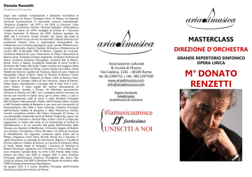 Donato Renzetti Direttore d’Orchestra Dopo aver studiato composizione e direzione d’orchestra al Conservatorio di Musica “Giuseppe Verdi” di Milano, ha ottenuto numerosi riconoscimenti in importanti concorsi internazionali: “Diapason d’argento”, nel 1975 e nel 1976, al Concorso “Gino Marinuzzi” di Sanremo; Premio “Ottorino Respighi” all’Accademia Chigiana di Siena nel 1976; medaglia di bronzo al I Concorso “Ernest Ansermet” di Ginevra nel 1978; vincitore assoluto, nel 1980, del X Concorso “Guido Cantelli” del Teatro alla Scala di Milano. Da allora la sua carriera ha alternato l’attività sinfonica con produzioni d’opera lirica e registrazioni discografiche. Ha collaborato con orchestre prestigiose, quali: London Philharmonic, London Sinfonietta, English Chamber Orchestra e Philharmonia di Londra, BRT di Bruxelles, RIAS di Berlino, Capitole de Toulouse, Orchestra National de Lyon, Filarmonica di Tokyo, Filarmonica di Buenos Aires, Orchestra di Stato Ungherese, Orchestra Sinfonica di Atene, Orchestra Sinfonica Portoghese, orchestre RAI di Milano, Roma, Torino e Napoli, Accademia Nazionale di Santa Cecilia e Orchestra del Teatro alla Scala. È stato invitato nei maggiori teatri lirici del mondo: Opéra di Parigi, Covent Garden di Londra, Grand Théâtre de Ginevra, Capitole de Toulouse, Opéra di Lyon, Opéra di Montpellier, Opera di Bonn, Opera di Monaco di Baviera, Teatro São Carlos di Lisbona, Megaron di Atene, Colòn di Buenos Aires, Lyric Opera di Chicago, Opera di San Francisco, Opera di Detroit, Dallas Opera, Metropolitan e Carnegie Hall di New York e tutti i teatri italiani. È stato ospite dei festival internazionali di Glyndebourne, Spoleto e Pesaro. Ha debuttato giovanissimo all’Arena di Verona; nel 1987, con i complessi artistici veronesi, ha tenuto una tournée in Egitto dove, per la prima volta, a Luxor è stata rappresentata Aida di Verdi. È stato Direttore Principale dell’Orchestra Internazionale d’Italia, dell’Orchestra della Toscana e dell’Orchestra stabile di Bergamo e, per nove anni consecutivi, di MacerataOpera. Nel 1994 è stato nominato Direttore Principale dell’Orchestra Stabile di Bergamo e della Filarmonica Veneta, nonché consulente artistico del Teatro Comunale di Treviso. La sua discografia comprende opere di Mozart, Čajkovskij, opere rare di Schubert, Cherubini e Simone Mayr; inoltre i dvd di La figlia del reggimento al Teatro alla Scala, di La Cenerentola al Festival di Glyndebourne e di un concerto alla guida dell’Orchestra della Toscana con Egmont di Beethoven, il Concerto doppio di Brahms con Giuliano Carmignola e Mario Brunello e la Sinfonia Scozzese di Mendelsshon. Ha registrato numerose opere liriche per la Philips, Frequence, Fonit Cetra, Ricordi, Nuova Era e Dynamic: Il signor Bruschino, La cambiale di matrimonio, Ifigenia in Tauride di Piccinni, Bianca e Falliero di Rossini, La Favorita di Donizetti, Attila di Verdi, Stabat Mater di Pergolesi. L’incisione di Manfred di Robert Schumann, registrato con l’Orchestra e il Coro della Scala, voce recitante Carmelo Bene, ha vinto il XIX Premio della Critica Italiana del Disco. Dal 2005 al maggio 2007 è stato Direttore Principale dell’Orchestra Sinfonica Portoghese del Teatro São Carlos di Lisbona. Dal 2007 è Direttore Principale ed Artistico della FORM Orchestra Filarmonica Marchigiana. Da giugno 2015 è il nuovo Direttore Principale dell’Orchestra Filarmonica Gioachino Rossini di Pesaro. MASTERCLASS DIREZIONE D’ORCHESTRA Associazione culturale & Scuola di Musica Via Casilina, 1101 - 00169 Roma tel. 06.2389732 / cell. 380.1297500 www.ariadimusica.com [email protected] Pagine Facebook: Ariadimusica Ariadimusica & Cartoons GRANDE REPERTORIO SINFONICO OPERA LIRICA M° DONATO RENZETTI “Nella mia lunga carriera, sia come Direttore d’Orchestra che come Docente dell’Accademia Musicale Pescarese nel Corso Triennale di Alto Perfezionamento in Direzione d’Orchestra, sono arrivato alla conclusione - attraverso la grande esperienza di Corsi, Stage e Concorsi - che gli allievi non hanno la possibilità di misurarsi con il grande repertorio sinfonico. Infatti, mentre ai Corsi l’organico dell’Orchestra risulta sempre minimo, ai Concorsi è richiesto ai candidati di affrontare brani per grandi organici e i direttori che arrivano alle semifinali e alle finali si ritrovano a non avere mai affrontato di persona un’Orchestra così grande. Per questo motivo ho pensato di istituire una Masterclass volta ad affrontare e studiare il repertorio dei grandi organici utilizzando un espediente del tutto nuovo e originale: l’utilizzo dell’incisione discografica. L’allievo studierà la partitura indicata nel programma dirigendo, sotto la mia attenta supervisione, l’organico “virtuale”. Simulare la meravigliosa esperienza di dirigere orchestre di fama mondiale con le indicazioni tecniche sul gesto e l’interpretazione in tempo reale è un’idea del tutto personale e unica, mai sperimentata prima d’ora, che mi stimola e affascina moltissimo. Per quanto riguarda la partitura d’opera, ovviamente non vi sarà l’ausilio dell’incisione discografica ma unicamente le mie indicazioni sulla tradizione esecutiva dei grandi direttori del passato (arcate, legature, cadenze, respiri dei cantanti, ecc.) cosicché, al termine del corso, gli allievi avranno di quella partitura la più completa conoscenza possibile. La Masterclass prevede 8 giorni di corso suddivisi in 2 sessioni, a giugno e a settembre, come specificato nel programma. Vi aspetto per sperimentare insieme questa singolare Masterclass sul grande repertorio sinfonico e per approfondire tecnica e gestualità per la direzione d’orchestra dell’opera lirica”. PROGRAMMA o grande repertorio sinfonico Igor’ Stravinskij “Le Sacre du Printemps” edizione discografica a scelta del candidato o opera lirica Giacomo Puccini “La Bohème” PRIMA SESSIONE GIUGNO 2016 da giovedì 9 a domenica 12 g