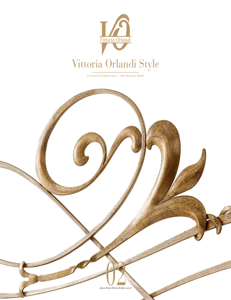 Vittoria Orlandi Style Le nuove Case Romantiche • New Romantic Homes Indice · Index L’AZIENDA · THE FACTORY PERLA PAG. CARLOTTA 06 PAG. PAG. 04 PERLA 50 PAG. CARLOTTA 12 PAG. IRIS 58 PAG. HARMONY 18 PAG. MITIA 60 VENUS PAG. PAG. 22 MITIA PAG. 28 ARTÙ PAG. 64 PARIS PAG. 68 MELODY 34 PAG. 74 TALIA PAG. MARGARET 40 PAG. DENISE 78 PAG. 46 CAMPIONARIO FINITURE · FINISH SAMPLES PAG. 83 Sofisticata, elegante, con un carattere spiccatamente raffinato. Nasce la nuova collezione notte firmata Vittoria Orlandi, una fantasia progettuale di letti, comò, comodini, armadi e quant’altro riguardante l’arredamento della camera da letto. L’esperienza pluriennale della lavorazione del ferro battuto e i consensi ottenuti su vasta scala nazionale e internazionale, hanno guidato l’Azienda Vittoria Orlandi verso questa scelta produttiva, che contempla un significativo ampliamento della collezione notte, con un’intera gamma di complementi d’arredo. Protagonista in primo piano ancora il ferro battuto, con le sue affascinanti caratteristiche di duttilità e armonia visiva. Al ferro battuto si accompagnano i materiali della tradizione ebanistica: essenze finemente cesellate, cristalli luminosi, tessuti esclusivi da arredamento. Il risultato è un ambiente completo che risponde alle nuove richieste arredative di stile e fashion. Sophisticated, elegant and with an unquestionably refined character. The new Vittoria Orlandi collection has arrived, a creative anthology of beds, dressers, night tables, wardrobes and much more in bedroom furnishing. Many years’ experience in wrought iron working and wide scale recognition gained at national and international level have led Azienda Vittoria Orlandi to adopt this production strategy, which contemplates a considerable extension of the night collection with a full range of furnishing accessories. Wrought iron continues to take front stage, with its captivating flexibility and visual synchronicity. Accompanying the wrought iron are traditional carpentry materials: finely carved woods, sparkling crystals, exclusive upholstery fabrics. The result is a complete room that responds to the latest furnishing demand in terms of style and fashion. Nuove collezioni e nuove tendenze per nuovi stili di vita. Il mondo dell’arredamento cambia continuamente per assecondare i mutamenti sociali ed estetici. In risposta alle nuove richieste di mercato, le collezioni Vittoria Orlandi si rinnovano ampliando i progetti d’arredo, inventando soluzioni all’avanguardia. E’ in questo spirito di attualizzazione che nasce la nuova linea dedicate alla zona notte presentata in questo book, primo di una serie prevista per illustrare le numerose collezioni Vittoria Orlandi. Ogni rappresentazione grafica è la realizzazione di un progetto esclusivo, che mira al raggiungimento di uno stile sontuoso e sempre originale. New collections, new trends… new lifestyles. The world of furnishing changes constantly to keep up with social and aesthetic changes. In response to the new market demand, Vittoria Orlandi collections are reviewed – expanding overall designs and inventing state-of-the-art solutions. It is in this spirit of modernisation that the new night range is presented in this book, the first of a series planned to illustrate the many Vittoria Orlandi collections. Every graphic display is the result of an exclusive design that targets a sumptuous, everoriginal style. 5 Perla PERLA PAG. 06 - 11 • Letto mod. Perla, finitura foglia argento decapé • Comò mod. Romina, finitura bianco antico con decoro in foglia argento • Comodini mod. Romina, finitura bianco antico con decoro in foglia argento • Specchiera mod. Zefiro, finitura foglia argento decapé, specchio molato • Poltrona mod. Pamela, finitura foglia argento patinato, imbottitura in pelle panna con bottoni Swarovski • Piantana mod. Zefiro, finitura foglia argento decapè, cappello in tessuto F435/07 con bordo in pelliccia eco bianca • Abat jour mod. Zefiro, finitura foglia argento decapè, cappello in tessuto F435/07 con bordo in pelliccia eco bianca • Perla bed, silver leaf pickled finish • Romina dresser, antique white finish with silver leaf decoration • Romina night tables, antique white finish with silver leaf decoration • Zefiro mirror, silver leaf pickled finish, ground mirror • Pamela armchair, silver leaf glazed finish, cream leather upholstery with Swarovski buttons • Zefiro floor lamp, silver leaf pickled finish, fabric lampshade F435/07 with white faux fur trim • Zefiro table lamp, silver leaf pickled finish, fabric lampshade F435/07 with white faux fur trim 7 9 11 Perla PERLA PAG. 12 - 17 • Letto mod. Perla, finitura bianco perlato con sfumature oro • Comò mod. Scilla, finitura rovere bianco con venature foglia oro, frontale cassetti rovere bianco con glitter oro. Parti in ferro foglia oro perlato • Comodini mod. Scilla, finitura rovere bianco con venature foglia oro, frontale cassetti rovere bianco con glitter oro. Parti in ferro oro perlato • Specchiera mod. Scilla, finitura bianco antico, specchio molato • Poltrona mod. Pamela, finitura bianco perlato, imbottitura in pelle bianca • Pouff mod. Pamela, finitura bianco perlato, imbottitura in pelle bianca • Abat jour mod. Jasmine, finitura bianco antico, cappello in tessuto G.006 con bordo in pelliccia eco marrone • Perla bed, white pearl finish with gold accents • Scilla dresser, white oak finish with gold leaf veins, white oak drawer fronts with gold glitter finish. Iron details in pearl gold leaf • Scilla night tables, white oak finish with gold leaf veins, white oak drawer fronts with gold glitter finish. Iron details in pearl gold leaf • Scilla mirror, antique white finish, ground mirror • Pamela armchair, white pearl finish, white leather upholstery • Pamela pouffe, white pearl finish, white leather upholstery • Jasmine table lamp, antique white finish, fabric lampshade G.006 with brown faux fur 