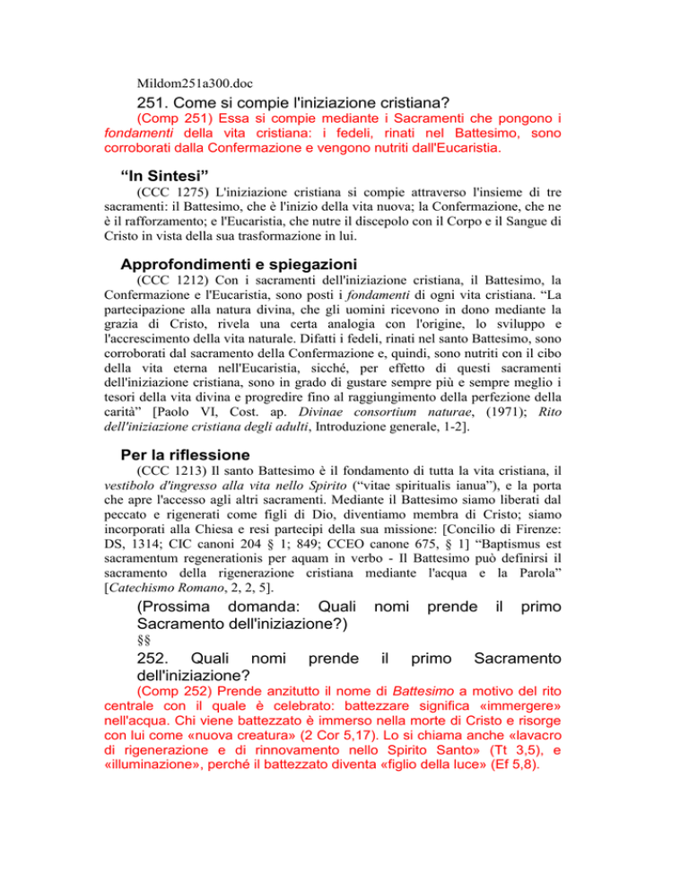 Mildom251a300.doc 251. Come si compie l'iniziazione cristiana? (Comp 251) Essa si compie mediante i Sacramenti che pongono i fondamenti della vita cristiana: i fedeli, rinati nel Battesimo, sono corroborati dalla Confermazione e vengono nutriti dall'Eucaristia. “In Sintesi” (CCC 1275) L'iniziazione cristiana si compie attraverso l'insieme di tre sacramenti: il Battesimo, che è l'inizio della vita nuova; la Confermazione, che ne è il rafforzamento; e l'Eucaristia, che nutre il discepolo con il Corpo e il Sangue di Cristo in vista della sua trasformazione in lui. Approfondimenti e spiegazioni (CCC 1212) Con i sacramenti dell'iniziazione cristiana, il Battesimo, la Confermazione e l'Eucaristia, sono posti i fondamenti di ogni vita cristiana. “La partecipazione alla natura divina, che gli uomini ricevono in dono mediante la grazia di Cristo, rivela una certa analogia con l'origine, lo sviluppo e l'accrescimento della vita naturale. Difatti i fedeli, rinati nel santo Battesimo, sono corroborati dal sacramento della Confermazione e, quindi, sono nutriti con il cibo della vita eterna nell'Eucaristia, sicché, per effetto di questi sacramenti dell'iniziazione cristiana, sono in grado di gustare sempre più e sempre meglio i tesori della vita divina e progredire fino al raggiungimento della perfezione della carità” [Paolo VI, Cost. ap. Divinae consortium naturae, (1971); Rito dell'iniziazione cristiana degli adulti, Introduzione generale, 1-2]. Per la riflessione (CCC 1213) Il santo Battesimo è il fondamento di tutta la vita cristiana, il vestibolo d'ingresso alla vita nello Spirito (“vitae spiritualis ianua”), e la porta che apre l'accesso agli altri sacramenti. Mediante il Battesimo siamo liberati dal peccato e rigenerati come figli di Dio, diventiamo membra di Cristo; siamo incorporati alla Chiesa e resi partecipi della sua missione: [Concilio di Firenze: DS, 1314; CIC canoni 204 § 1; 849; CCEO canone 675, § 1] “Baptismus est sacramentum regenerationis per aquam in verbo - Il Battesimo può definirsi il sacramento della rigenerazione cristiana mediante l'acqua e la Parola” [Catechismo Romano, 2, 2, 5]. (Prossima domanda: Quali Sacramento dell'iniziazione?) nomi prende il primo §§ 252. Quali nomi dell'iniziazione? prende il primo Sacramento (Comp 252) Prende anzitutto il nome di Battesimo a motivo del rito centrale con il quale è celebrato: battezzare significa «immergere» nell'acqua. Chi viene battezzato è immerso nella morte di Cristo e risorge con lui come «nuova creatura» (2 Cor 5,17). Lo si chiama anche «lavacro di rigenerazione e di rinnovamento nello Spirito Santo» (Tt 3,5), e «illuminazione», perché il battezzato diventa «figlio della luce» (Ef 5,8). “In Sintesi” (CCC 1277) Il Battesimo costituisce la nascita alla vita nuova in Cristo. Secondo la volontà del Signore esso è necessario per la salvezza, come la Chiesa stessa, nella quale il Battesimo introduce. Approfondimenti e spiegazioni (CCC 1214) Lo si chiama Battesimo dal rito centrale con il quale è compiuto: battezzare (baptizein in greco) significa “tuffare”, “immergere”; l'“immersione” nell'acqua è simbolo del seppellimento del catecumeno nella morte di Cristo, dalla quale risorge con lui [Rm 6,3-4; Col 2,12 ], quale “nuova creatura” (2Cor 5,17; Gal 6,15). (CCC 1215) Questo sacramento è anche chiamato il “lavacro di rigenerazione e di rinnovamento nello Spirito Santo” (Tt 3,5), poiché significa e realizza quella nascita dall'acqua e dallo Spirito senza la quale nessuno “può entrare nel Regno di Dio” (Gv 3,5). (CCC 628) Il Battesimo, il cui segno originale e plenario è l'immersione, significa efficacemente la discesa nella tomba del cristiano che muore al peccato con Cristo in vista di una vita nuova: “Per mezzo del Battesimo siamo dunque stati sepolti insieme a lui nella morte, perché come Cristo fu risuscitato dai morti per mezzo della gloria del Padre, così anche noi possiamo camminare in una vita nuova” (Rm 6,4; cf. Col 2,12; Ef 5,26). Per la riflessione (CCC 1216) “Questo lavacro è chiamato illuminazione, perché coloro che ricevono questo insegnamento [catechistico] vengono illuminati nella mente” [San Giustino, Apologia, 1, 61: PG 6, 421]. Poiché nel Battesimo ha ricevuto il Verbo, “la luce vera che illumina ogni uomo” (Gv 1,9), il battezzato, dopo essere stato “illuminato” (Eb 10,32) è divenuto “figlio della luce” (1Ts 5,5) e “luce” egli stesso ( Ef 5,8): Il Battesimo “è il più bello e magnifico dei doni di Dio. […] Lo chiamiamo dono, grazia, unzione, illuminazione, veste d'immortalità, lavacro di rigenerazione, sigillo, e tutto ciò che vi è di più prezioso. Dono, poiché è dato a coloro che non portano nulla; grazia, perché viene elargito anche ai colpevoli; Battesimo, perché il peccato viene seppellito nell'acqua; unzione, perché è sacro e regale (tali sono coloro che vengono unti); illuminazione, perché è luce sfolgorante; veste, perché copre la nostra vergogna; lavacro, perché ci lava; sigillo, perché ci custodisce ed è il segno della signoria di Dio” [San Gregorio Nazianzeno, Oratio, 40, 3-4: PG 36, 361-364]. (Prossima domanda: Come è prefigurato il Battesimo nell' Antica Alleanza?) §§ 253. Come è prefigurato il Battesimo nell' Antica Alleanza? (Comp 253) Nell'Antica Alleanza si trovano varie prefigurazioni del Battesimo: l'acqua, fonte di vita e di morte; l'arca di Noè, che salva per mezzo dell'acqua; il passaggio del Mar Rosso, che libera Israele dalla schiavitù egiziana; la traversata del Giordano, che introduce Israele nella terra promessa, immagine della vita eterna. “In Sintesi” (CCC 1276) “Andate dunque e ammaestrate tutte le nazioni, battezzandole nel nome del Padre e del Figlio e dello Spirito Santo, insegnando loro ad osservare tutto ciò che vi ho comandato” (Mt 28,19-20). Approfondimenti e spiegazioni (CCC 1217) Nella liturgia della Notte pasquale, in occasione della be