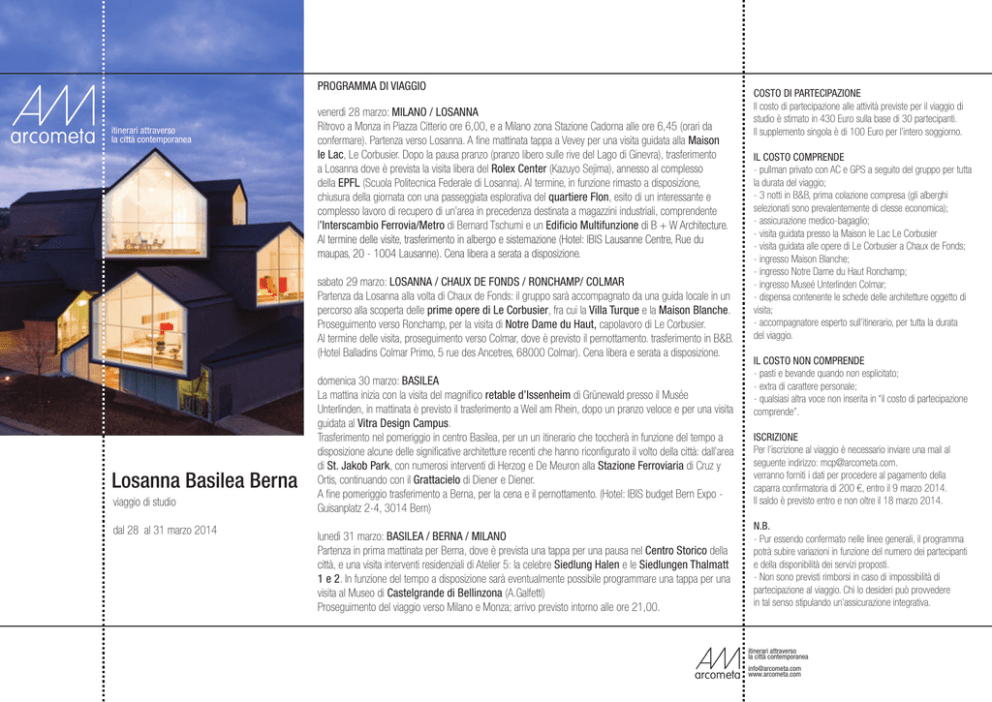 PROGRAMMA DI VIAGGIO itinerari attraverso la città contemporanea venerdì 28 marzo: MILANO / LOSANNA Ritrovo a Monza in Piazza Citterio ore 6,00, e a Milano zona Stazione Cadorna alle ore 6,45 (orari da confermare). Partenza verso Losanna. A fine mattinata tappa a Vevey per una visita guidata alla Maison le Lac, Le Corbusier. Dopo la pausa pranzo (pranzo libero sulle rive del Lago di Ginevra), trasferimento a Losanna dove è prevista la visita libera del Rolex Center (Kazuyo Sejima), annesso al complesso della EPFL (Scuola Politecnica Federale di Losanna). Al termine, in funzione rimasto a disposizione, chiusura della giornata con una passeggiata esplorativa del quartiere Flon, esito di un interessante e complesso lavoro di recupero di un’area in precedenza destinata a magazzini industriali, comprendente l’Interscambio Ferrovia/Metro di Bernard Tschumi e un Edificio Multifunzione di B + W Architecture. Al termine delle visite, trasferimento in albergo e sistemazione (Hotel: IBIS Lausanne Centre, Rue du maupas, 20 - 1004 Lausanne). Cena libera a serata a disposizione. sabato 29 marzo: LOSANNA / CHAUX DE FONDS / RONCHAMP/ COLMAR Partenza da Losanna alla volta di Chaux de Fonds: il gruppo sarà accompagnato da una guida locale in un percorso alla scoperta delle prime opere di Le Corbusier, fra cui la Villa Turque e la Maison Blanche. Proseguimento verso Ronchamp, per la visita di Notre Dame du Haut, capolavoro di Le Corbusier. Al termine delle visita, proseguimento verso Colmar, dove è previsto il pernottamento. trasferimento in B&B. (Hotel Balladins Colmar Primo, 5 rue des Ancetres, 68000 Colmar). Cena libera e serata a disposizione. Losanna Basilea Berna viaggio di studio dal 28 al 31 marzo 2014 domenica 30 marzo: BASILEA La mattina inizia con la visita del magnifico retable d’Issenheim di Grünewald presso il Musée Unterlinden, in mattinata è previsto il trasferimento a Weil am Rhein, dopo un pranzo veloce e per una visita guidata al Vitra Design Campus. Trasferimento nel pomeriggio in centro Basilea, per un un itinerario che toccherà in funzione del tempo a disposizione alcune delle significative architetture recenti che hanno riconfigurato il volto della città: dall’area di St. Jakob Park, con numerosi interventi di Herzog e De Meuron alla Stazione Ferroviaria di Cruz y Ortis, continuando con il Grattacielo di Diener e Diener. A fine pomeriggio trasferimento a Berna, per la cena e il pernottamento. (Hotel: IBIS budget Bern Expo Guisanplatz 2-4, 3014 Bern) lunedì 31 marzo: BASILEA / BERNA / MILANO Partenza in prima mattinata per Berna, dove è prevista una tappa per una pausa nel Centro Storico della città, e una visita interventi residenziali di Atelier 5: la celebre Siedlung Halen e le Siedlungen Thalmatt 1 e 2. In funzione del tempo a disposizione sarà eventualmente possibile programmare una tappa per una visita al Museo di Castelgrande di Bellinzona (A.Galfetti) Proseguimento del viaggio verso Milano e Monza; arrivo previsto intorno alle ore 21,00. COSTO DI PARTECIPAZIONE Il costo di partecipazione alle attività previste per il viaggio di studio è stimato in 430 Euro sulla base di 30 partecipanti. Il supplemento singola è di 100 Euro per l’intero soggiorno. IL COSTO COMPRENDE - pullman privato con AC e GPS a seguito del gruppo per tutta la durata del viaggio; - 3 notti in B&B, prima colazione compresa (gli alberghi selezionati sono prevalentemente di clesse economica); - assicurazione medico-bagaglio; - visita guidata presso la Maison le Lac Le Corbusier - visita guidata alle opere di Le Corbusier a Chaux de Fonds; - ingresso Maison Blanche; - ingresso Notre Dame du Haut Ronchamp; - ingresso Museé Unterlinden Colmar; - dispensa contenente le schede delle architetture oggetto di visita; - accompagnatore esperto sull’itinerario, per tutta la durata del viaggio. IL COSTO NON COMPRENDE - pasti e bevande quando non esplicitato; - extra di carattere personale; - qualsiasi altra voce non inserita in “il costo di partecipazione comprende”. ISCRIZIONE Per l’iscrizione al viaggio è necessario inviare una mail al seguente indirizzo: [email protected]. verranno forniti i dati per procedere al pagamento della caparra confirmatoria di 200 €, entro il 9 marzo 2014. Il saldo è previsto entro e non oltre il 18 marzo 2014. N.B. - Pur essendo confermato nelle linee generali, il programma potrà subire variazioni in funzione del numero dei partecipanti e della disponibilità dei servizi proposti. - Non sono previsti rimborsi in caso di impossibilità di partecipazione al viaggio. Chi lo desideri può provvedere in tal senso stipulando un’assicurazione integrativa. itinerari attraverso la città contemporanea [email protected] www.arcometa.com