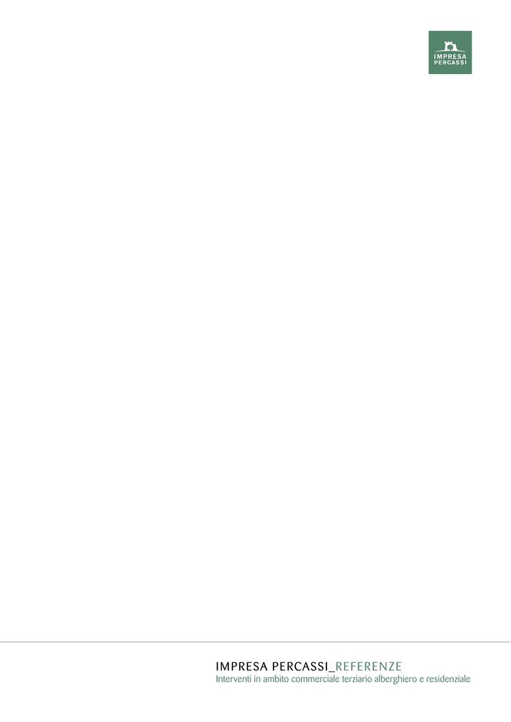 I M PRESA PE RCASSI_RE FE RE NZE Interventi in ambito commerciale terziario alberghiero e residenziale I M PRESA PE RCASSI_RE FE RE NZE Interventi in ambito commerciale terziario Impresa Percassi, società del Gruppo Immobiliare Percassi, concentra oggi esperienze e professionalità maturate in decenni di storia nel settore dell’edilizia civile e opera nelle nuove realizzazioni di natura residenziale, commerciale e direzionale, e nelle ristrutturazioni e restauri di pregio, sia per iniziative immobiliari sviluppate dal gruppo, sia per importanti clienti di fama nazionale ed internazionale. Oggi la struttura imprenditoriale di Impresa Percassi si pone a livello delle più qualificate imprese di settore, avendo realizzato e continuando a realizzare importanti opere nel campo dell’edilizia civile ed industriale. Le linee guida dell’Impresa Percassi mirano a garantire affidabilità, qualità ed efficienza alle proprie costuzioni. Sul caposaldo di una storia eccellente, simbolo di imprenditoria e di passione, l’attività dell’Impresa Percassi rappresenta una realtà solida, competitiva e altamente affidabile nel mercato di riferimento in cui si contraddistingue per la tempestività di realizzazione, per l’attenzione ai dettagli e alla piena soddisfazione della propria clientela. I M PRESA PE RCASSI_RE FE RE NZE COMMITTENTE Jolly Hotel spa milano LOCALITA’ DESTINAZIONE ANNO INTERVENTO DURATA DEI LAVORI DESCRIZIONE INTERVENTO Milano – Largo Augusto, 10 Hotel 2007 mesi 6 (sei) Primo lotto della ristrutturazione integrale del JOLLY HOTEL PRESIDENT n° 120 camere e spazi comuni ALBE RG H I E RO Interventi in ambito commerciale terziario I M PRESA PE RCASSI_RE FE RE NZE Interventi in ambito commerciale terziario COMMITTENTE GRANDE Jolly spa MILANO LOCALITA’ DESTINAZIONE ANNO INTERVENTO DURATA DEI LAVORI DESCRIZIONE INTERVENTO Milano – P.za della Rupubblica, 2 ALBE RG H I E RO Hotel 2008 mesi 6 (sei) Ristrutturazione integrale dell’Hotel NH JOLLY TOURING n° 100 camere e spazi comuni I M PRESA PE RCASSI_RE FE RE NZE COMMITTENTE FINSER spa ORIO AL SERIO LOCALITA’ DESTINAZIONE ANNO INTERVENTO DURATA DEI LAVORI SUPERFICIE DESCRIZIONE INTERVENTO Orio al Serio (Bg) – Via Portico Hotel 2008 mesi 18 (diciotto) 7000 mq. Nuova costruzione di struttura alberghiera (NH ORIO AL SERIO) integrata nel “Centro Commerciale Orio Center” realizzata per conto di società facente capo al Gruppo Percassi. N° 140 camere e spazi comuni. ALBE RG H I E RO Interventi in ambito commerciale terziario I M PRESA PE RCASSI_RE FE RE NZE COMMITTENTE NH TORTONA SRL MILANO LOCALITA’ DESTINAZIONE ANNO INTERVENTO DURATA DEI LAVORI SUPERFICIE DESCRIZIONE INTERVENTO Milano – Via Tortona, 35 Hotel 2010 mesi 3 (tre) 1.500 mq e spazi comuni Ristrutturazione parziale di spazi da adibire a Centro Benessere e SPA. ALBE RG H I E RO Interventi in ambito commerciale terziario I M PRESA PE RCASSI_RE FE RE NZE COMMITTENTE STARSHOTELS SPA FIRENZE LOCALITA’ DESTINAZIONE ANNO INTERVENTO DURATA DEI LAVORI SUPERFICIE DESCRIZIONE INTERVENTO Milano – Via Doria, 3 Hotel 2011 mesi 9 (nove) 7500 mq n° 152 camere e spazi comuni Ristrutturazione integrale Hotel E.C.H.O. (ex Hotel Splendido) ALBE RG H I E RO Interventi in ambito commerciale terziario I M PRESA PE RCASSI_RE FE RE NZE COMMITTENTE STARSHOTELS SPA FIRENZE LOCALITA’ DESTINAZIONE ANNO INTERVENTO DURATA DEI LAVORI SUPERFICIE DESCRIZIONE INTERVENTO Milano – Via Doria, 3 Hotel 2011 mesi 9 (nove) 7500 mq n° 152 camere e spazi comuni Ristrutturazione integrale Hotel E.C.H.O. (ex Hotel Splendido) ALBE RG H I E RO Interventi in ambito commerciale terziario I M PRESA PE RCASSI_RE FE RE NZE Interventi in ambito commerciale terziario COMMITTENTE cai - sezione di bergamo PROGETTISTA LOCALITA’ DESTINAZIONE ANNO INTERVENTO DESCRIZIONE INTERVENTO PBEB Architetti - Arch. P. Belloni e E. Brazis - (Bg) Val Bondione (Bg) Hotel/Servizi 2012/2013 Rifunzionalizzazione dello storico Rifugio Curò in Ostello Giovanile in quota e “Centro didattico naturalistico del Barbellino”. Realizzata nell’ambito del complesso rifugistico Antonio Curò, collocato a 1.893m slm in affaccio sul bacino artificiale del Barbellino presso la sorgente del fiume Serio. ALBE RG H I E RO RIFUGIO CURO’ I M PRESA PE RCASSI_RE FE RE NZE Interventi in ambito commerciale terziario COMMITTENTE UNA HOTELS & RESORTS - UNA S.p.A. PROGETTISTA LOCALITA’ DESTINAZIONE ANNO INTERVENTO DURATA DEI LAVORI DESCRIZIONE INTERVENTO GPA INGEGNERIA S.r.l. - S. Giovanni V.no (AR) Milano – Via Fabio Filzi, 25/b Hotel 2013 mesi 11 (undici) Lavori di restayling e ammodernamento camere, servizi e spazi comuni dell’Hotel Century. Adeguamento edificio alla normativa antincendio. ALBE RG H I E RO UNA HOTEL CENTURY I M PRESA PE RCASSI_RE FE RE NZE COMMITTENTE l’innominato s.p.a. PROGETTISTA LOCALITA’ DESTINAZIONE ANNO INTERVENTO DESCRIZIONE INTERVENTO Arch. Mendini Alessandro Milano – Via Montenapoleone Commerciale 1997 Opere di risanamento conservativo con interventi strutturali in fabbricato ad uso commerciale. COMMITTENTE BUENOS AIRES 2000 S.R.L. LOCALITA’ DESTINAZIONE ANNO INTERVENTO DESCRIZIONE INTERVENTO Milano – Corso Buenos Aires Commerciale 1999/2000 Opere di risanamento conservativo e costruzionedi autorimesse interrate in fabbricato ad uso commerciale/direzionale disposto su sei livelli f.t. con superficie complessiva di 4500 mq. COM M E RCIALE Interventi in ambito commerciale terziario I M PRESA PE RCASSI_RE FE RE NZE COMMITTENTE oysho PROGETTISTA LOCALITA’ DESTINAZIONE ANNO INTERVENTO DESCRIZIONE INTERVENTO Studio Archeias - Limito di Pioltello (MI) Orio al Serio (Bg) - Milano, Piazza Dante Commerciale 1999/2000 Allestimento nuovo store Oysho all’interno del Centro Commerciale OrioCenter (Bg) e in Piazza Dante a Milano. COMMITTENTE ZARA ITALIA S.R.L. PROGETTISTA LOCALITA’ DESTINAZIONE ANNO INTERVENTO DESCRIZIONE INTERVENTO Arch. Mendini Alessandro Milano – Corso V. Emanuele Commerciale 200
